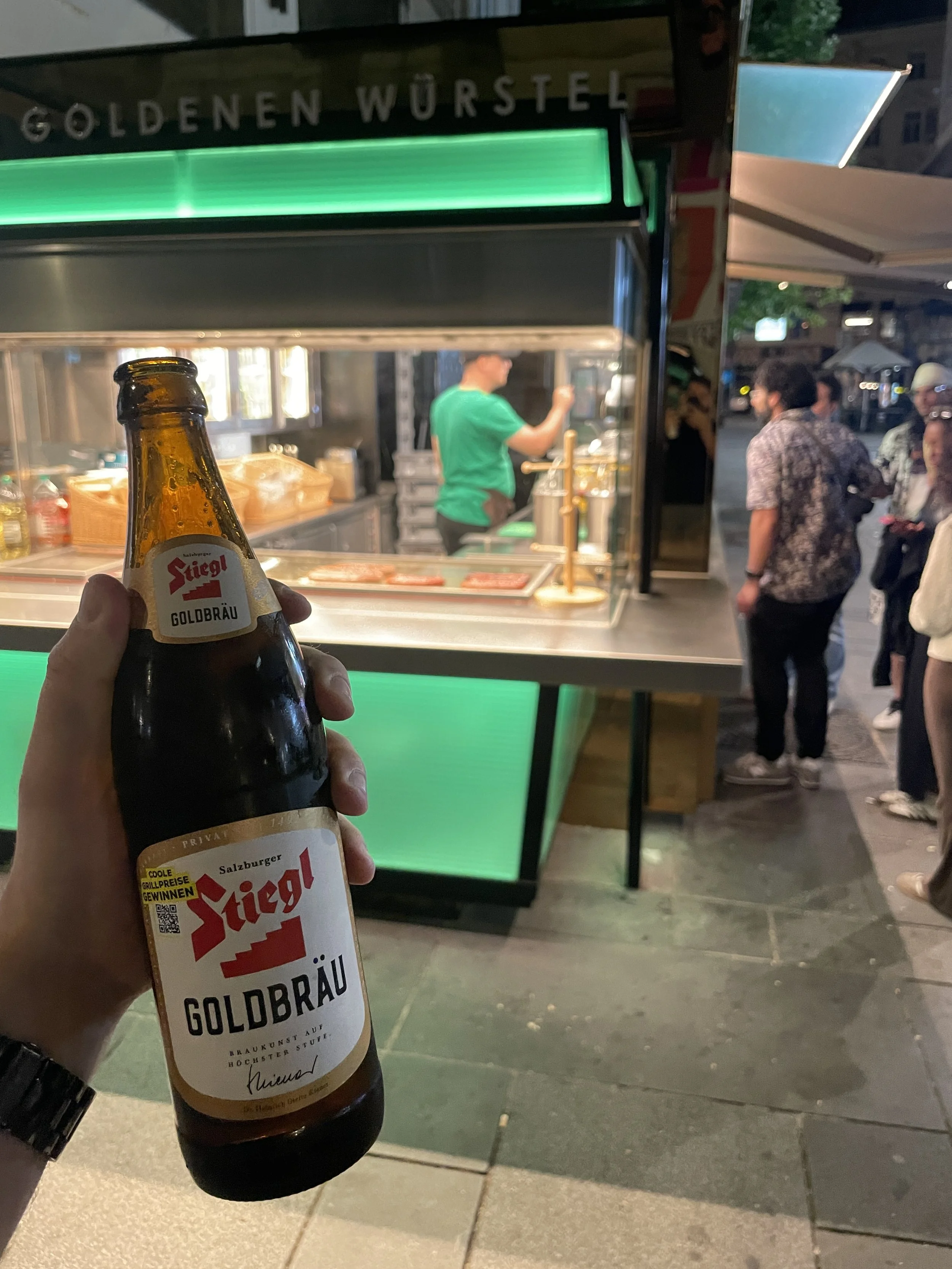 We eventually looped back to Stephansplatz, where we stumbled upon the classic Viennese Würstelstände: street-side sausage kiosks offering hot Vienna sausages and gloriously cold beer to enjoy right there on the street. For four Canadians, the simple freedom of drinking a beer while wandering around the city still feels like a novelty, and the sausages were every bit as good as their reputation.