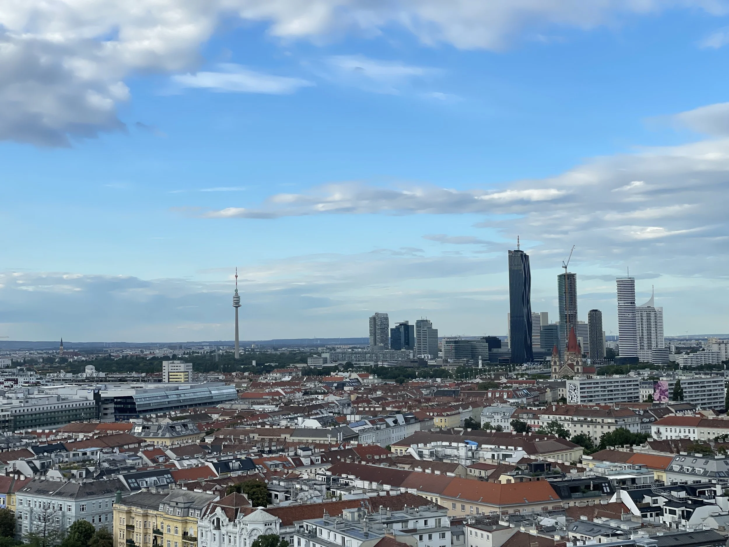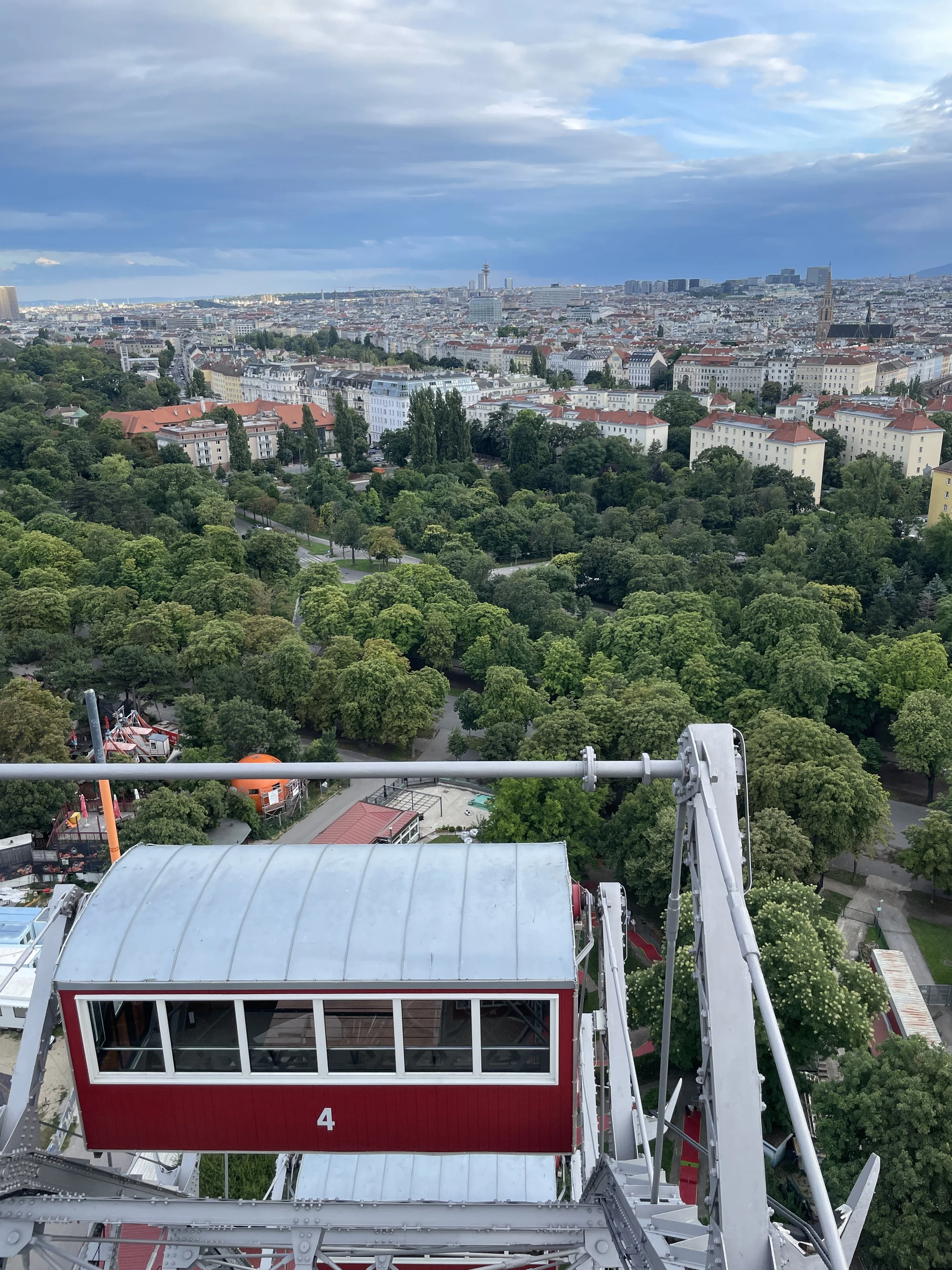 Riding it feels different from modern Ferris wheels. The gondolas are old-fashioned wooden cabins, slow and creaky in the most charming way. As it rises above the Prater, the city opens up in wide, calm layers — the Danube, the old town spires, and the soft yellow outline of Schönbrunn far in the distance - mixed with modern skyscrapers.