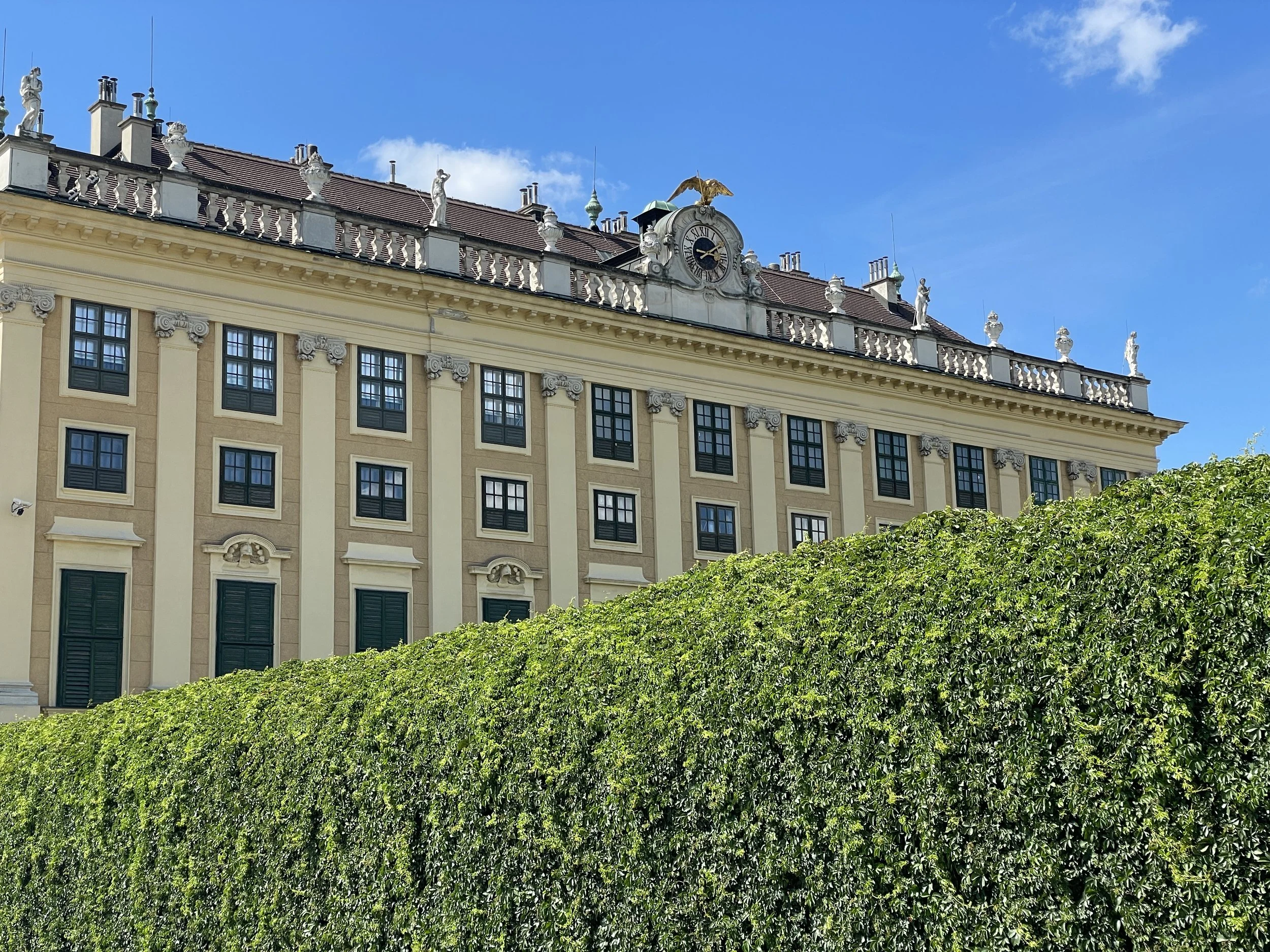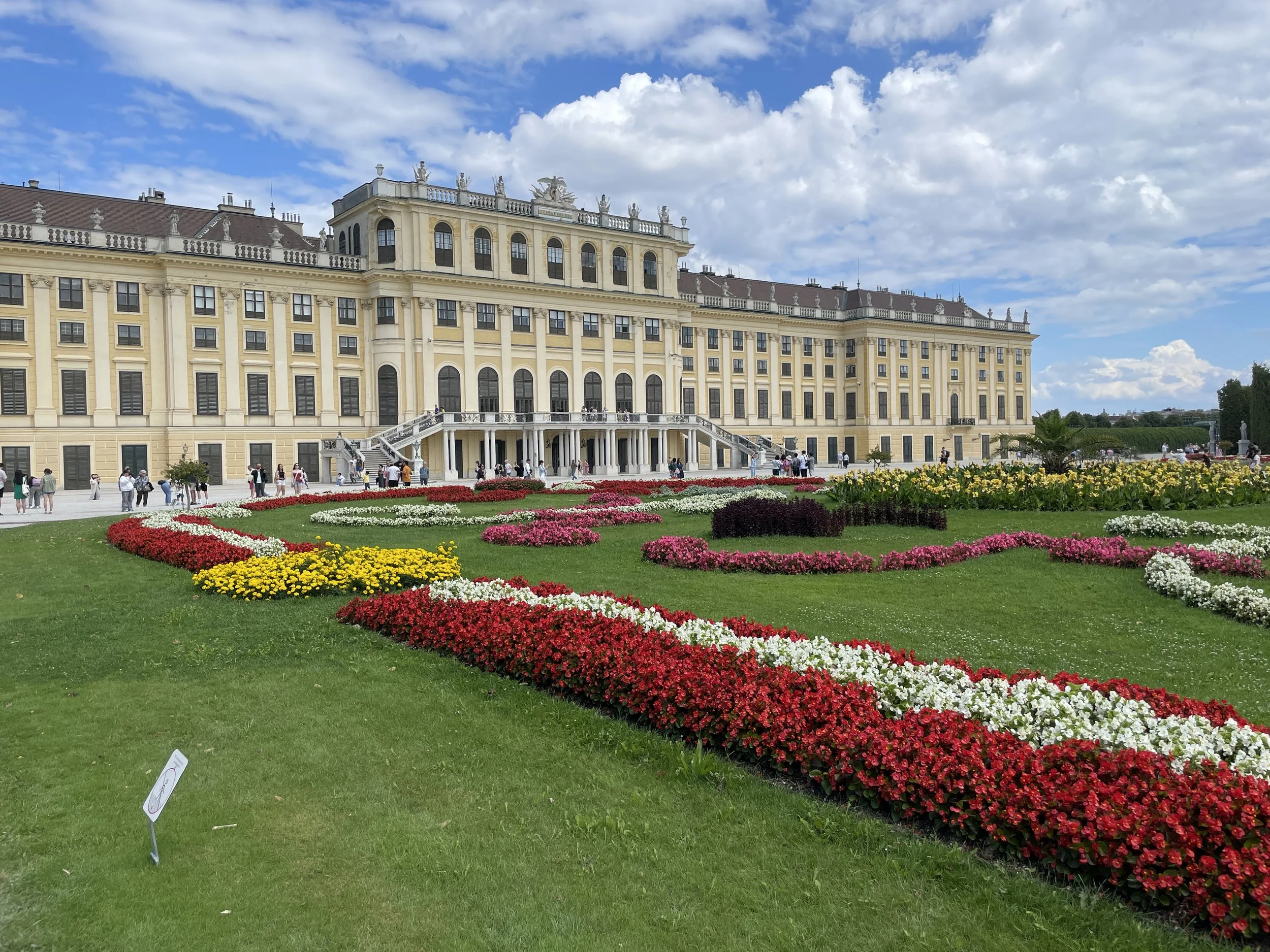 We’d been impressed by the Hofburg, but stepping off the train at Schönbrunn felt entirely different. As soon as we walked into the gardens, we were struck by the scale and symmetry of the place. The palace stretched out in a long, golden façade, and behind it unfolded a vast series of manicured lanes, fountains, hedges, and open lawns that seemed to go on forever. Even with crowds around us, the grounds had a calm, almost regal air.
