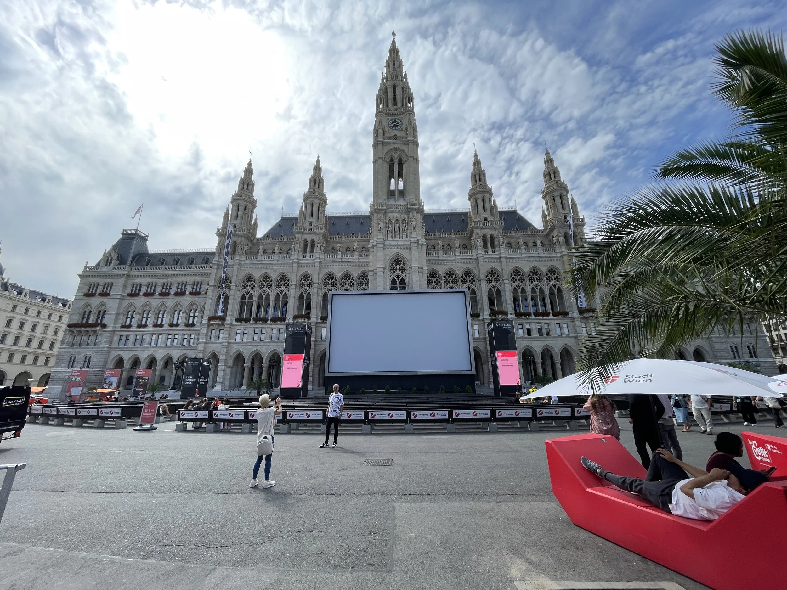 When we arrived, the square had transformed into a lively scene thanks to the Vienna Film Festival, which takes over Rathausplatz every summer. Giant screens were set up in front of the Rathaus, rows of seats stretched out across the square, and the entire place buzzed with the energy of people gathering to watch concerts, classical performances, and films under the open sky.