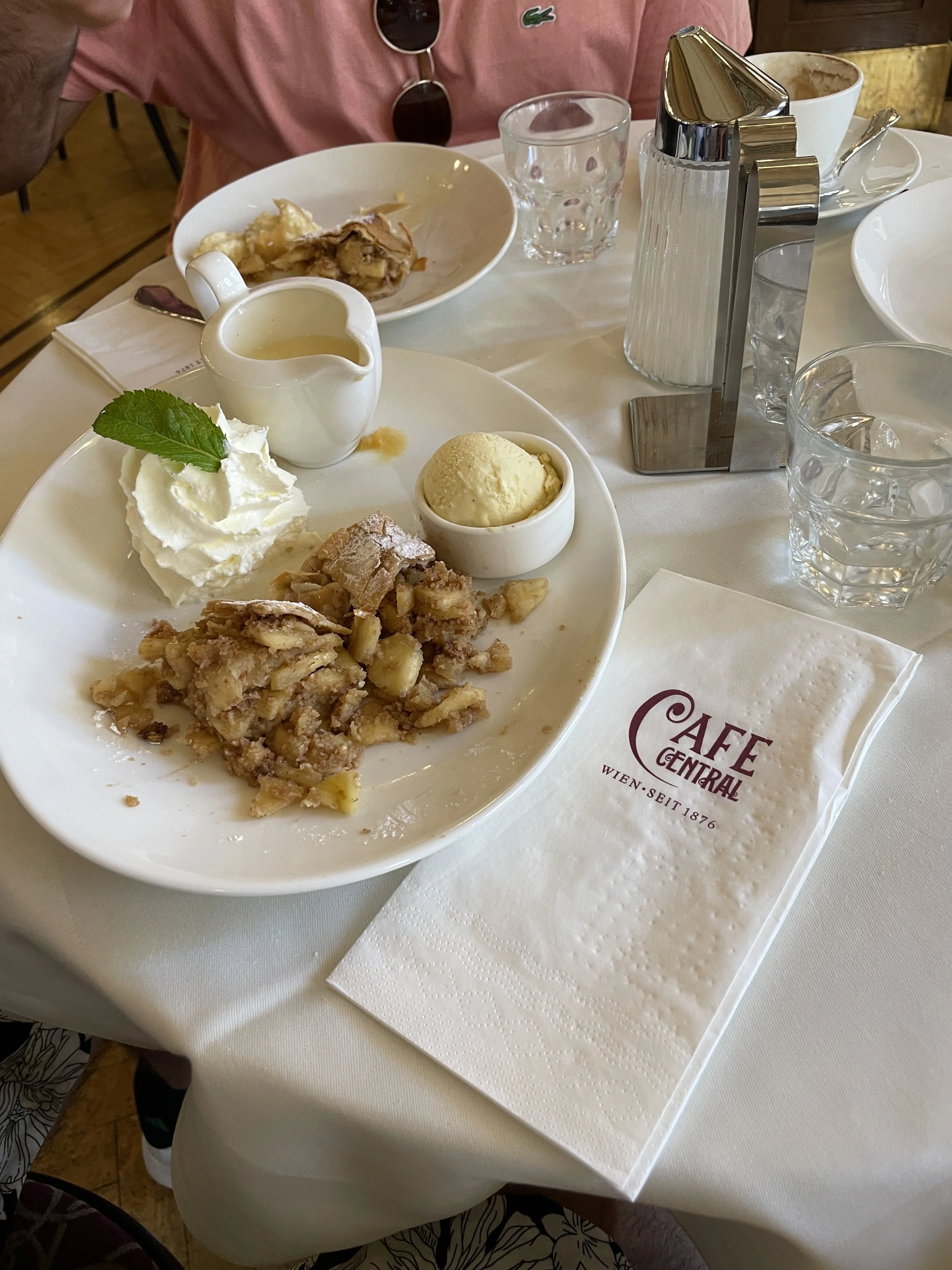 As we arrived at the cafe, we joined a line spilling out into the street. After some time, we were ushered inside into the historic, elegant space. High ceilings adorned with ornate plasterwork, large marble columns and tall windows letting in an abundance of natural light. We settled at a small table and savored classic Viennese coffee alongside apple strudel. We were surrounded by history, and breakfast was fantastic.