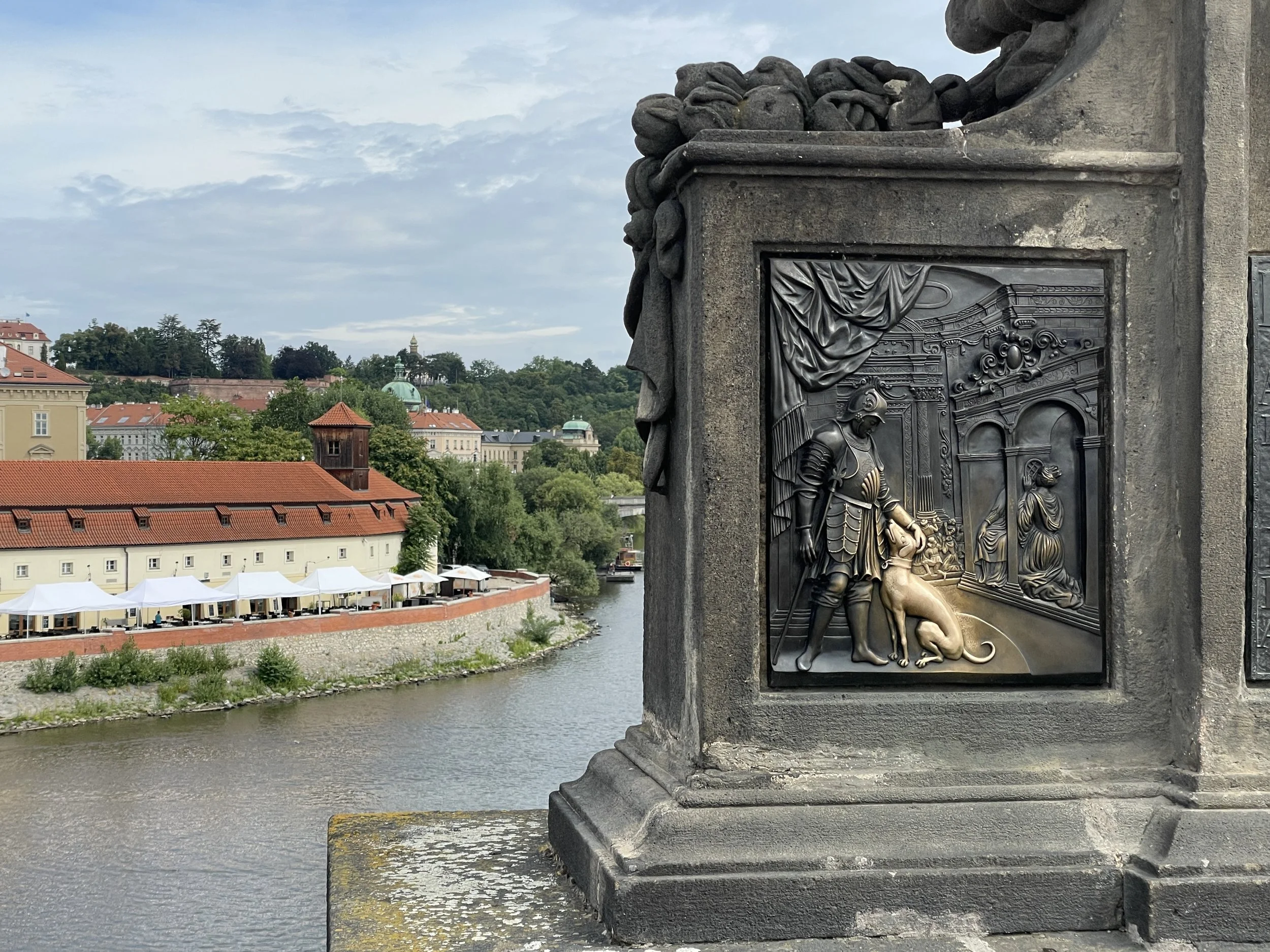 Polished from years of visitors rubbing it for good luck, a small bronze dog shines through the darkened relief. Although there are 30 statutes along the bridge and crowds of tourists, this one dog seemed to garner the most attention.
