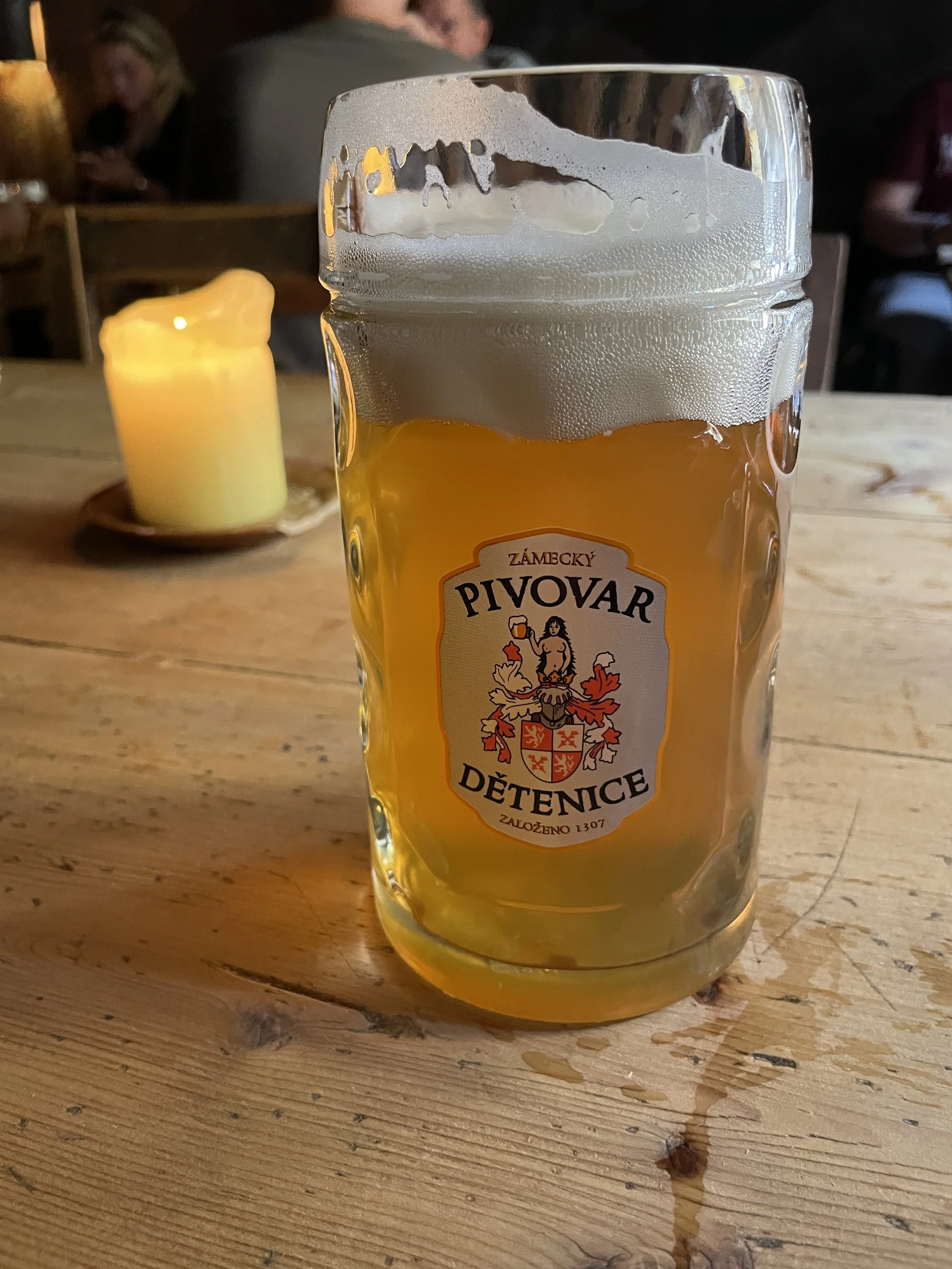About halfway up the staircase, we found a small medieval themed pub: U Krále Brabantského. Outside, a sign labeled the establishment “the oldest pub in Prague since 1375”. It wasn’t just medieval themed, it was actually medieval.