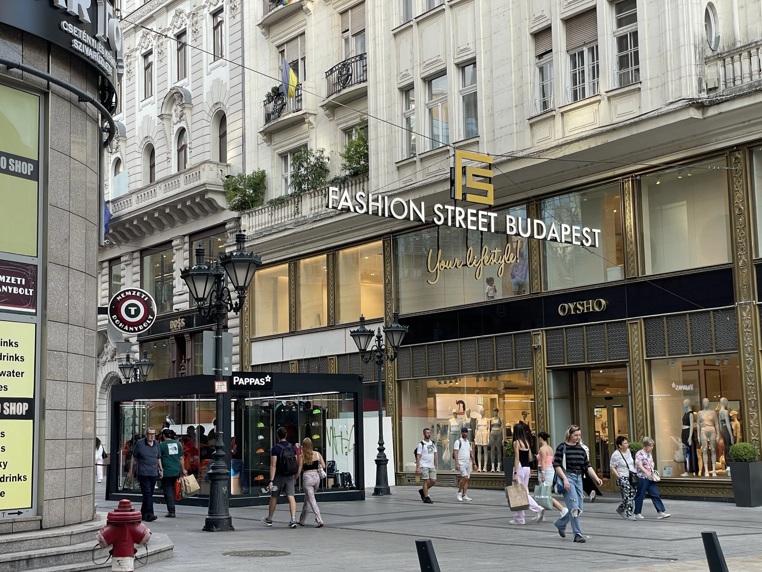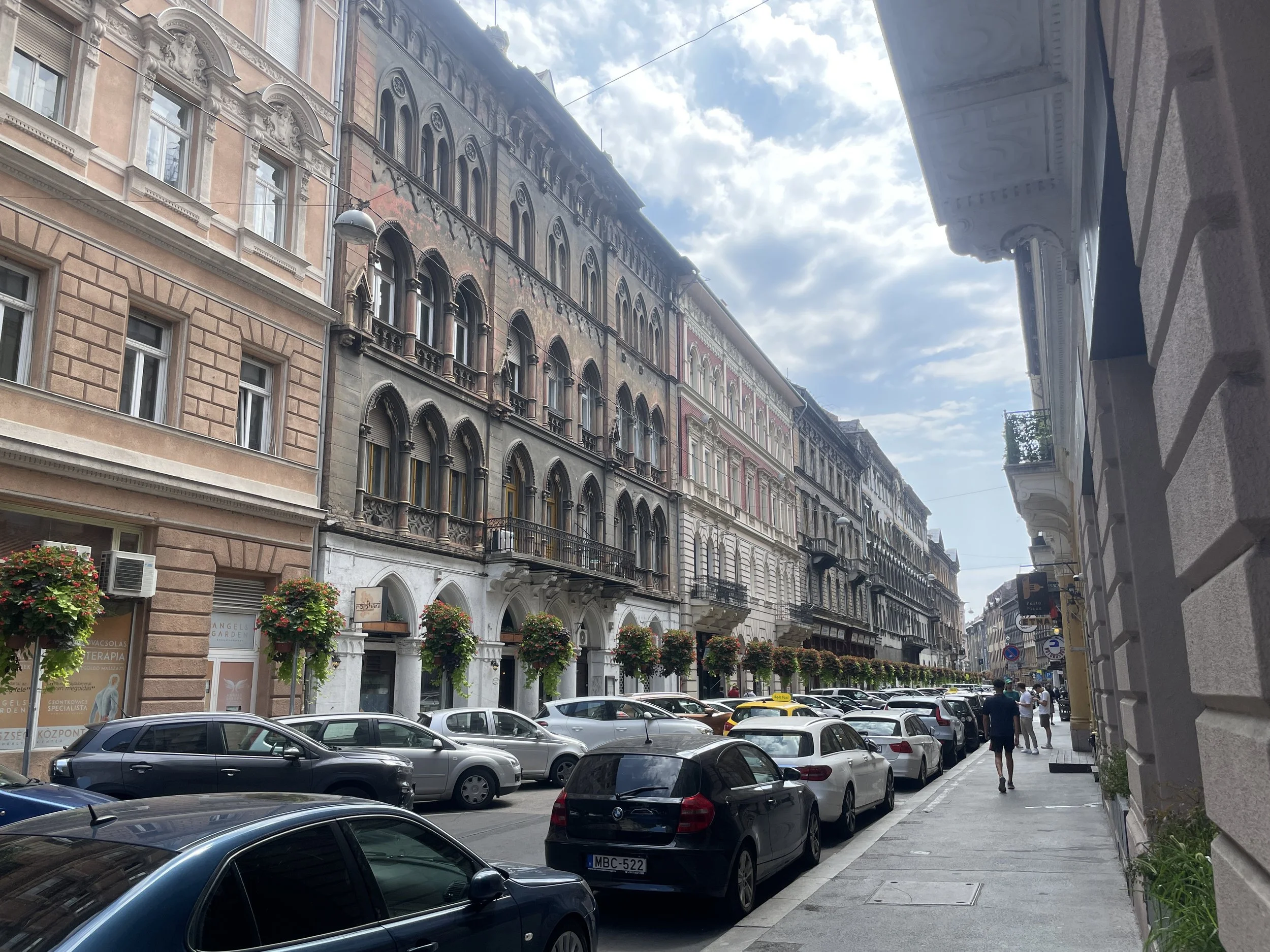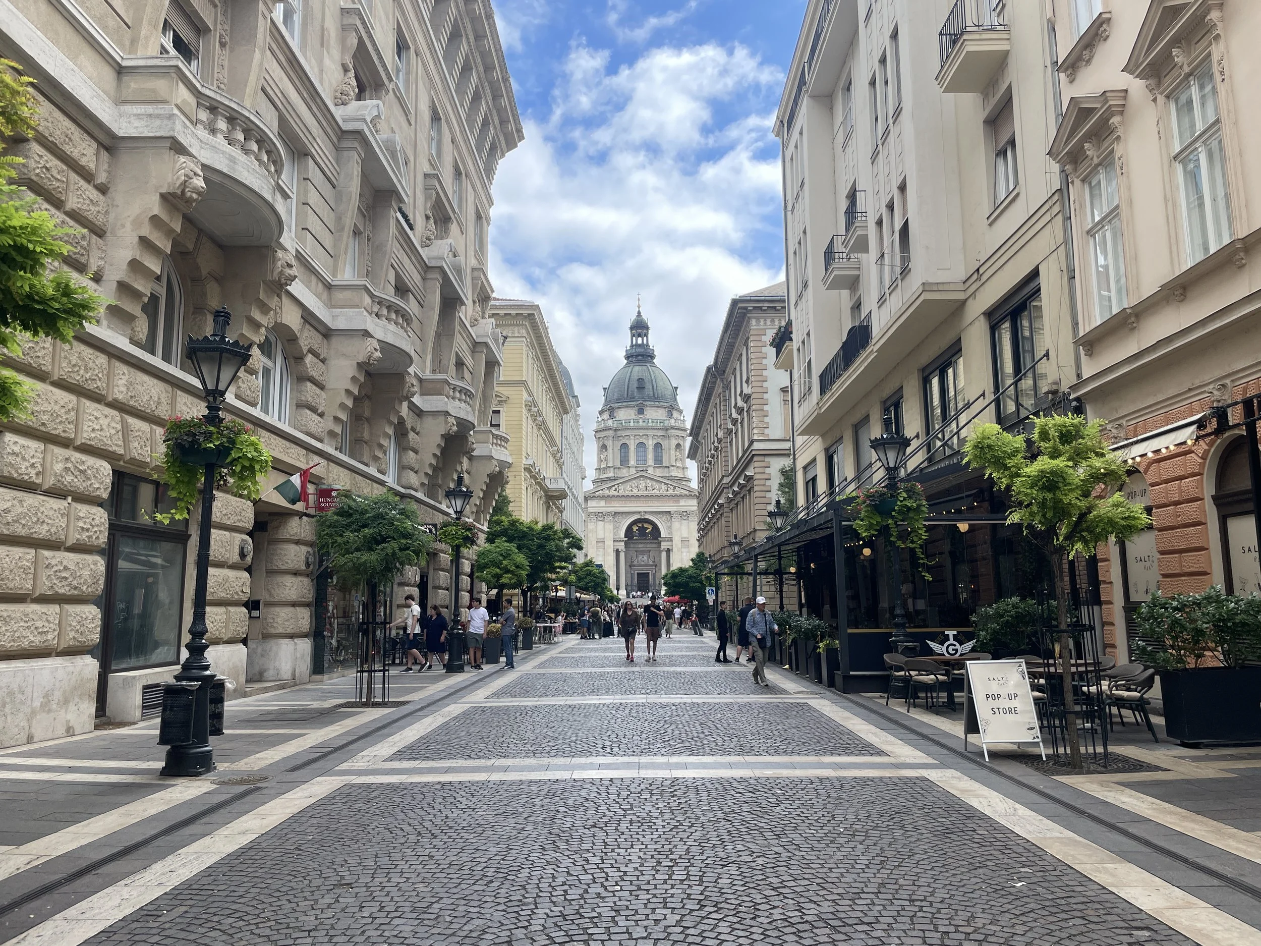 Leaving the train station, we wandered through streets that felt welcoming and lived-in, where the architecture carried a gentle aura of age. The façades were slightly faded, windows and balconies showing signs of daily life, but overall it felt warm and charming. It was the kind of place where the city’s history felt present without being over-polished. As we neared our hotel near St. Stephen’s Basilica, the streets shifted almost immediately. The slightly faded, lived-in charm gave way to a more upscale, polished atmosphere — boutique shops, elegant cafés, and well-maintained façades signaled we were entering the heart of Budapest’s historic and stylish center.