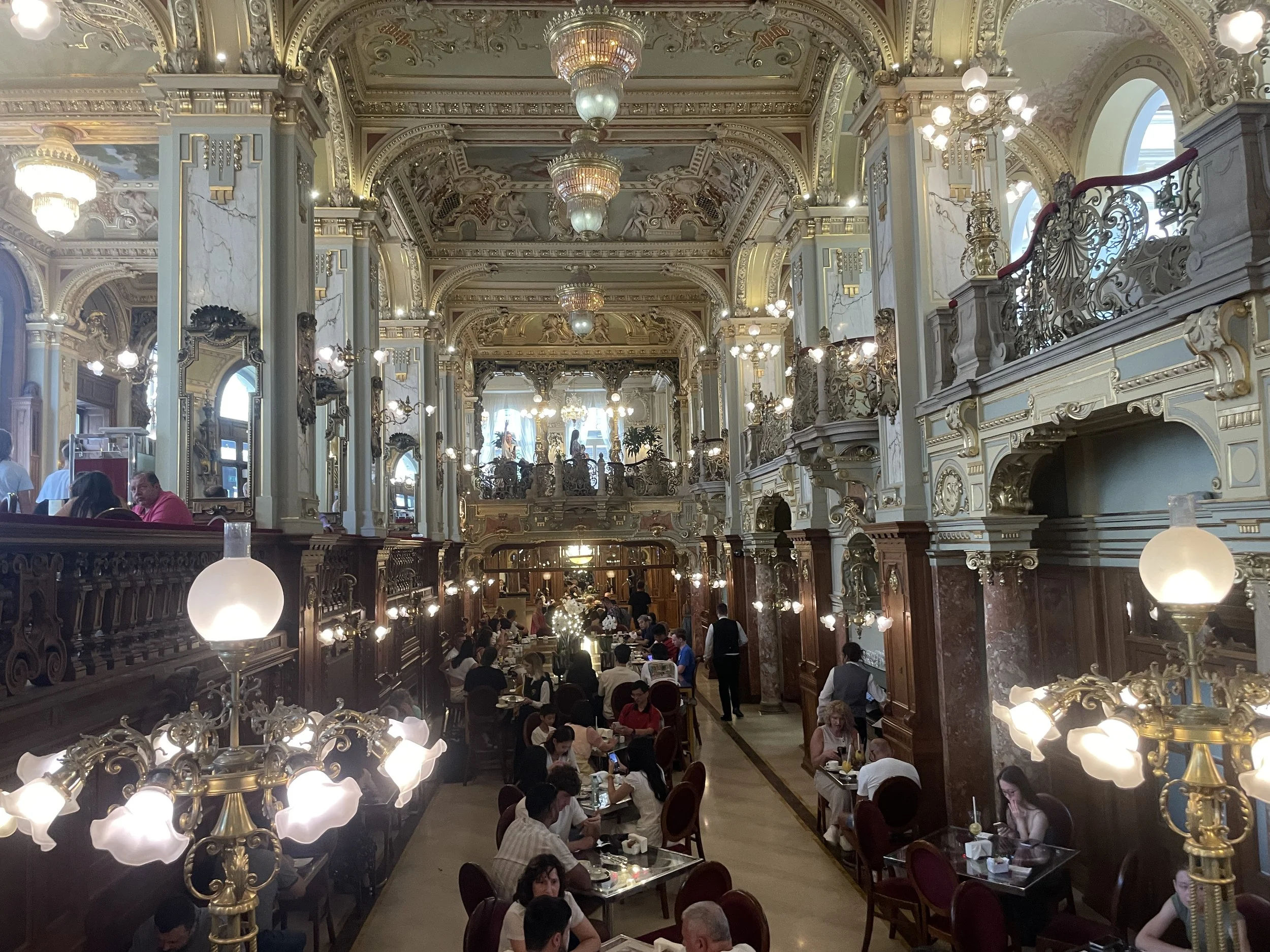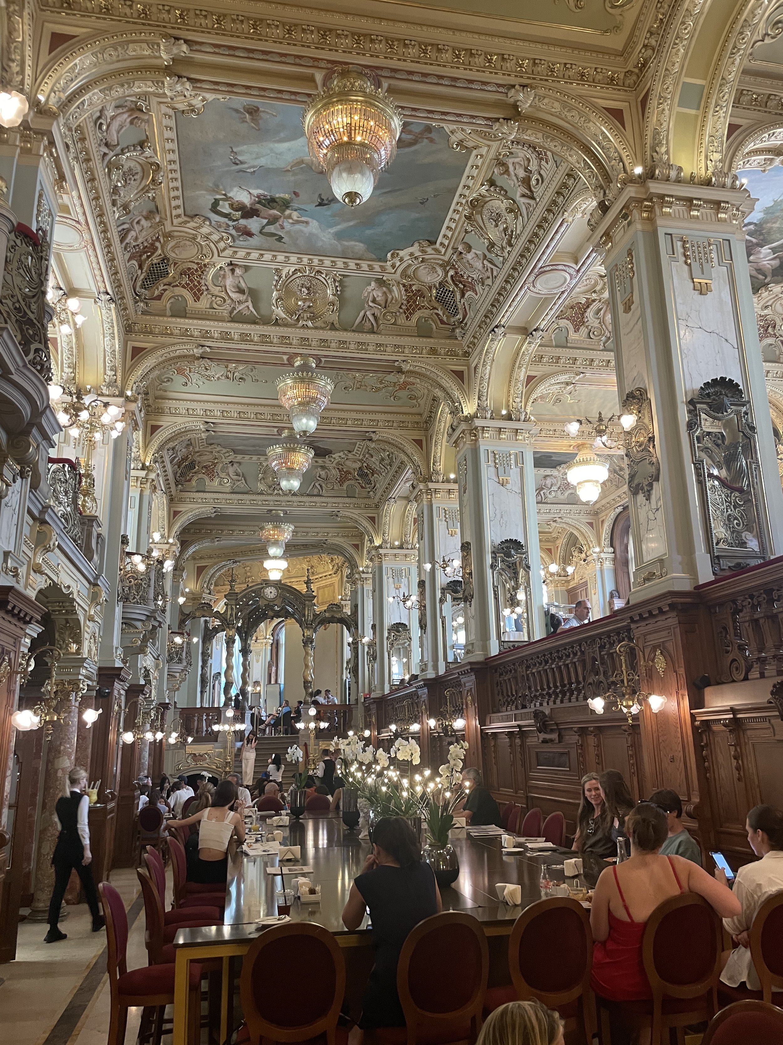 Waking up the next morning, we made our way to the New York Café, often hailed as the “most beautiful café in the world.” Opened in 1894 as part of the New York Palace Hotel, it quickly became a hub for writers, poets and journalists, hosting literary salons and political discussions that shaped Budapest’s cultural life. The interior is lavishly decorated, with soaring ceilings, gilded columns, intricate frescoes and glittering chandeliers. We settled in with gold-topped lattes and croque madames, savoring both the food and the opulent surroundings. Unfortunately, we were tucked in a corner at the back of the cafe, and didn’t really get to enjoy the views, but the food was pretty good.