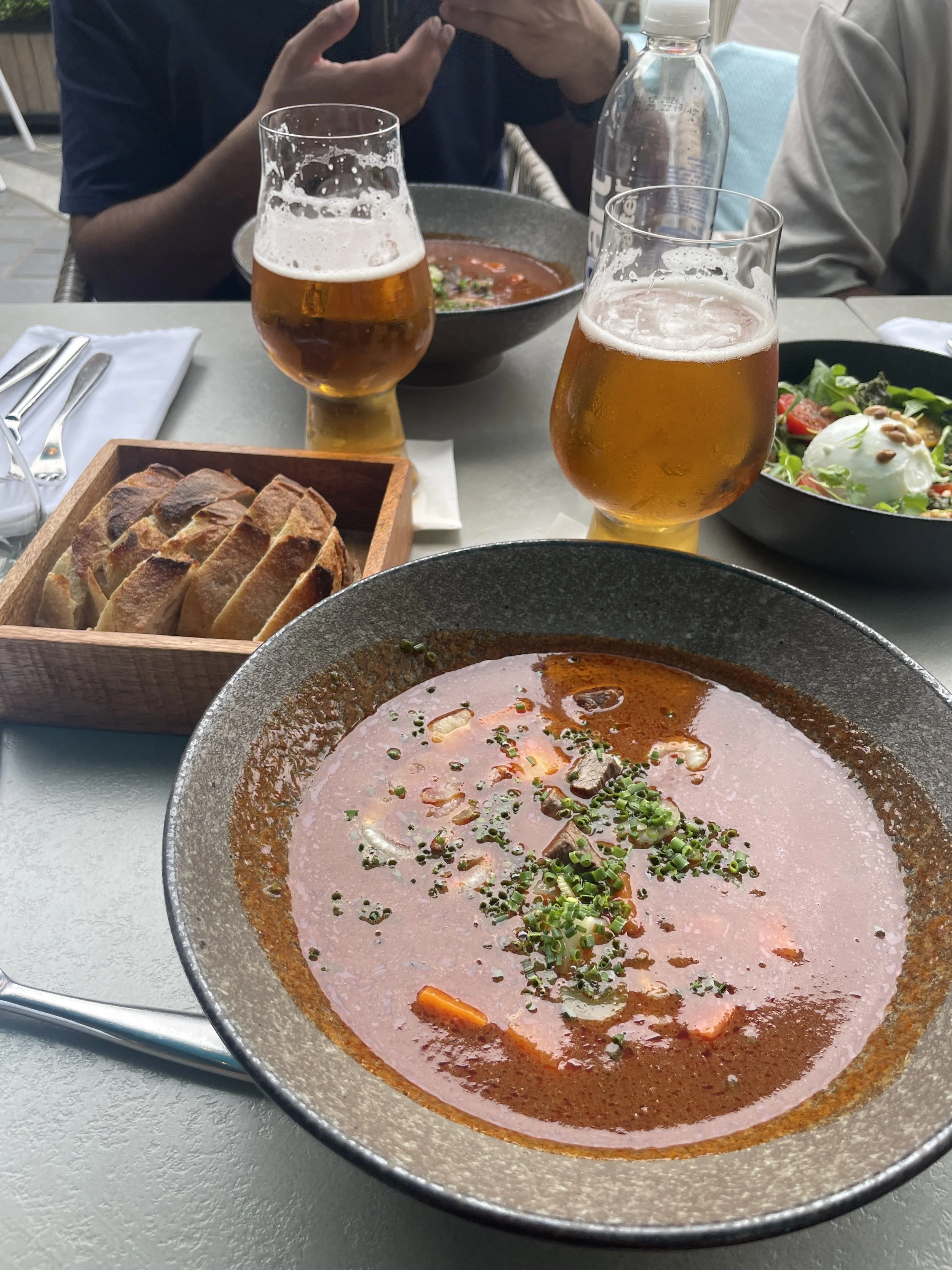 Nearby, there was also a viewpoint overlooking Pest. The panorama was expansive: the flat city stretched out across the Danube. Even under the gray skies, the view highlighted the contrasting character of Buda and Pest. We then stopped for more Lángos, a bowl of beef cheek goulash, and chimney cake.