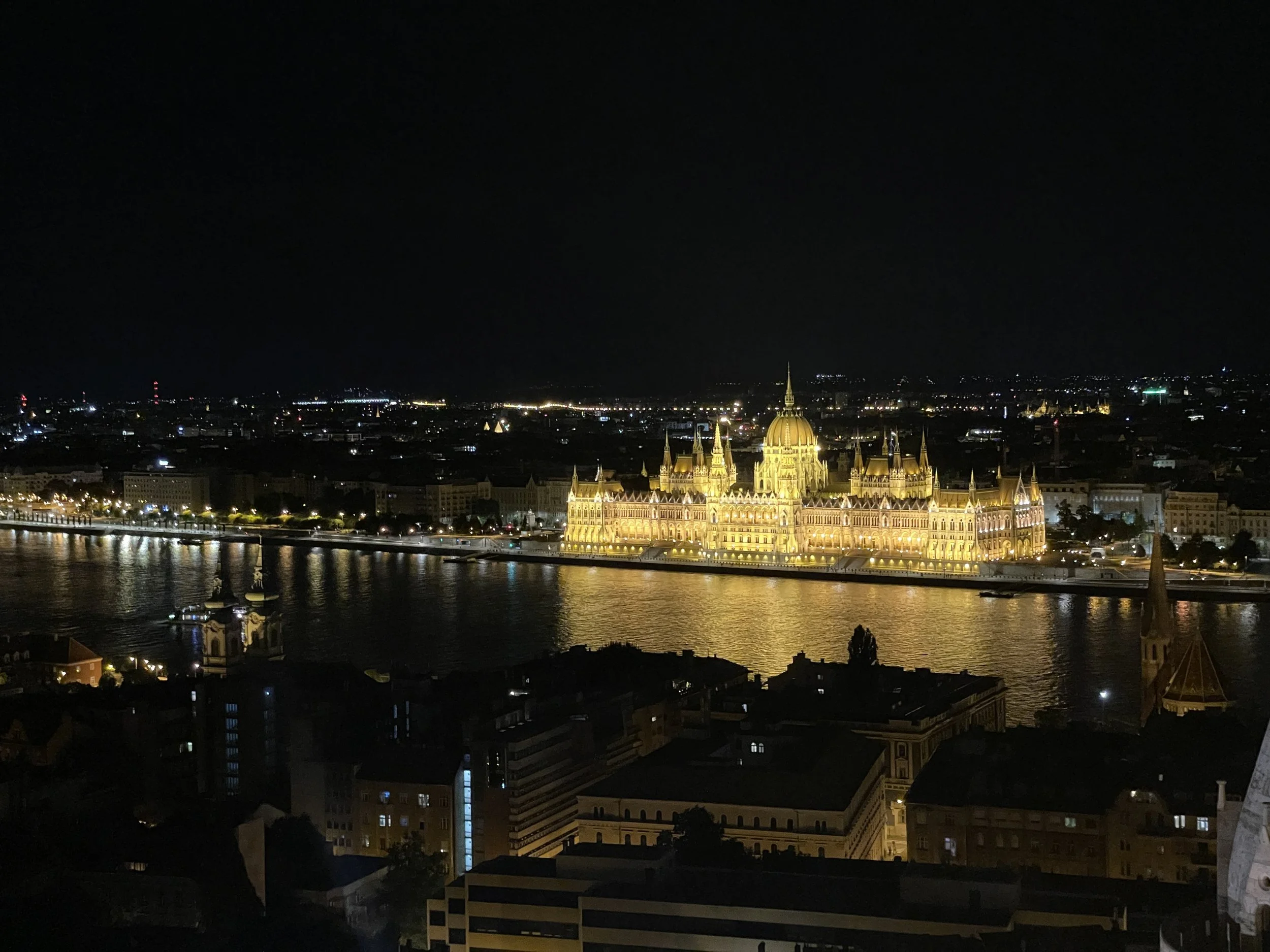 We did our best to blend in, chatting with a few interesting characters while taking in the view. The Hungarian Parliament was lit at first, its reflection shimmering on the Danube, and although the lights shut off shortly after we arrived, the atmosphere stayed electric. With helicopters flying overhead, music drifting up from the streets, and Budapest sparkling below, it genuinely felt like we had stumbled into a glimpse of another world . For one night, we got to be part of it.