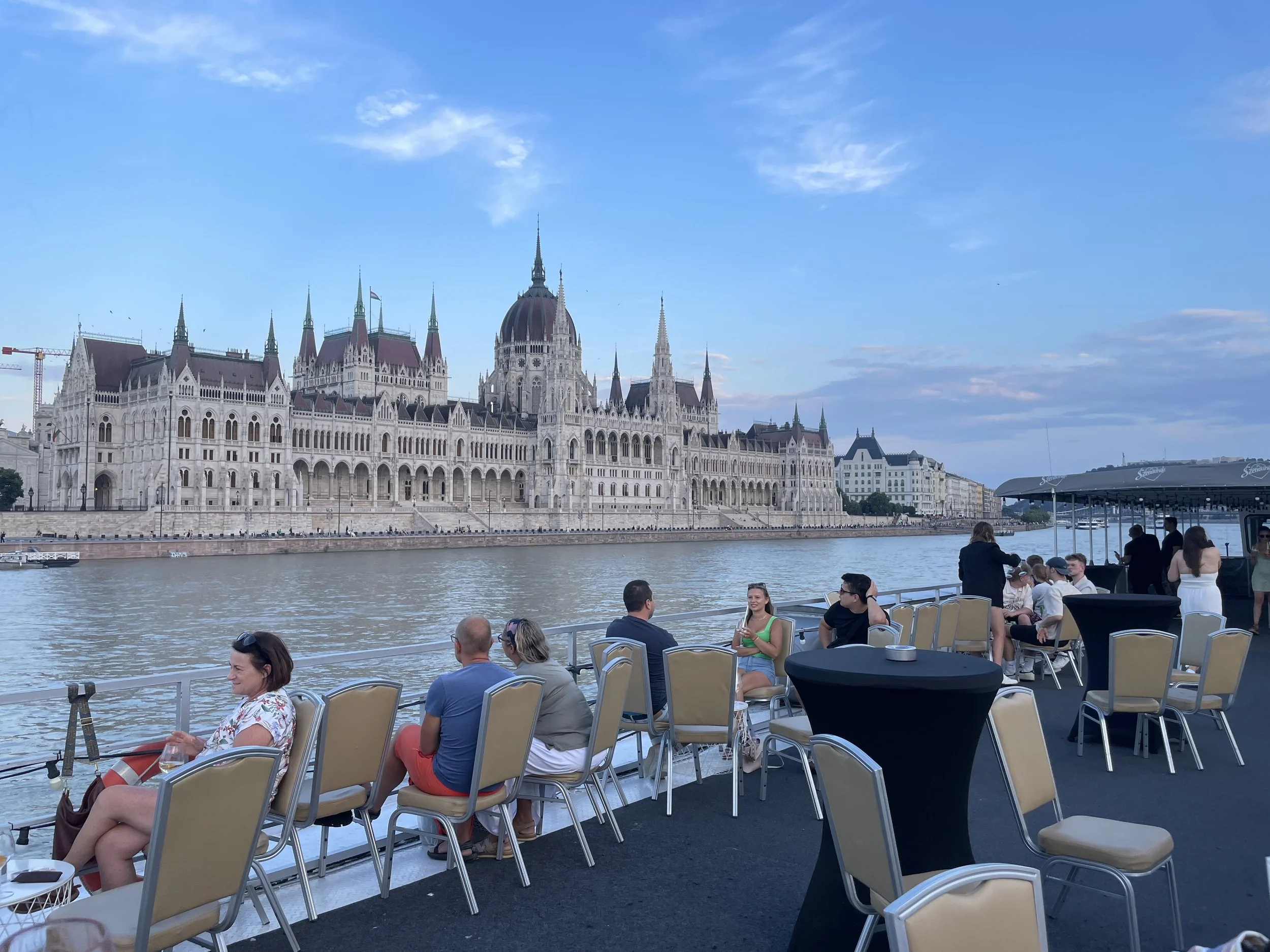 As the boat set off, the city was glowing in the warm light of the setting sun. The Parliament Building gleamed along the riverbank, its spires and dome reflecting on the Danube, while Buda Castle stood high above the water on the other side. We went under the bridges connecting Buda and Pest.