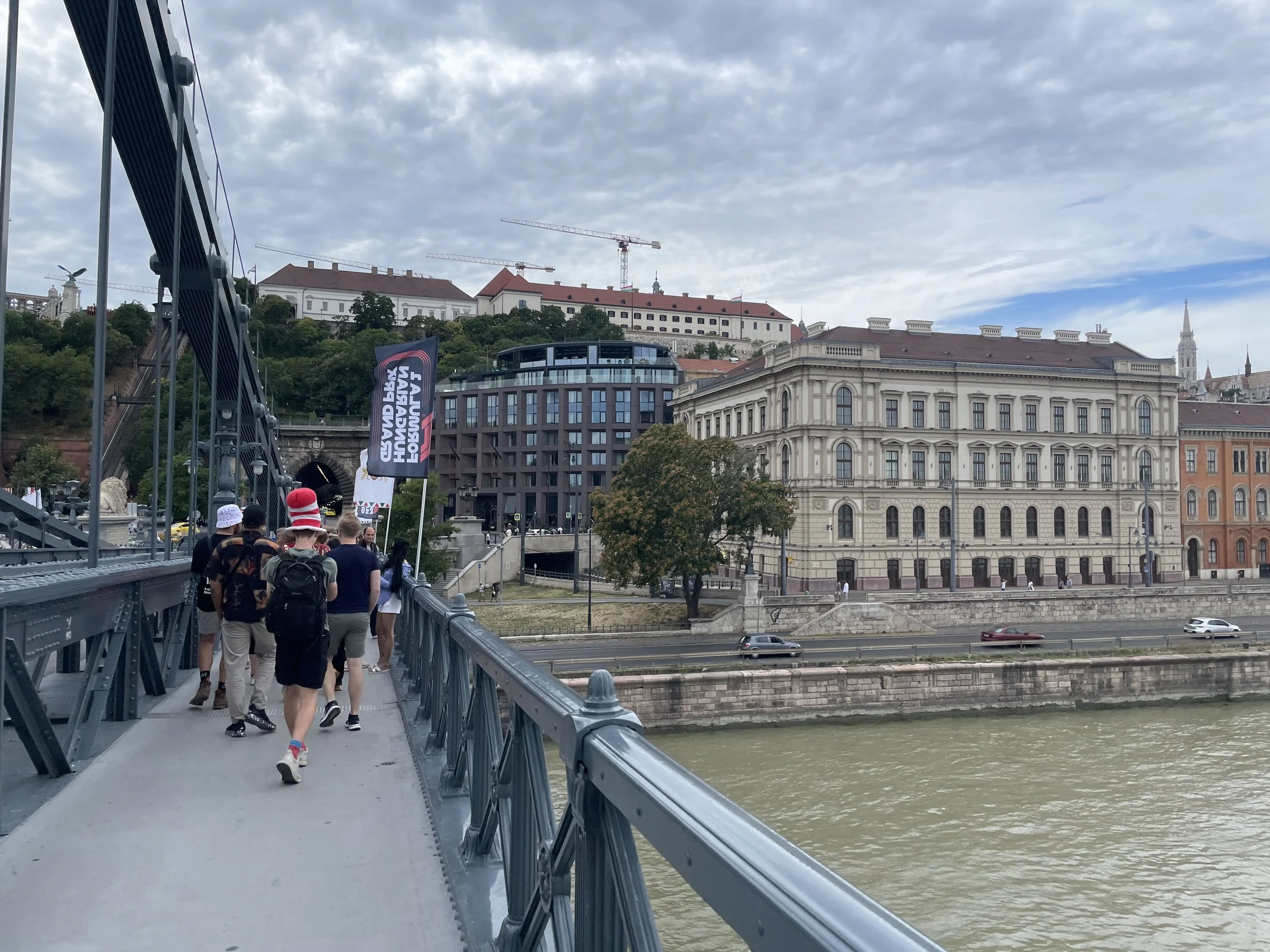 Descending back toward the Pest side of the city, we found the streets suddenly packed with F1 fans. McLaren had won the Grand Prix that afternoon (obviously thanks to the positive vibes we’d given their mechanic the night before) and the celebration energy was unmistakable. Music spilled from pop-up stalls, people in team colors crowded the sidewalks, and the whole area felt like a spontaneous festival.