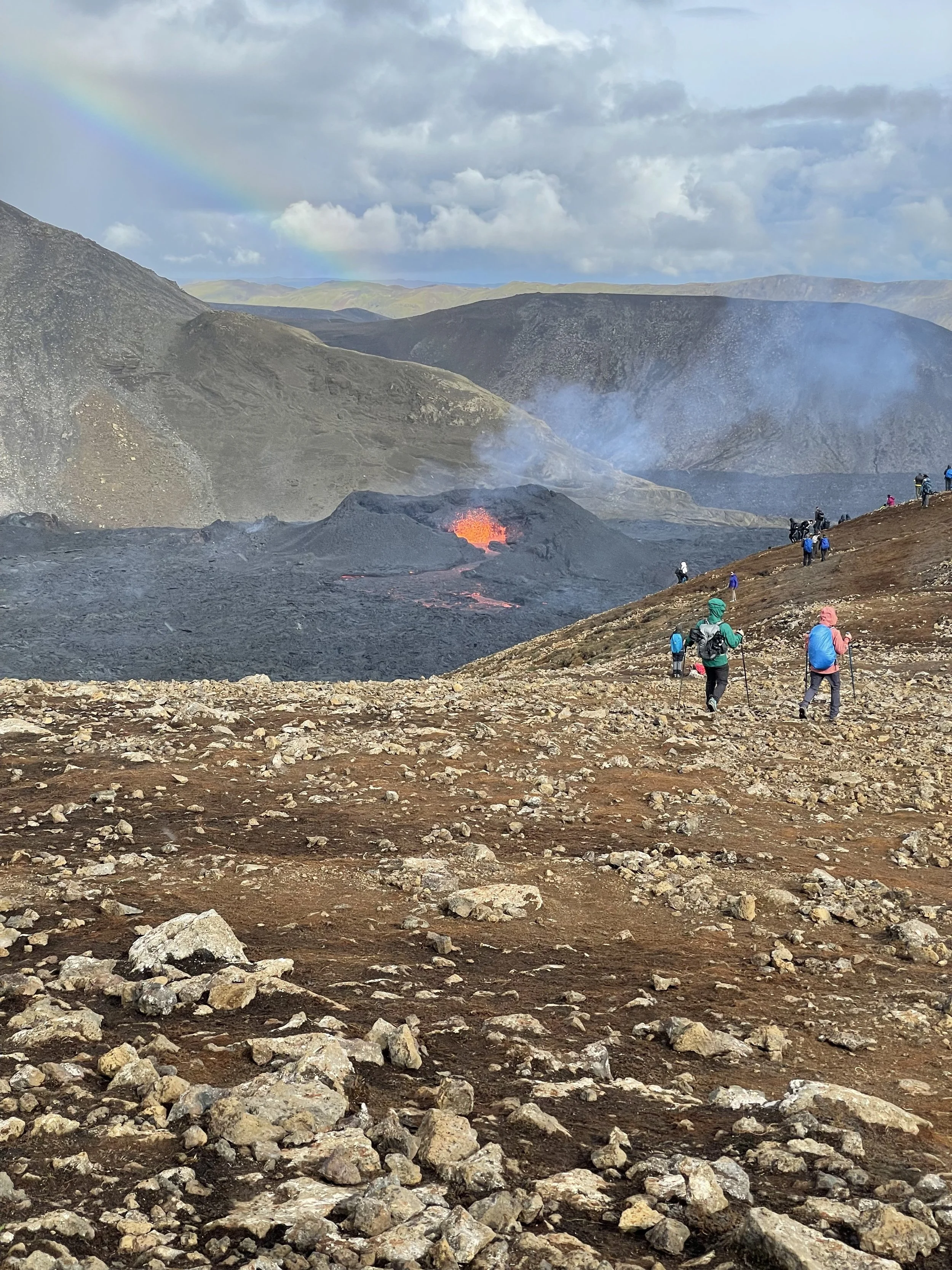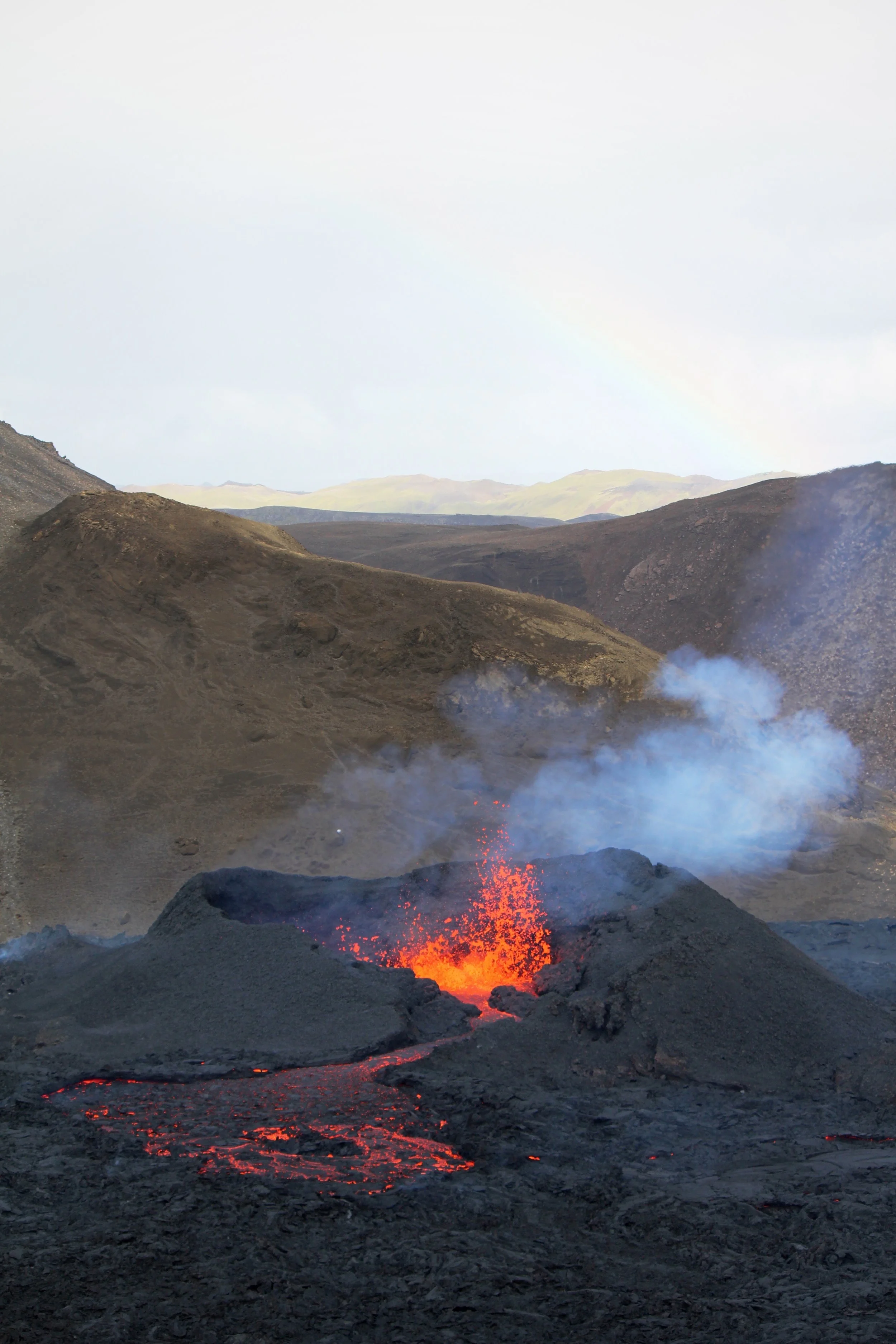 Words can’t describe how explosive and radiant the eruption was. In-person, the lava almost seemed cartoonish- the brightest shade of orange I had ever seen. The lava wasn’t just bubbling, it was exploding out of the black mass of hardened magma. Just as we arrived, a rainbow appeared behind the volcano, adding an even wider display of colours. Exhausted, I sat on the jagged rocks, pulled out my camera, and started shooting.