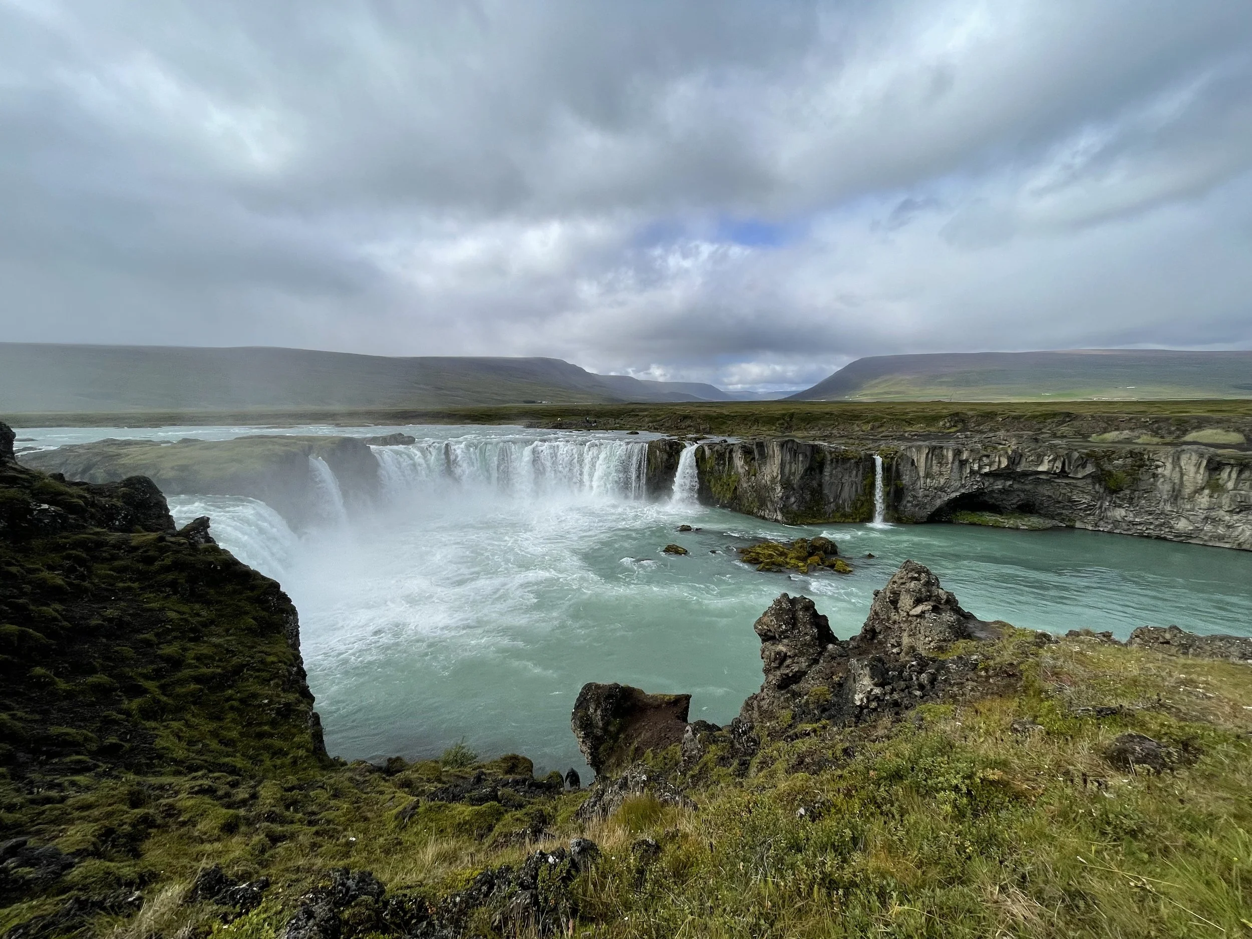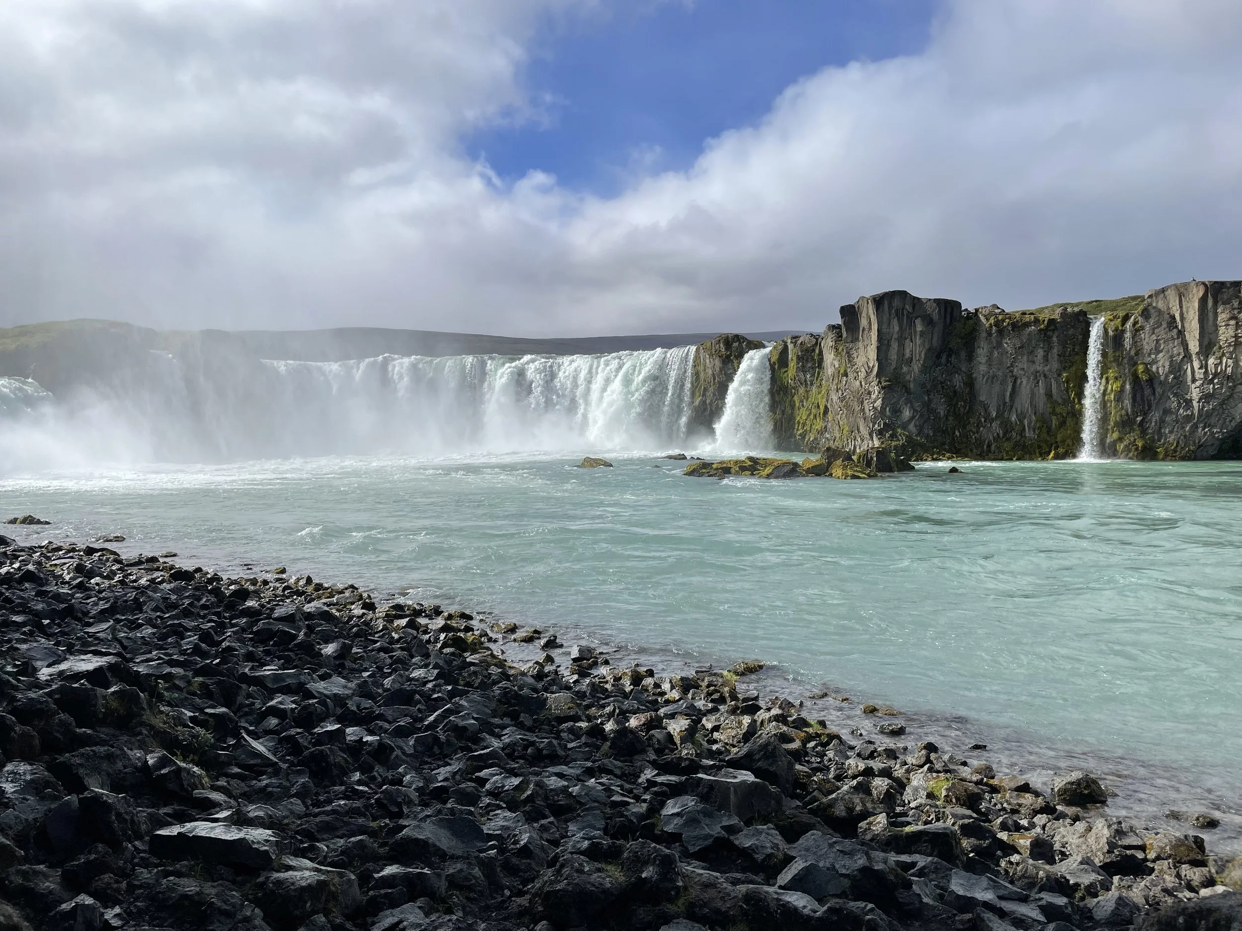 Next, we drove to Goðafoss Waterfall. Known as the waterfall of the gods, it was named this way due to settlers believing in Norse religions, although there was pressure to convert to Christianity. Iceland’s legislative assembly was debating which religion to follow, and law speaker Þorgeir Ljósvetningagoði was tasked with making a decision (knowing that by following paganism, they were more likely to be invaded). After a day and night of thinking, he threw pagan idols into the waterfall, declaring Iceland a Christian nation.