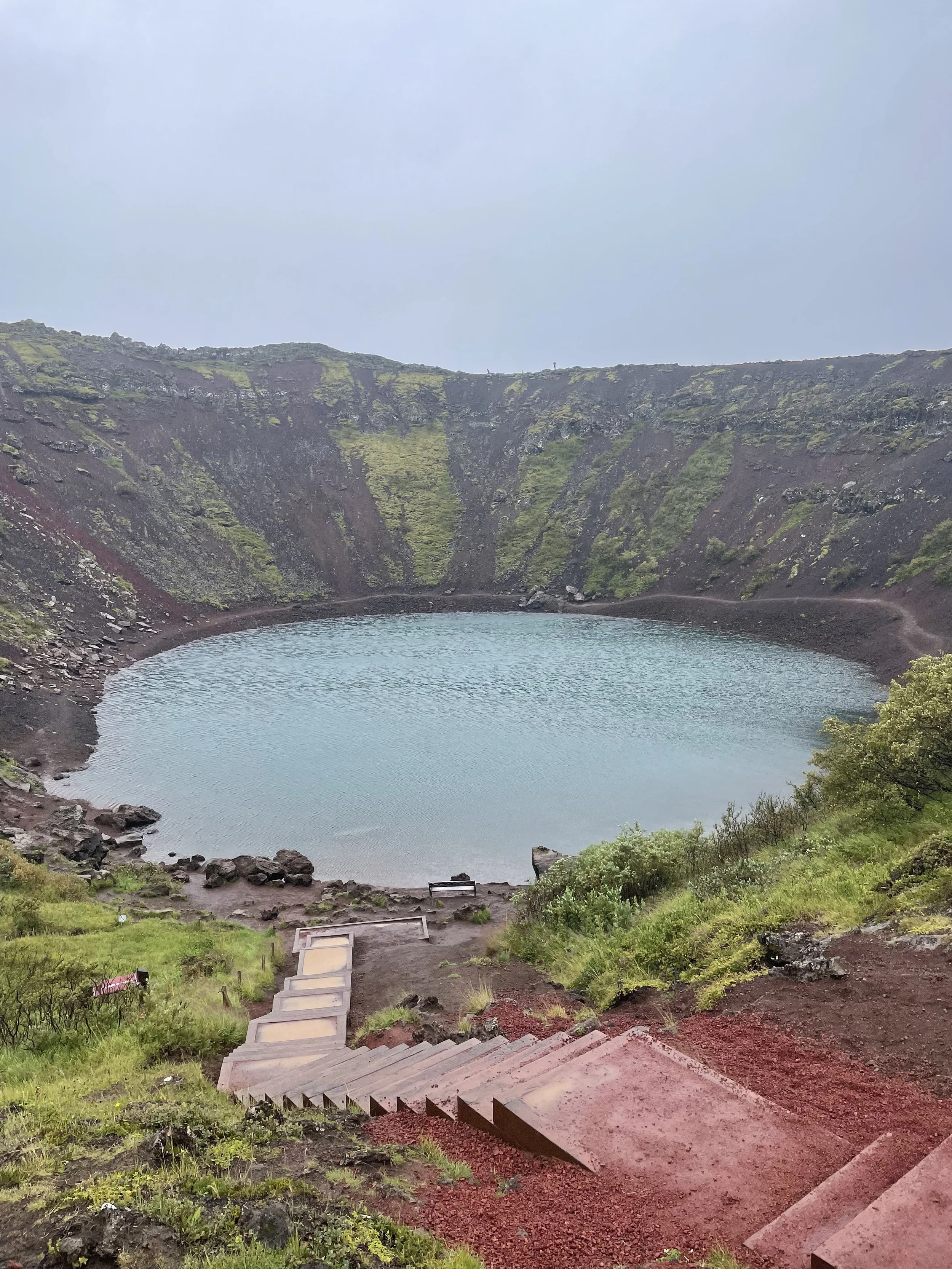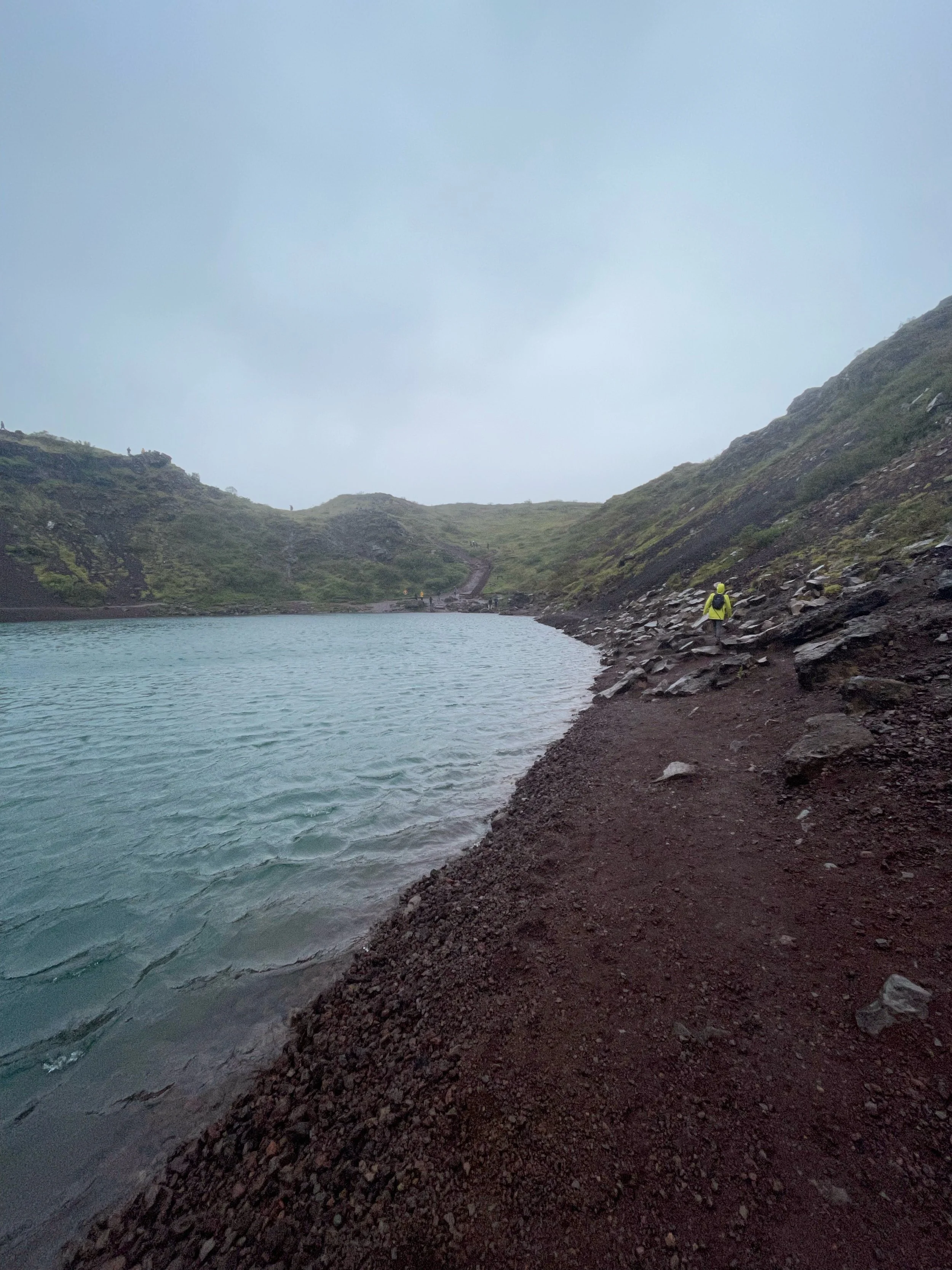 The first stop of the day was the Kerið Crater, a three-thousand-year-old caldera nearly 150 feet deep. The rain wasn’t letting up, but that wasn’t going to deter us from hiking to the bottom of the crater and seeing the pristine water at the bottom. After 30 minutes of fighting the elements and getting soaked through our clothes, we hiked out of the crater and continued on the trek.