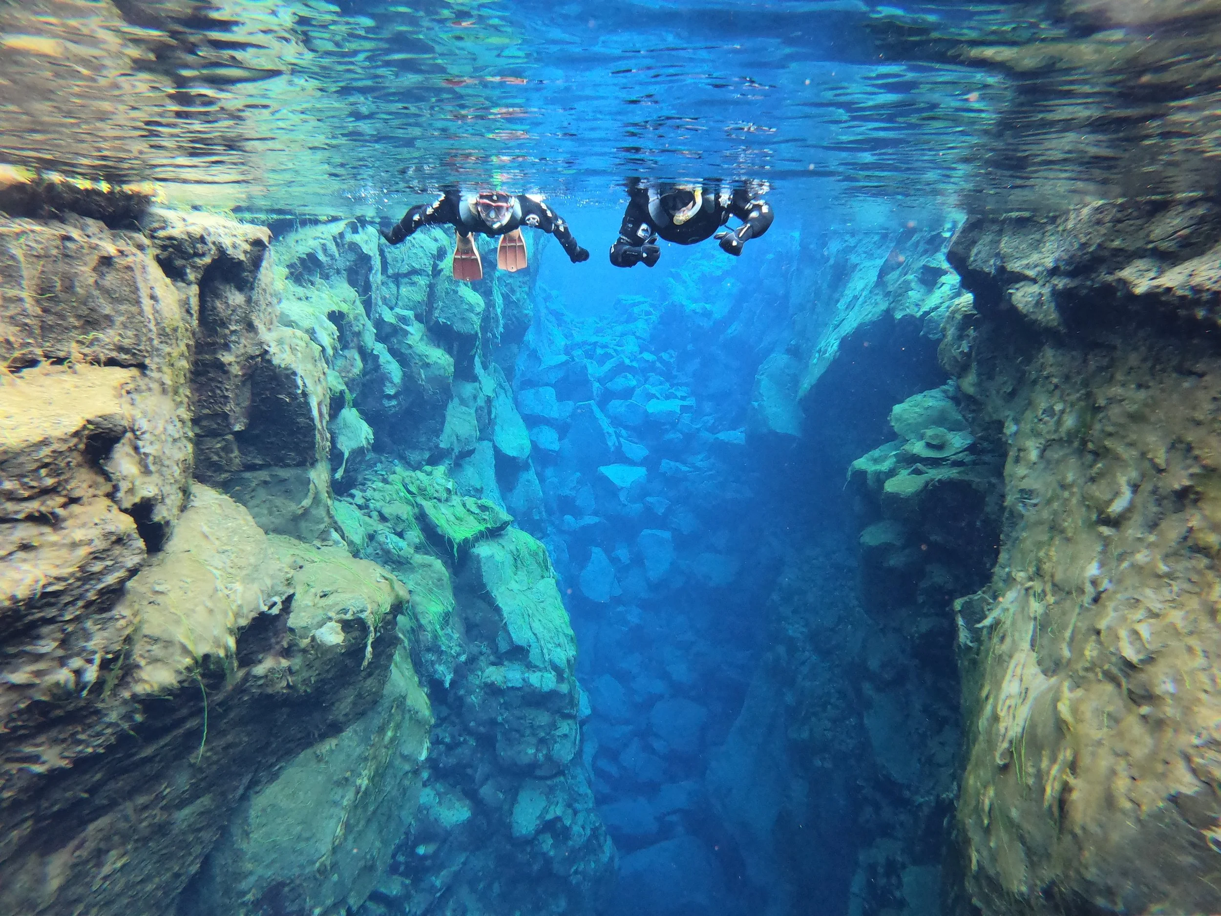 We left our hotel in the dark and watched the sunrise crest over the mountain peaks. After an hour of driving we enter Þingvellir, an expansive national park formed by centuries of erosion and tectonic activity, creating otherworldly views. This UNESCO site is located between the North American and Eurasian tectonic plates, which move apart nearly an inch every year. It’s the only place on earth where you can stand between tectonic plates; but what if you want to do more than just stand?