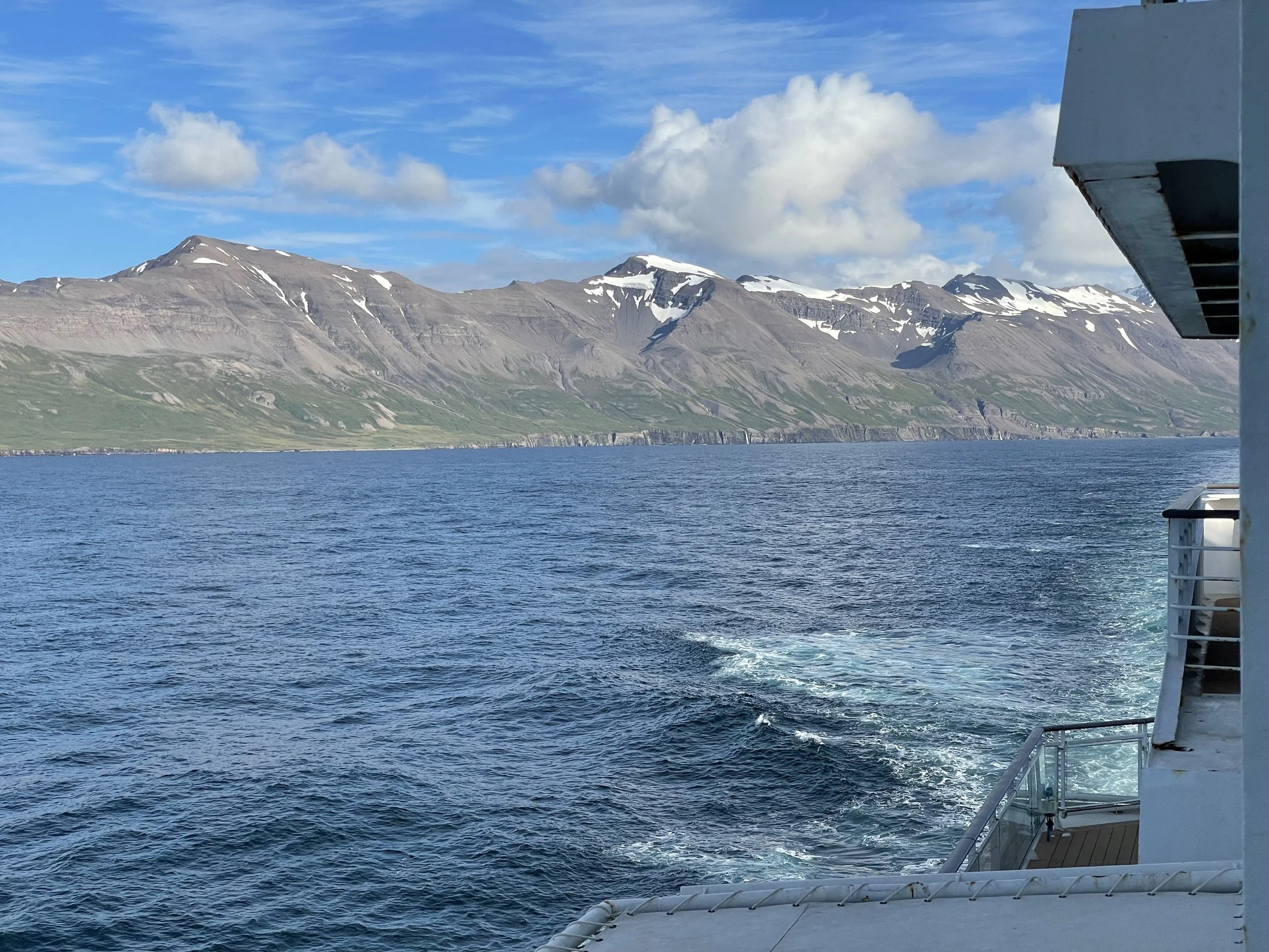 We walked back to the ship and started sailing out of the Eyjafjörður fjord. With phenomenal views on both sides, it was hard to decide where to look. Eventually, the rugged peaks of Iceland began to fade away into the distance, and we began looking forward.