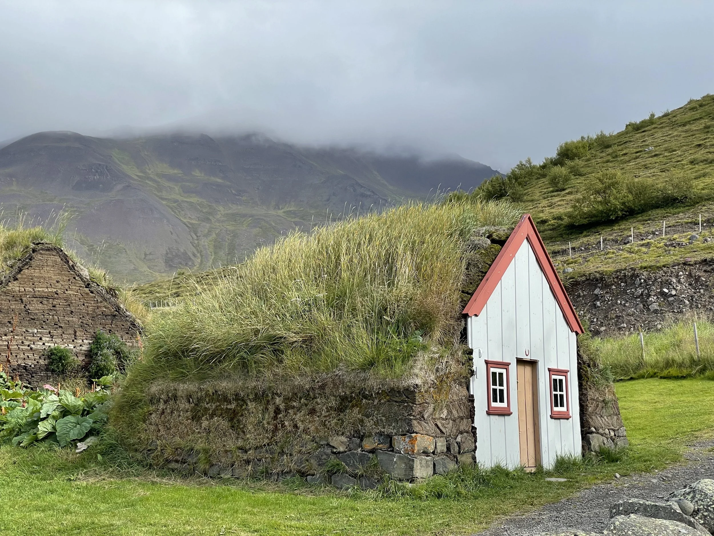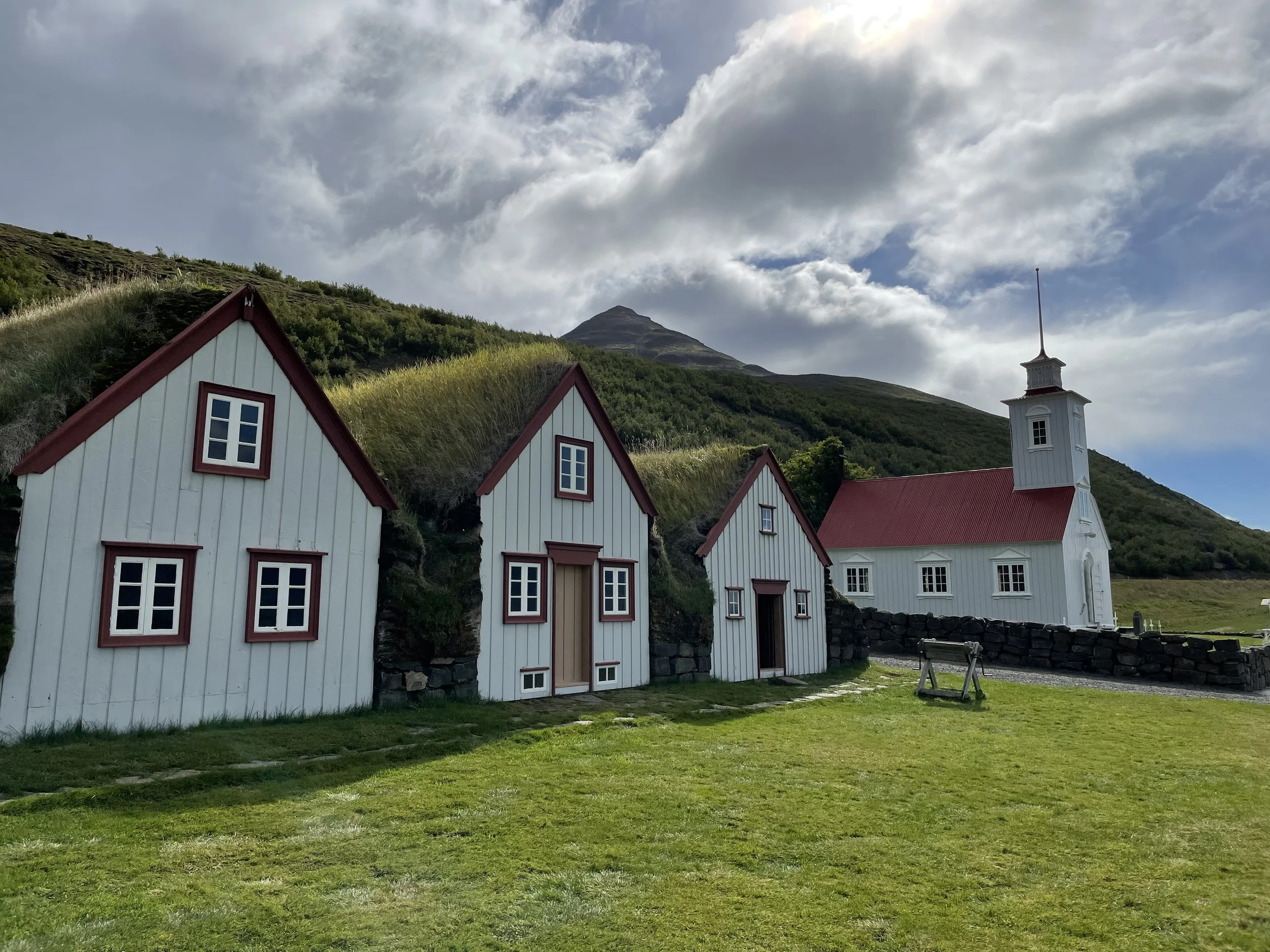 After disembarking, we ventured north to the Laufás Heritage Site, a farmstead inhabited since 874 in the municipality of Grýtubakkahreppur. Built and rebuilt over hundreds of years, these turf houses were originally created with grass and rocks. Overlooking the fjord, this small church has welcomed Christian priests and ministers since 1047. Walking into the houses, it quickly became a maze of low ceilings and creaky floorboards. Since these houses are covered by dirt, grass and rocks, it was clear to see why it felt like we were underground- only a few windows provide light within the houses.