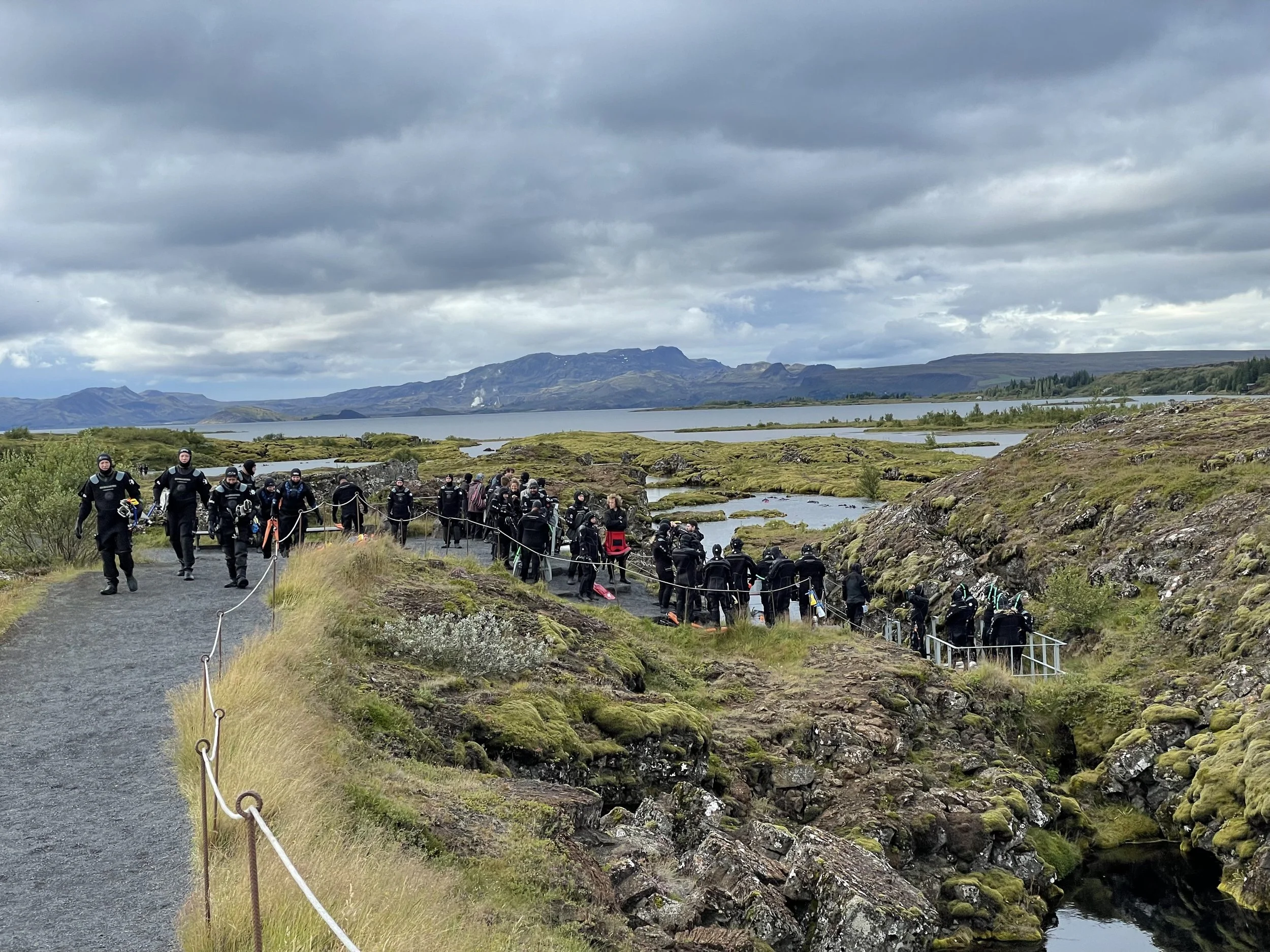 Upon entering the water, the sounds of the world stopped. Þingvellir was already quiet, but inside Silfra was a (literally) breathtaking experience. With more than 100m of visibility, it doesn’t even seem like you’re in the water. Just floating through a crystal blue valley, unburdened by everything except the buoyancy of your drysuit. Get water in your snorkel? No problem, just drink the freshest glacier water on earth. Not a great swimmer? Don’t worry, a gentle current pushes you along through the fissure. I found myself trying to slow down more than actually swimming forward- it was too relaxing to want the experience to stop. All good things must come to an end, however, and we eventually crawled out of the fissure, enjoyed some hot cocoa and cookies, and continued with our day.