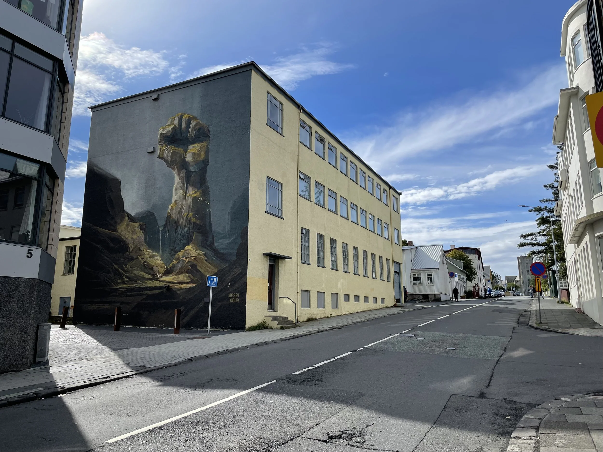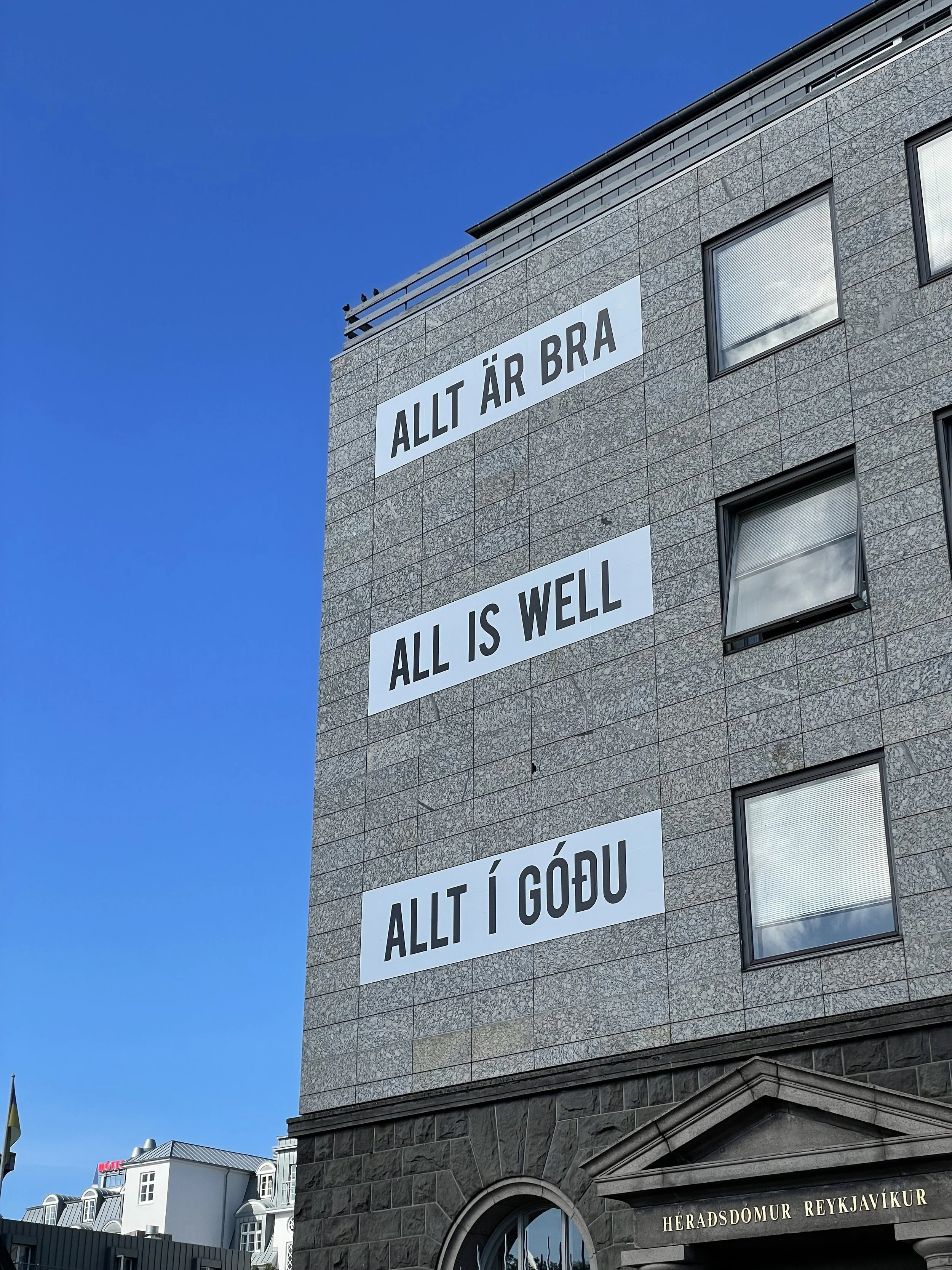 Reykjavík was filled with expansive green spaces, and one of the first places we visited was Arnarhóll. Named after the first settler of Iceland, Ingólfur Arnarson, the hill looks out over Reykjavík’s Old Harbour. We then strolled to a cafe beside the Héraðsdómur Reykjavíkur courthouse. Three large signs on the courthouse displayed a hopeful message in Swedish, English, and Icelandic: Allt Är Bra, All is Good, Allt Í Góðu
