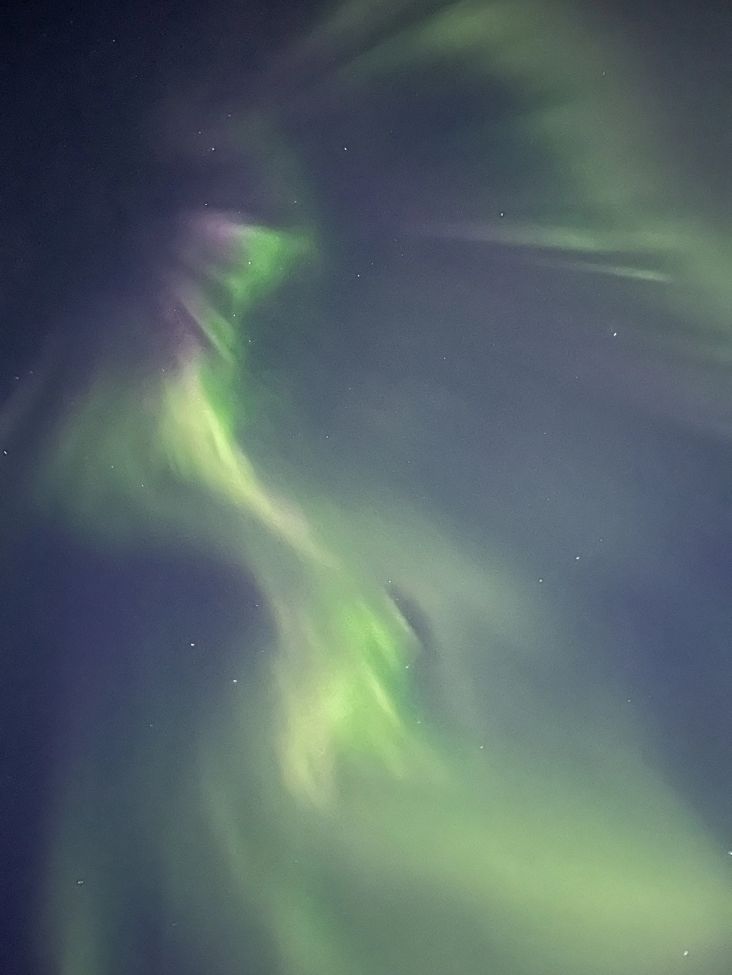 We wouldn’t see land again for a few more days, but that evening, a solar storm occurred right above us. 200km north of Iceland, the sky lit up with a flurry of bright purple and green streaks, rapidly moving and changing shape as we continued along to Greenland. An incredible experience I’ll remember forever as we said farewell to Iceland.