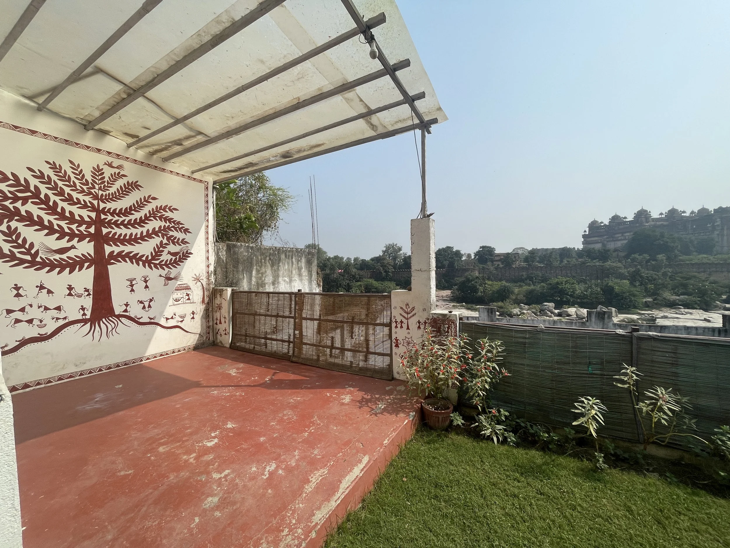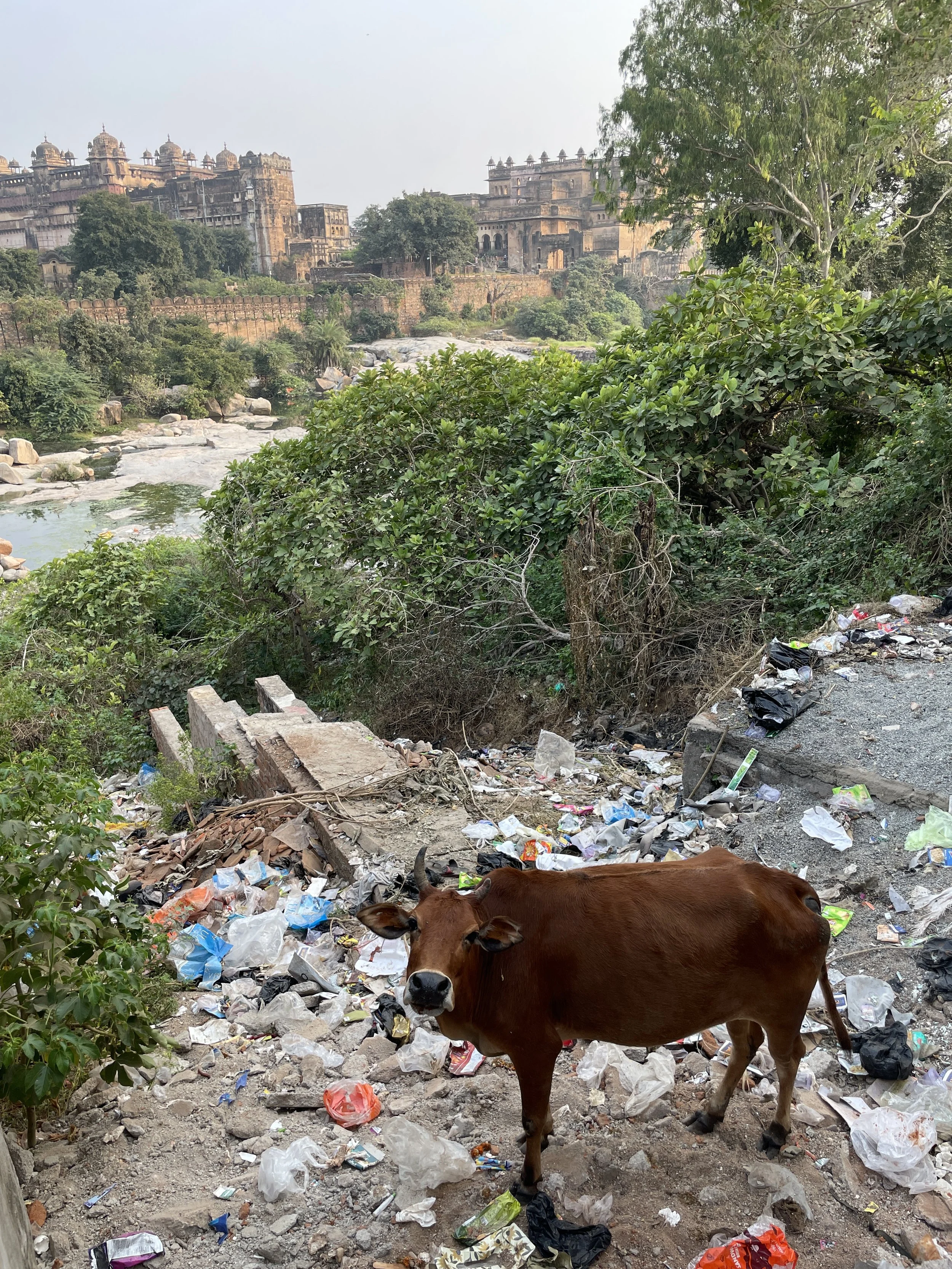 My hotel was on the banks of a quiet river looking up at Orchha Fort, a 500-year-old abandoned fortress filled with monuments and temples. The river was lined with lush greenery, and water buffaloes wandered through the shallows below, grazing and cooling off in the heat.