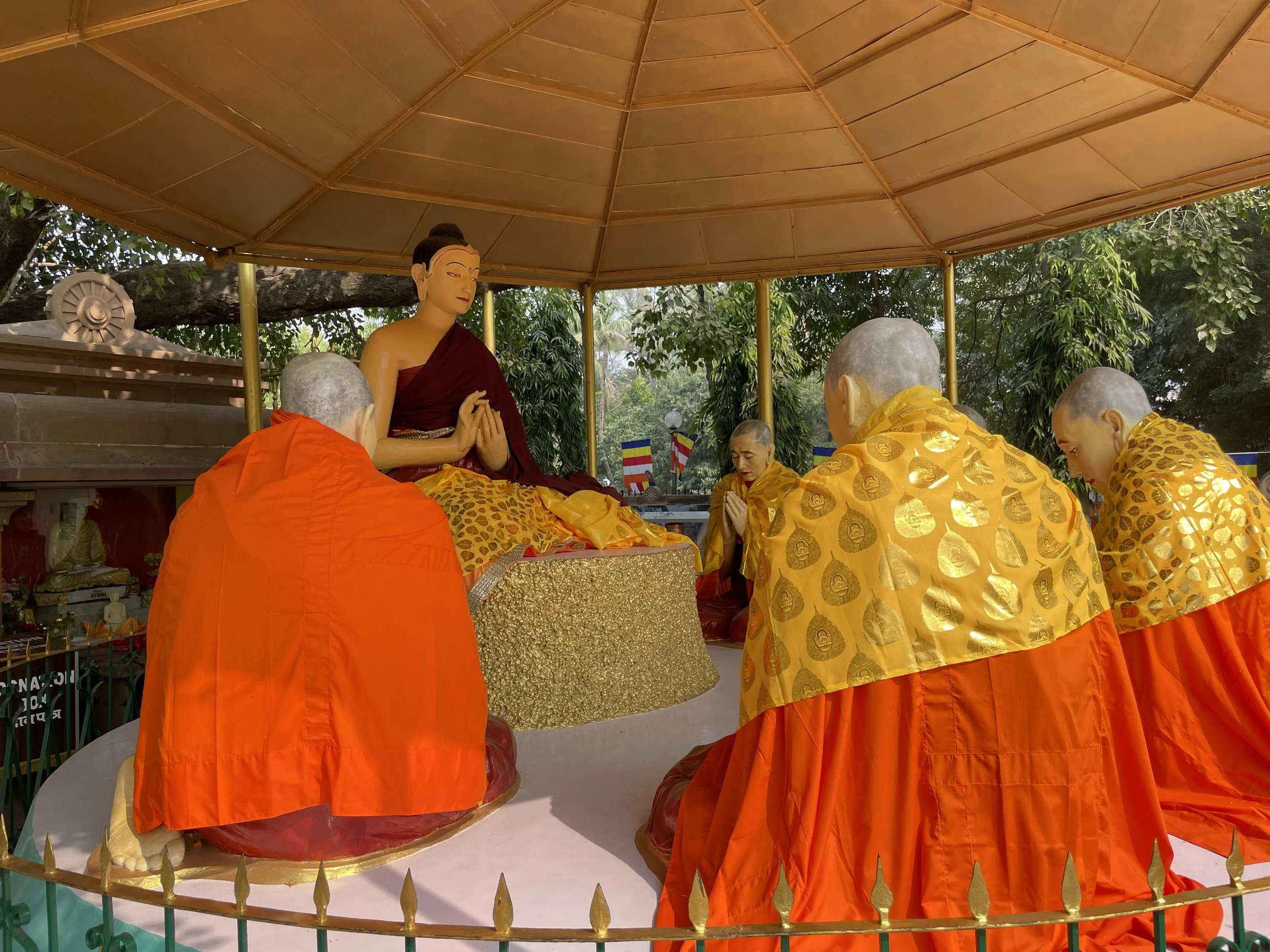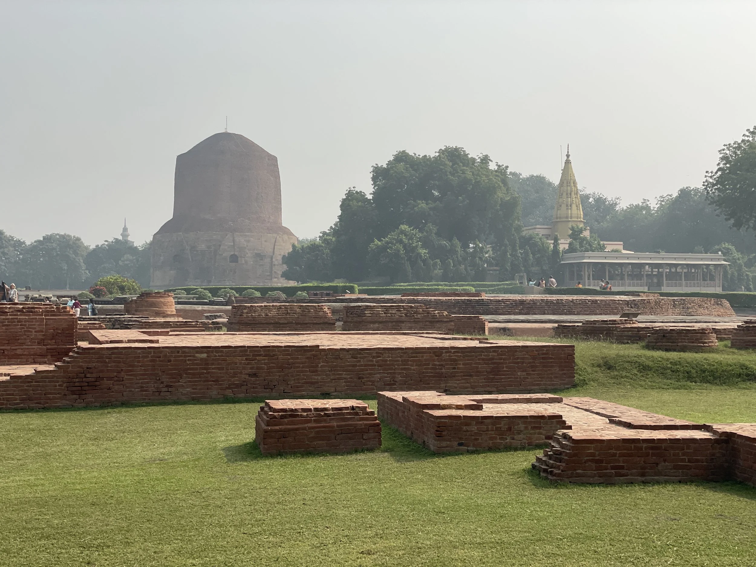 Arriving back to shore, I wandered around Varanasi for a few hours before taking a tour of Sarnath, one of the most significant Buddhist pilgrimage sites. When I first arrived I was met with a towering Standing Buddha statue. At over 80 feet tall, it’s one of the tallest Buddha statues in India, depicting him with his hand raised in a gesture of reassurance and protection. Surrounded by landscaped gardens and a peaceful walkway, the statue rises above the treetops, its calm expression visible from a distance.