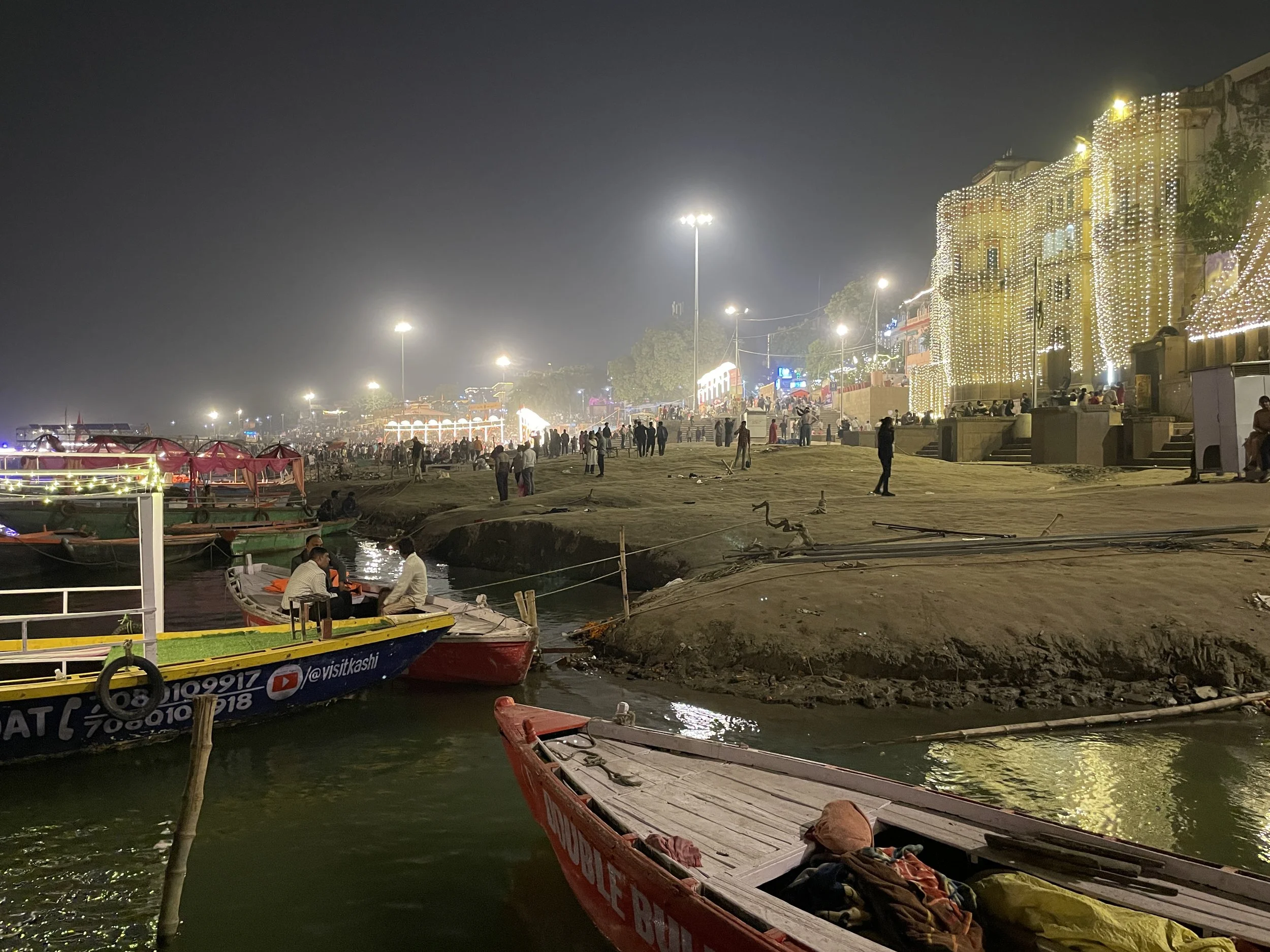 After sunset, we boarded a small wooden boat to see the ghats from the water. On the river, the view was completely different; hundreds of people crowded the shoreline, many of them gathered for evening prayers. The glow of lamps and candles flickered against the stone steps, and the sound of bells and chanting carried across the water. Many boats floated nearby, packed with people hoping for a clear view of the ceremony. As we continued down the river, the glow of the ceremonies slowly faded into the darkness. Eventually, we turned back and docked, the night settling in around us, before facing the busy Varanasi traffic back to our hotel.