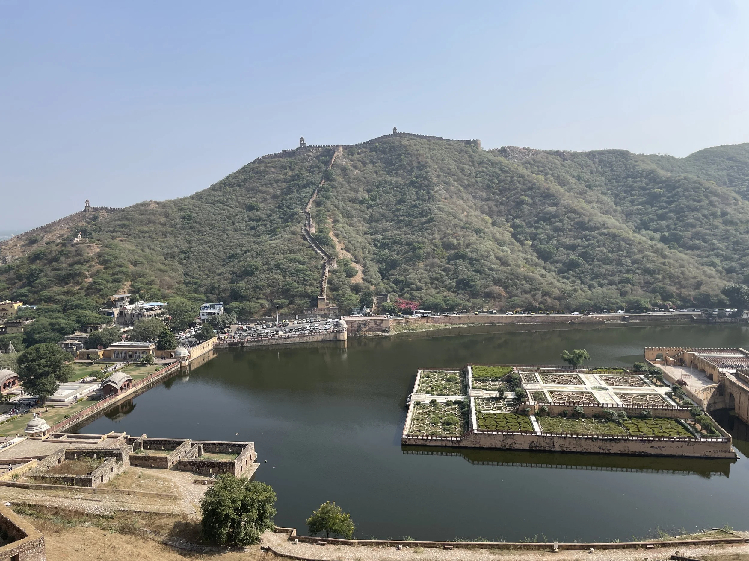 One area of the fort particularly stood out- a hall with its walls covered in thousands of tiny mirrors. Even in the dim light, they caught reflections like stars on stone, throwing back fragments of our movement as we passed through. From the higher levels of the fort, the walls stretched across the hills in every direction, snaking along the ridges like a smaller version of the Great Wall of China. I spent hours wandering through the fort, getting lost through its passageways, and admiring the incredible panoramic views of Maotha lake and the town below.