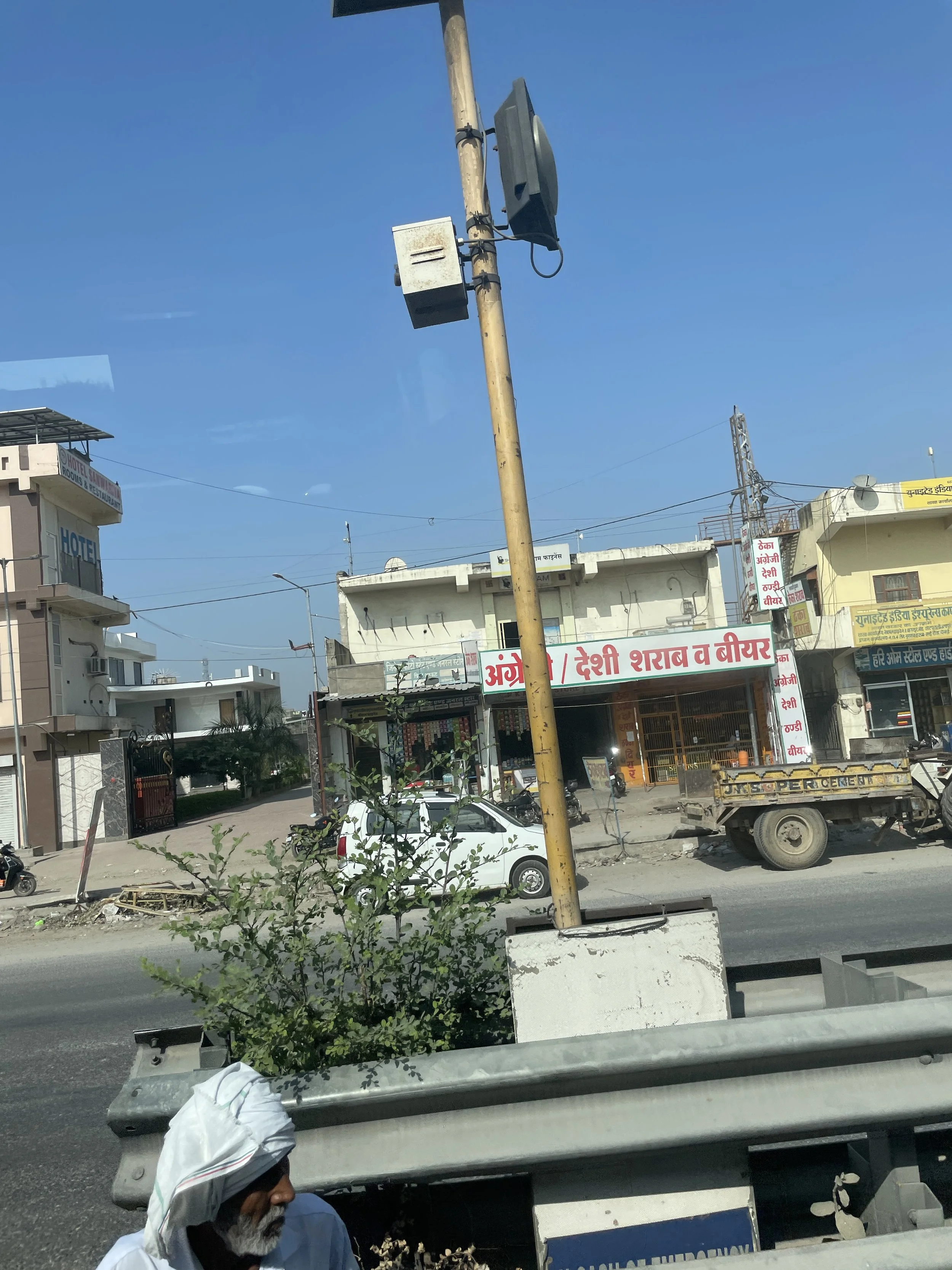 After walking around the India Gate for about an hour, we hopped on a bus bound for Jaipur- a five-hour trek ahead of us. As we left the dense sprawl of Delhi behind, the sky began to clear almost instantly, like a grey film had been peeled away. The roadside was lined with a never-ending stream of businesses- small restaurants, roadside dhabas, hardware shops, tire stalls and budget hotels, many with sun-faded signs and rust creeping along metal shutters and rooftops. It felt like the highway was stitched together by these pockets of life, each one busy in its own way.