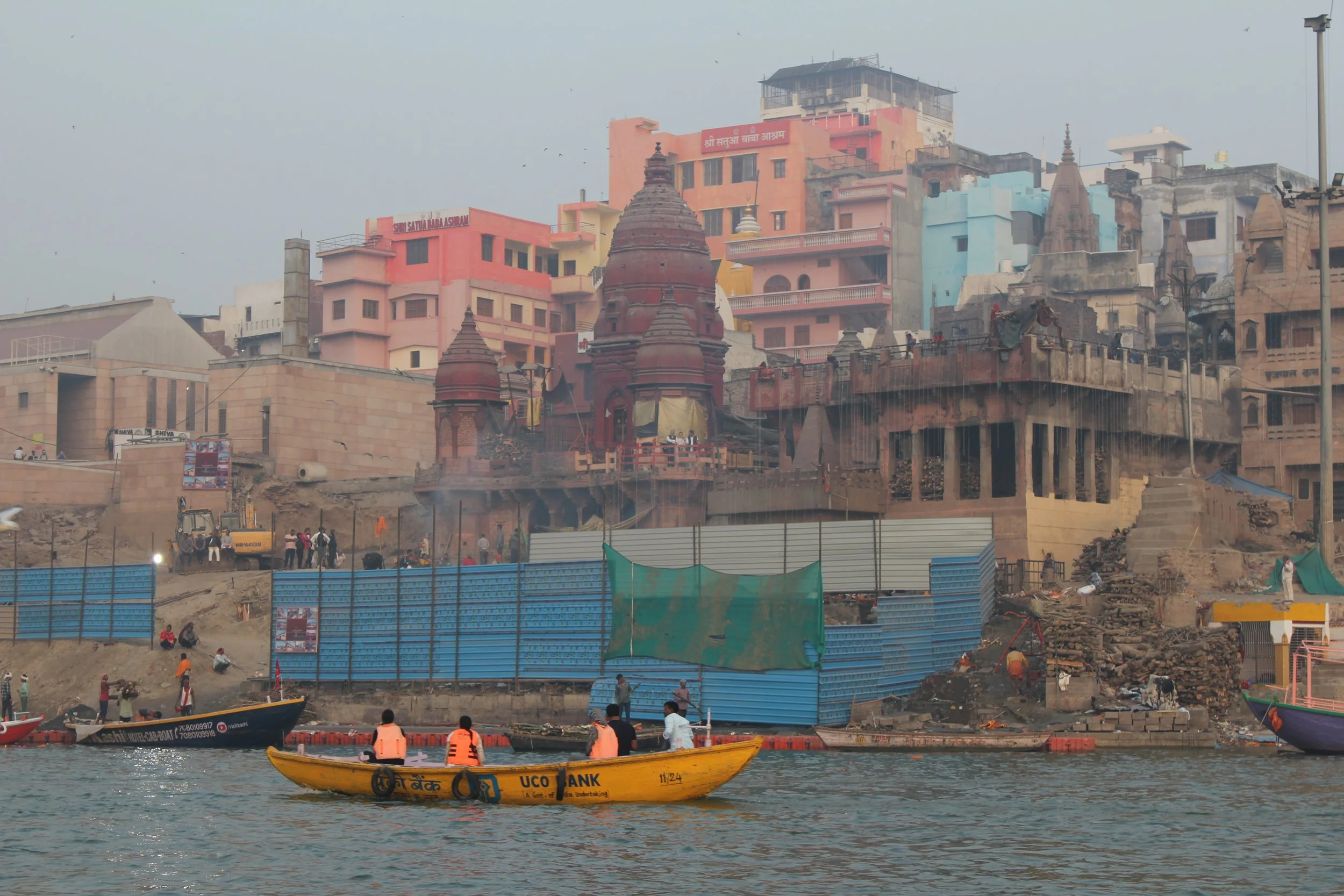 These steps, known as the ghats, stretch along the river’s edge. The ghats form a patchwork of open-air platforms, each with its own rhythm and purpose. Some are dedicated to ritual bathing, others serve as communal laundry stations, and a few are used for cremation ceremonies; their fires burning at all hours. The air is thick with a mix of incense, smoke, and river mist, and the activity rarely stops. Here, the sacred and the routine coexist without pause.