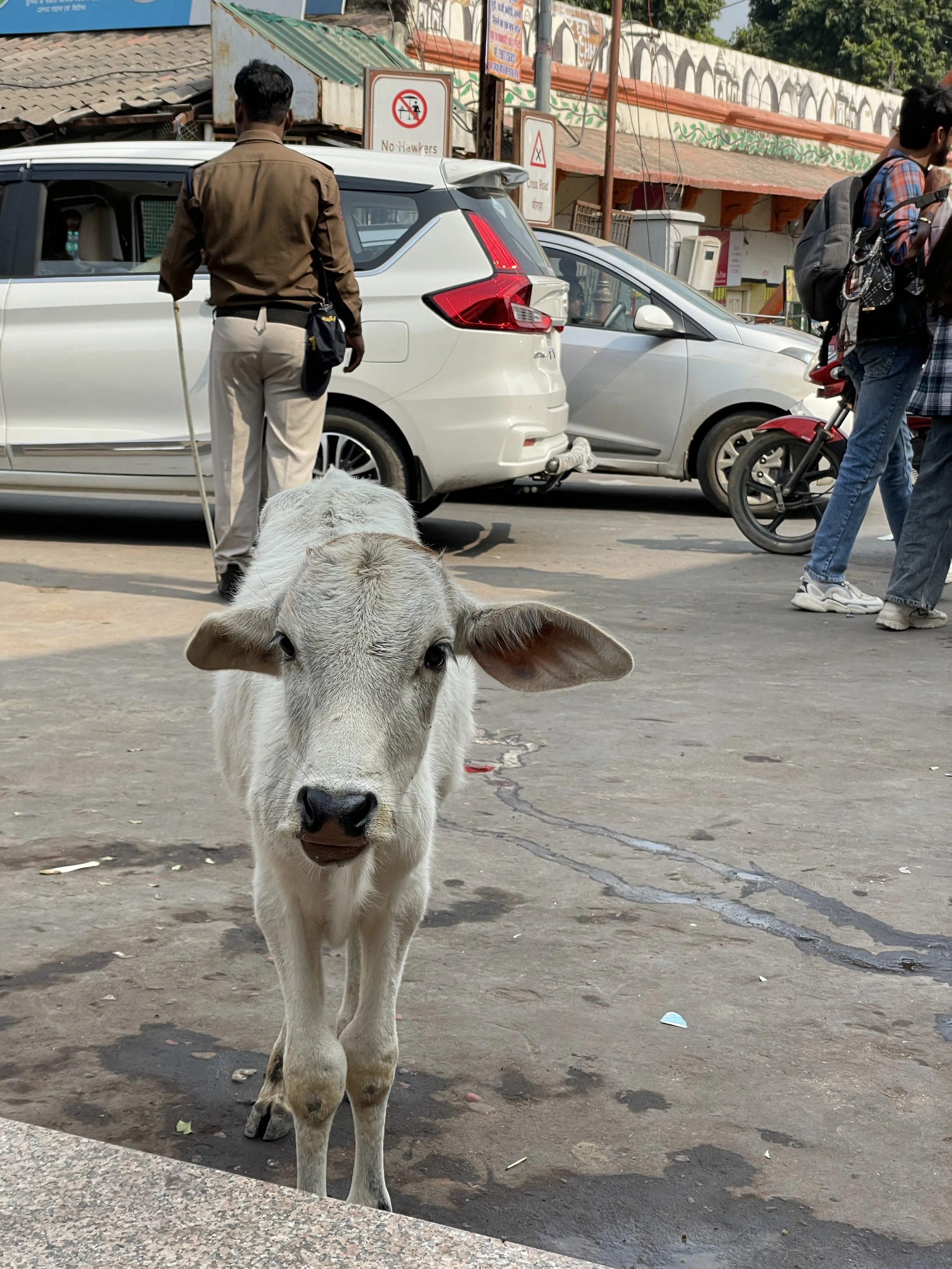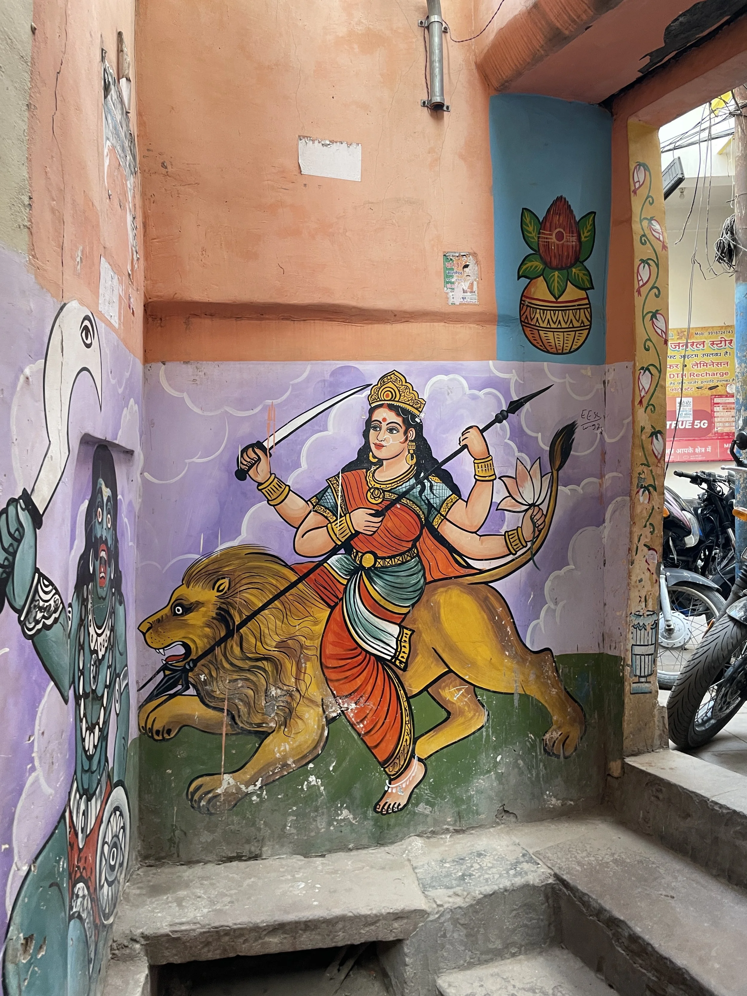 I walked through tight alleyways filled with vibrant murals of Hindu gods and political slogans on the walls, along the occasional cow blocking the entire path like it owned the place (which, in a way, it did). Motorbikes squeezed past at impossible angles, and every turn revealed a new smell: incense, frying food, compost, or all three at once. You didn’t so much walk through Varanasi’s alleys as weave, dodge, and negotiate your way forward.