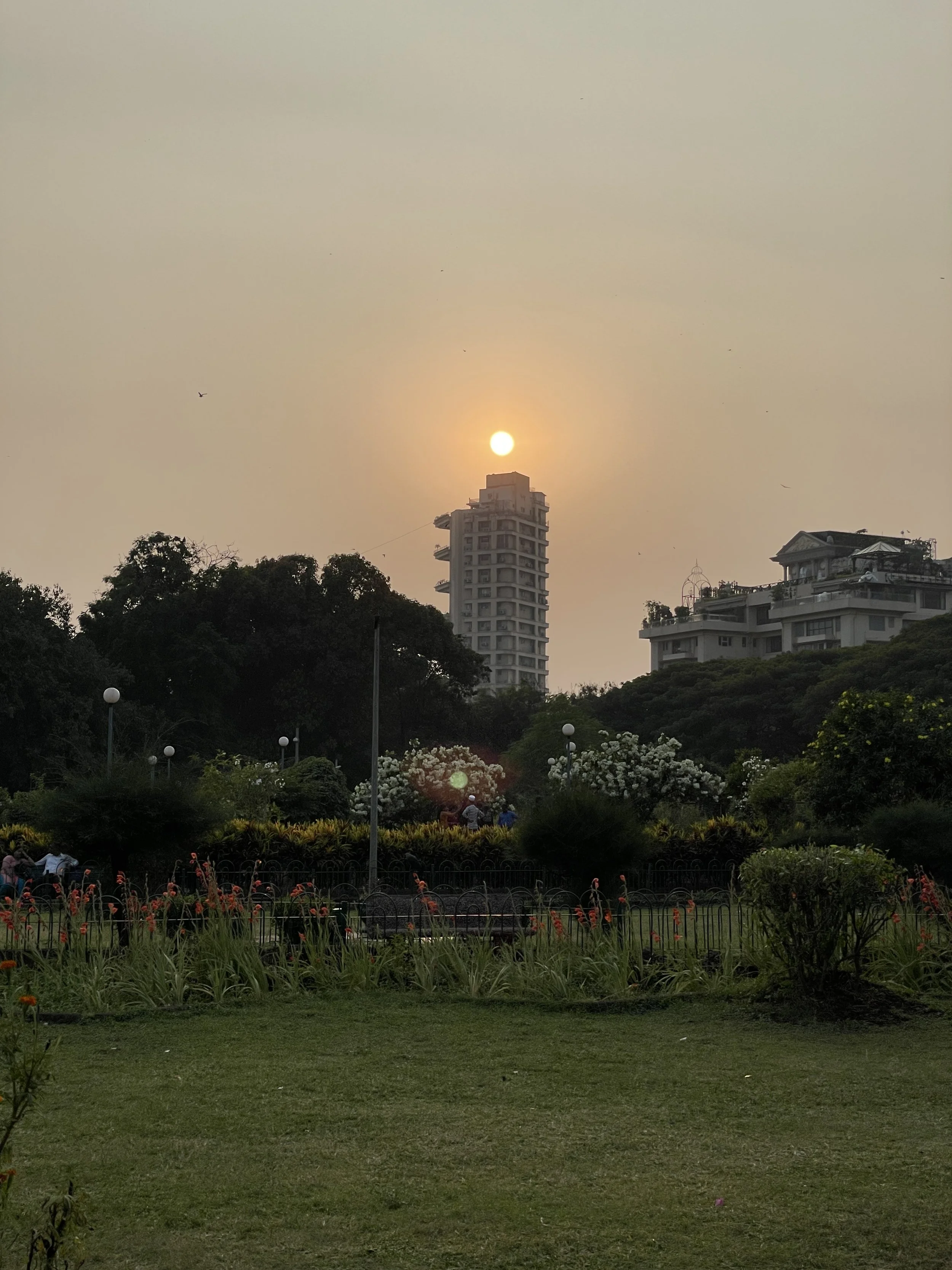 The Hanging Gardens of Mumbai, at the top of Malabar Hill, is a lush green oasis offering a welcome escape from the city's chaos. Built in 1881 over a reservoir that supplies drinking water to South Mumbai, these terraced gardens are known for their beautifully manicured hedges. Walking through the gardens, I found a peaceful retreat amid the city's relentless energy. Children played along the winding paths, and couples enjoyed quiet moments on shaded benches. We were a few hours from sunset, but the small orange sun hung low in the sky, fighting smog to wash the gardens in a warm hue.