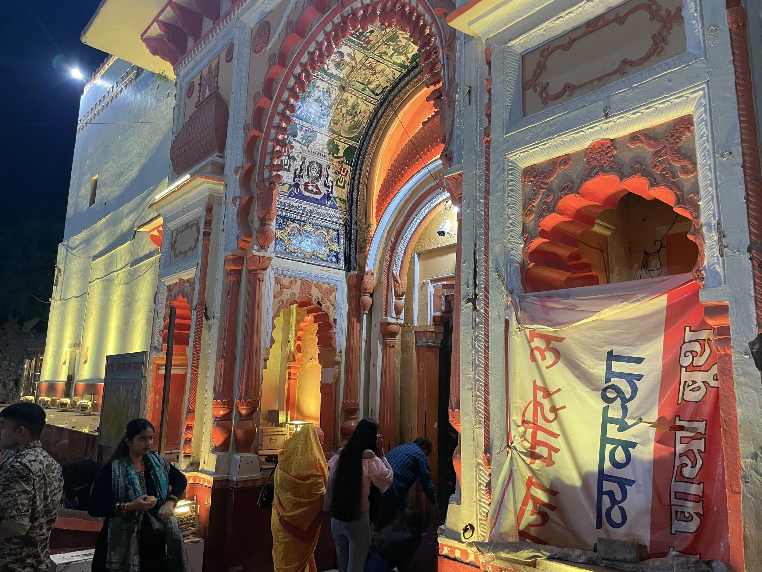 Later in the evening, once the sun had set, we had the incredible opportunity to visit Ram Raja Temple. Nestled in the heart of Orchha, the temple, dedicated to Lord Ram, stands as a unique blend of spiritual reverence and architectural beauty. It is is the only temple in India where Lord Ram is worshipped as a king, not just a deity. He is treated as the ruler of Orchha, complete with royal honours including a palace guard, a daily darbar (royal court), and ceremonial salutes by police officers.