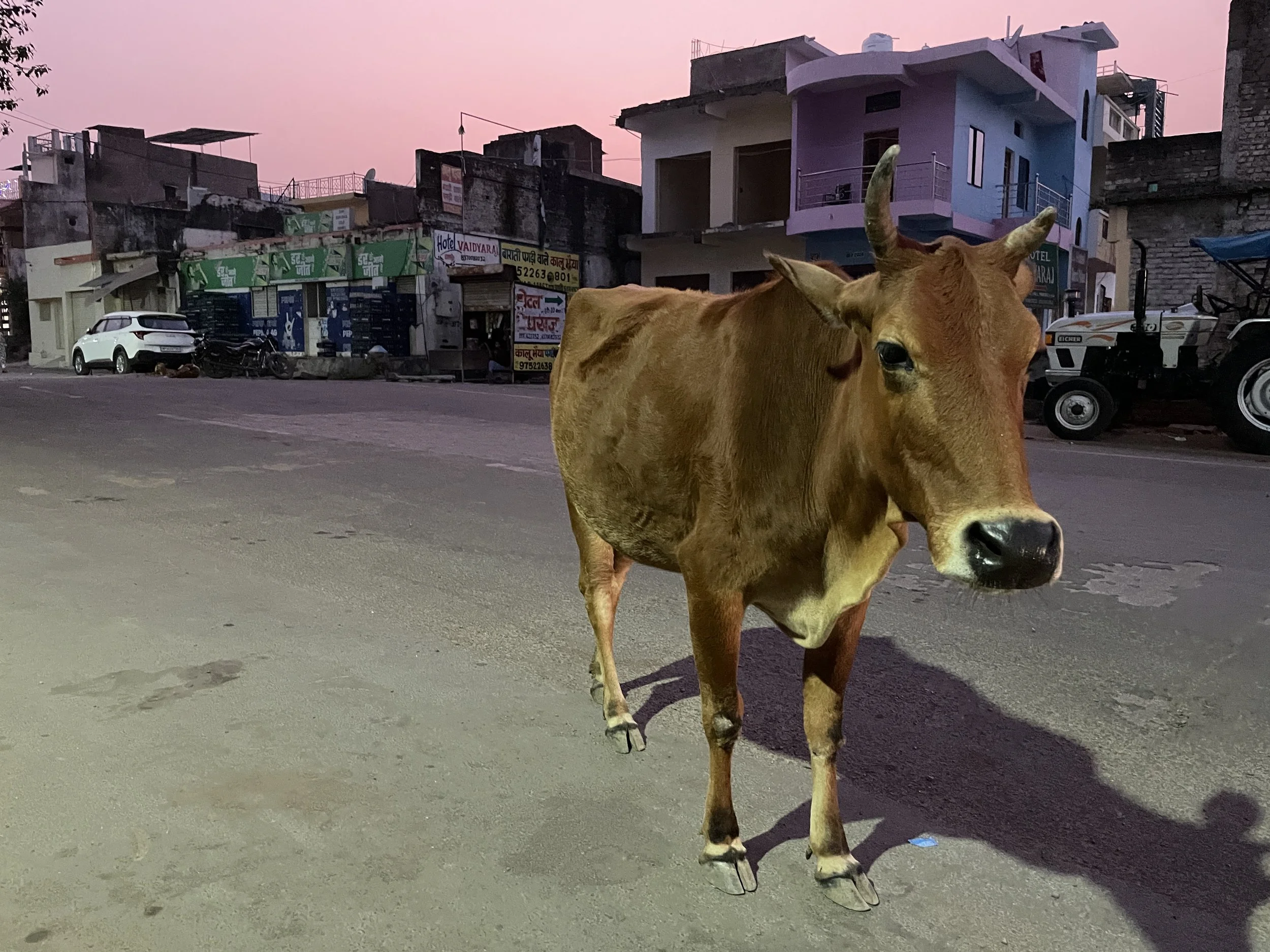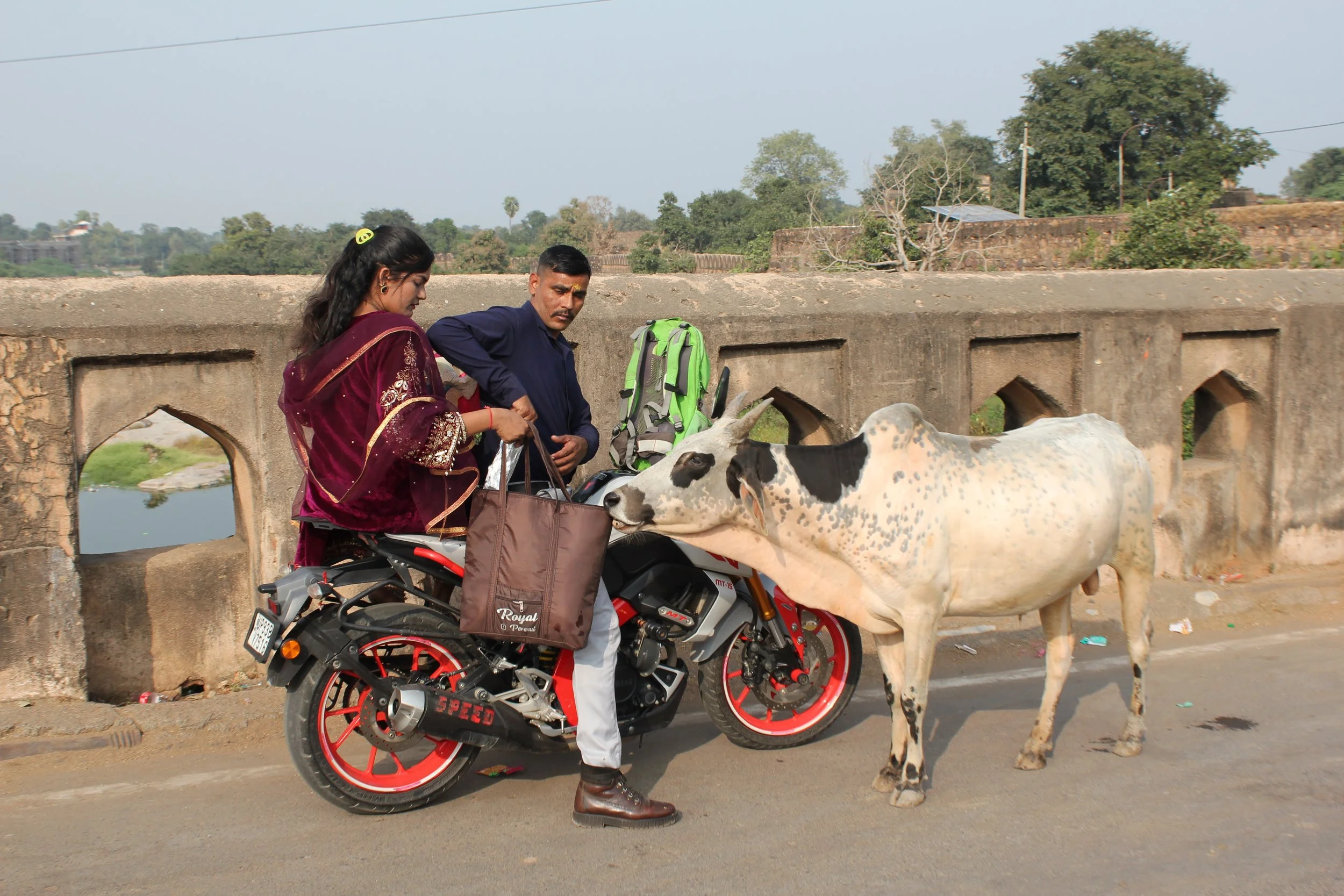 After a few hours, we arrived in Jhansi. The quiet of the countryside gave way to a city alive with noise and movement. We jumped into tuk-tuks to make our way out of the city, and were immediately met by flooded roads, deep potholes, and cows blocking traffic with total indifference. Holding tight to the open sides of the vehicle, we zigzagged through the mess. As we got closer to Orchha, the roads began to level out. The smog started to thin, and sunlight finally broke through, casting a warm light over the landscape ahead.