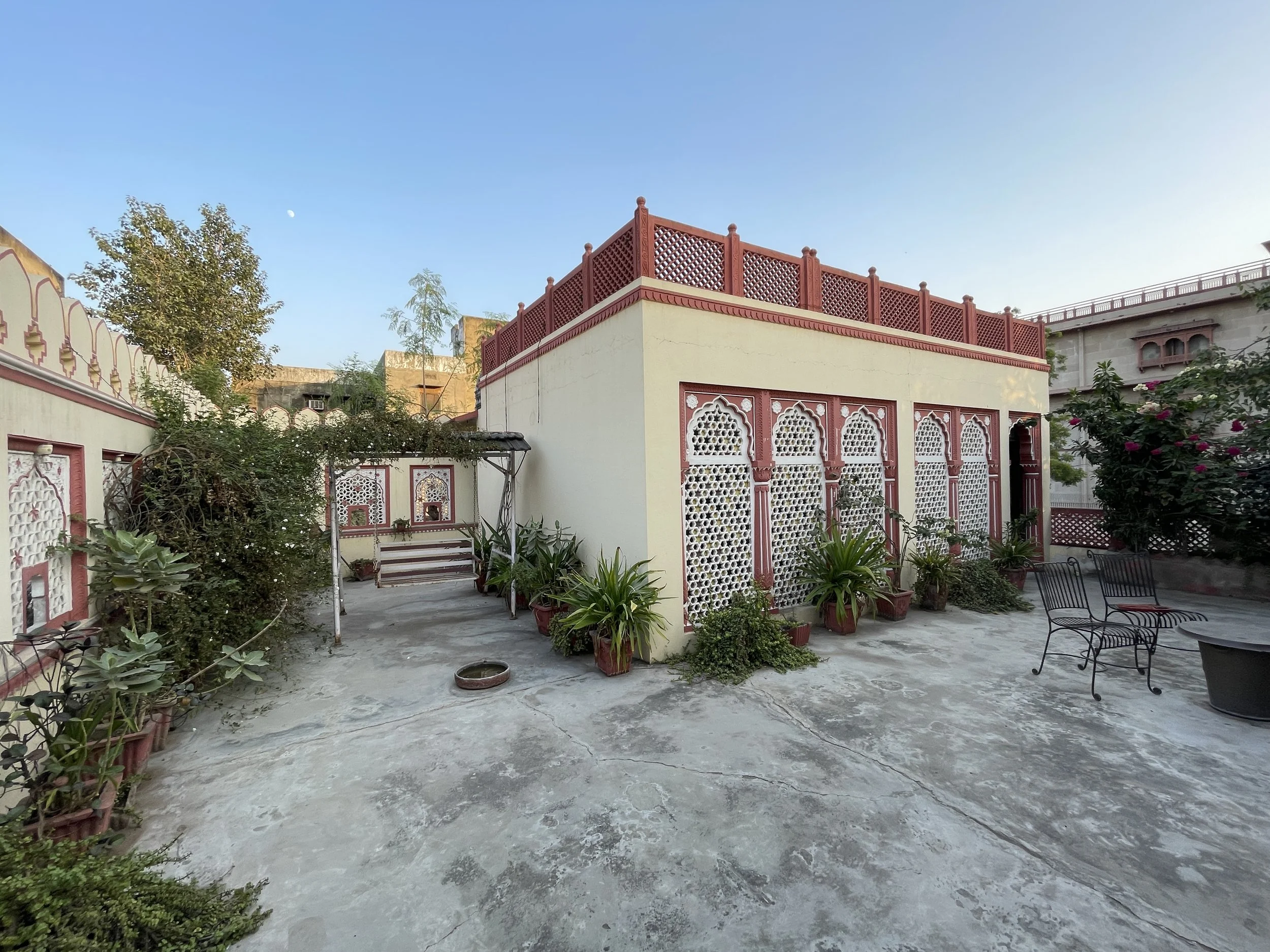 As we arrived at our hotel, the stained glass windows offered a glimpse of Mrignayani Palace, a 300-year-old residence once owned by the Prime Minister of Jaipur. It had since been seized and transformed into a hotel, preserving its historic charm. We were welcomed with a traditional bindi and a vibrant necklace of orange flowers, and a woman gently threw flowers on us as we went up the stairs.