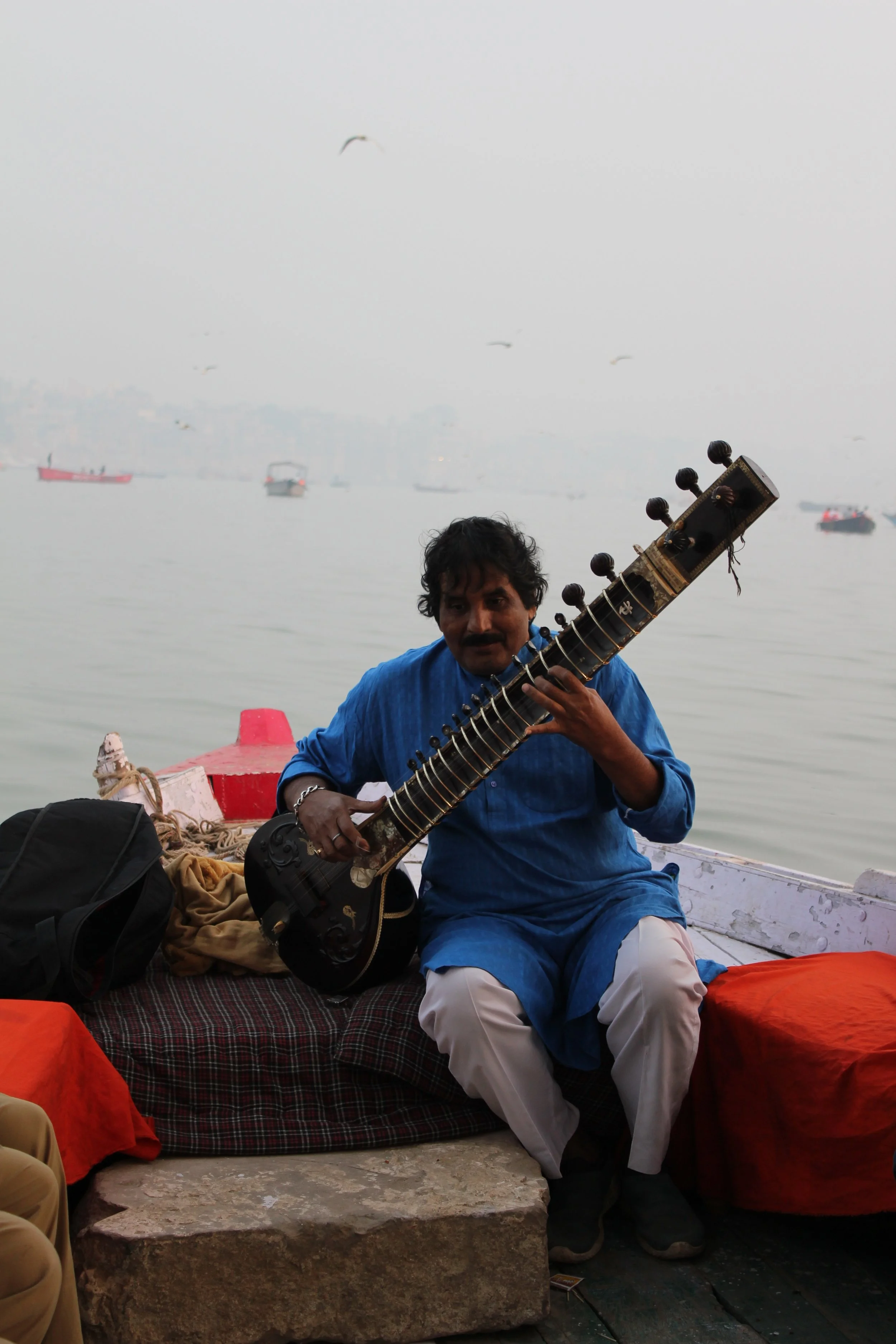 We then learned our guide had yet another surprise for us. We returned to the water in a boat lined with soft orange cushions, and at the front sat a smiling man with a sitar- a traditional Indian string instrument. The gentle rhythm of his music matched the movement of the boat as we glided slowly along the river, the golden daylight revealing layers of scenery we’d missed in the shadows the night before. Vibrant buildings lined the banks, birds darted over the water, and the quiet rhythm of local life unfolded around us. Away from the noise and chaos of Varanasi, floating on the slow-moving river with a cup of chai in hand, it was hard not to feel a sense of peace.