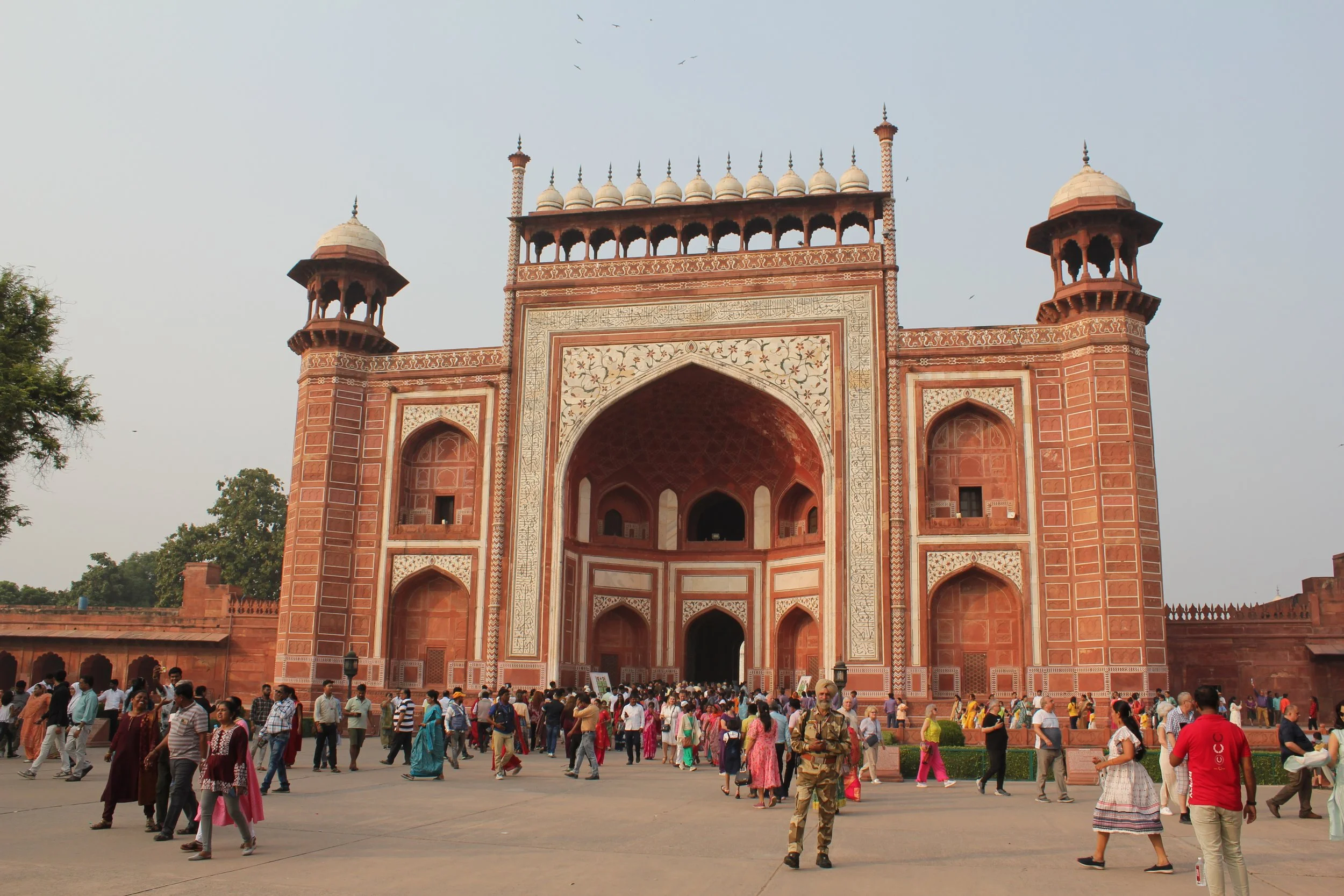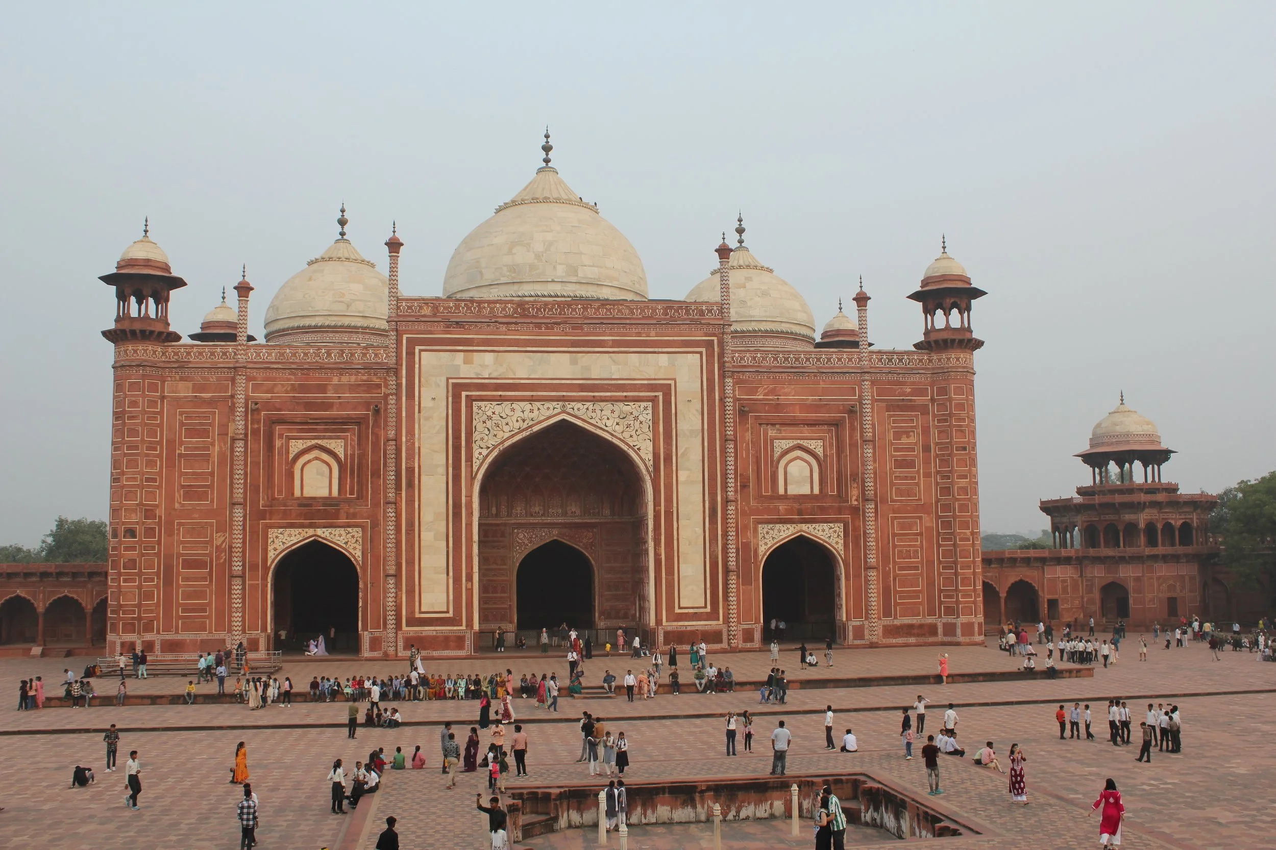 Before the the Taj Mahal reveals itself, visitors first pass through the Jilaukhana, or Forecourt; a grand, walled enclosure that once served as a ceremonial gathering space. The sandstone walls rise high on all sides, creating a sense of both grandeur and anticipation. Lush gardens and pathways line the interior, framed by rows of elegant arched chambers that once housed shops and resting areas for travellers and pilgrims. At the far end stands the imposing Great Gate (Darwaza-i-Rauza), its towering facade of red sandstone inlaid with white marble calligraphy.