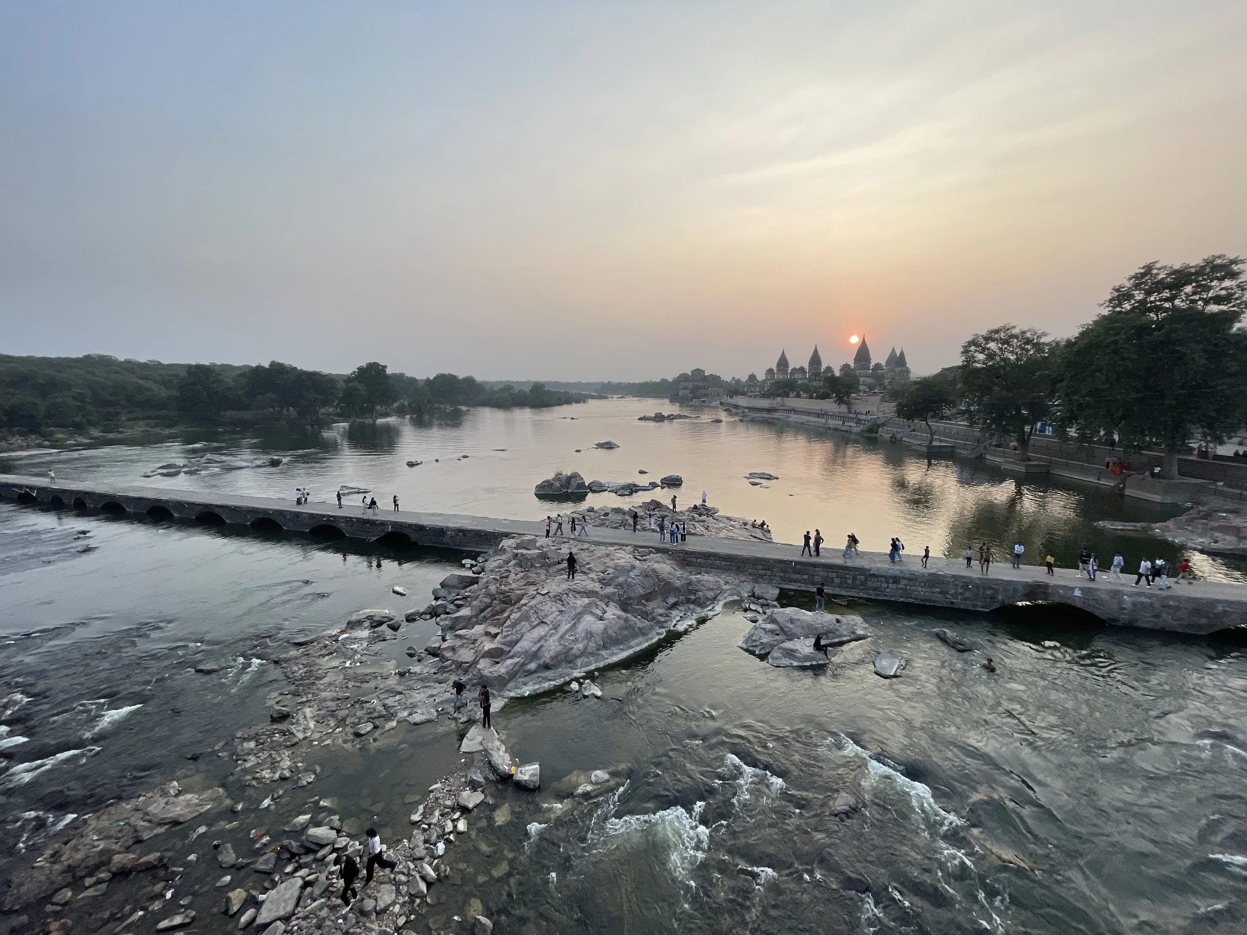Nearby, the Betwa Nadi Bridge offered an incredible view of the cenotaphs at sunset. The sky turned a fiery red, silhouetting the monuments. Below, teens swam and played in the river’s rapids, happily waving up at us and smiling for photos. On the bridge itself, cows nonchalantly blocked traffic, while large herds of goats ambled across, as if they were the ones in charge.
