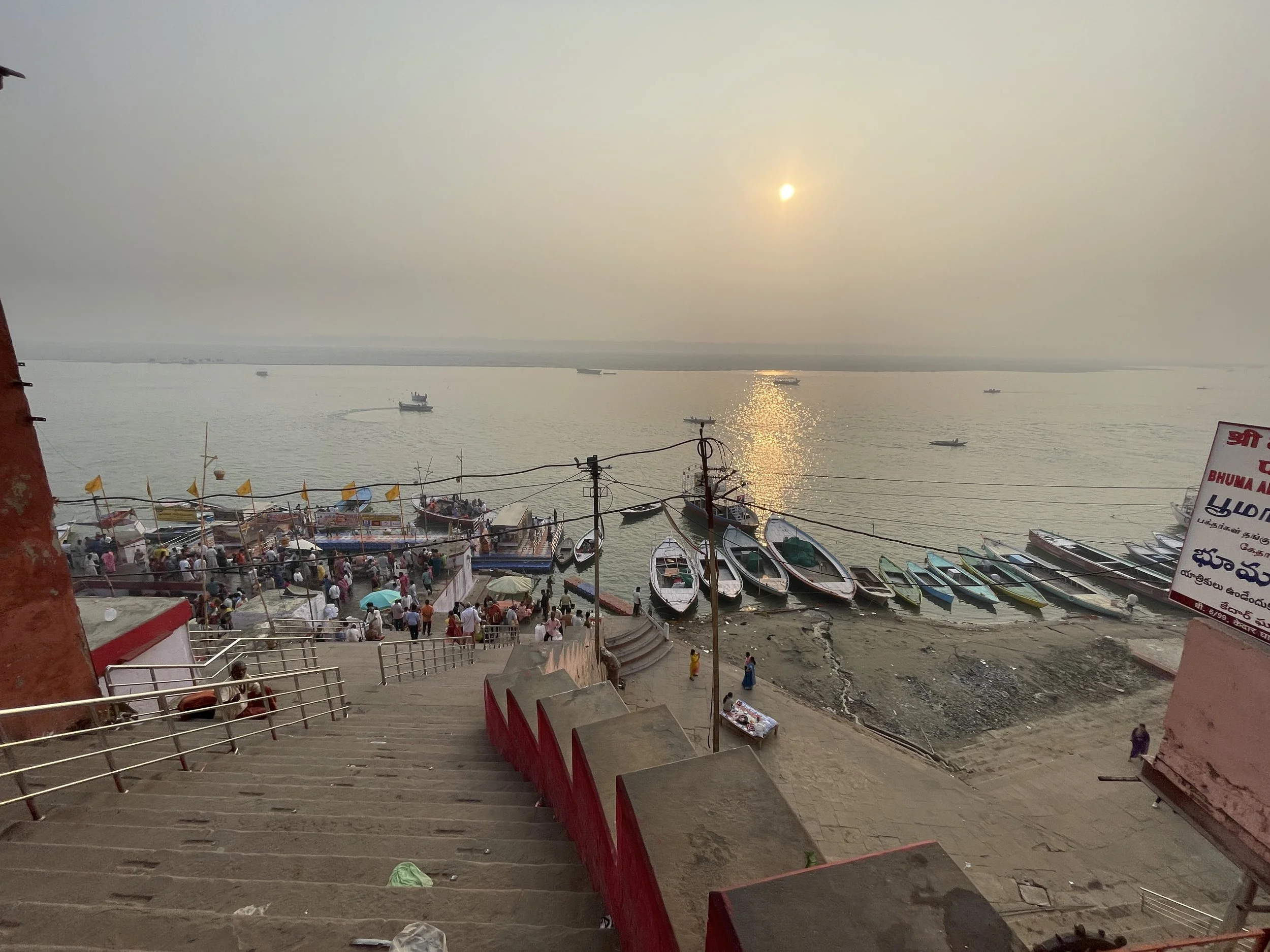 Built during the Mughal era by Emperor Aurangzeb in 1669, it stands on the site of a destroyed Hindu temple. It was completely empty when we arrived apart from a few caretakers, but we were instructed to remove our shoes and climb another incredibly steep stone staircase to the rooftop. Before ascending, however, the courtyard of the mosque provided my first glimpse of the Ganges river. Wide, calm, and hazy in the evening light; it looked almost etherial.