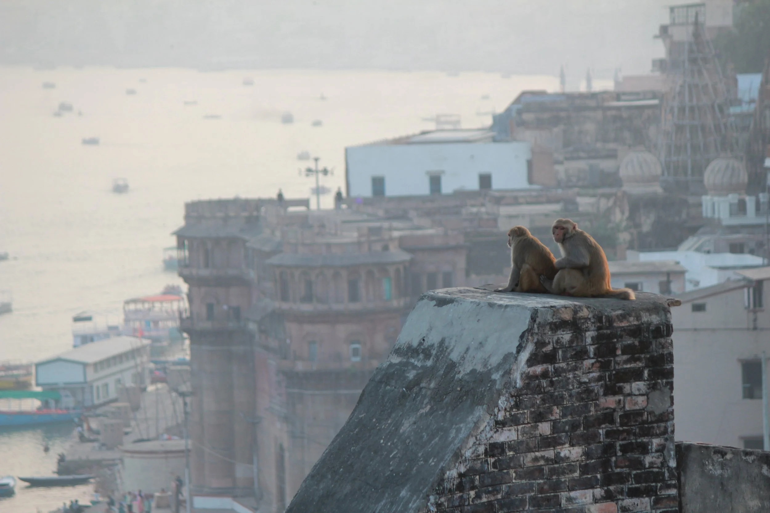 Climbing the stairs, the views of the Ganges only became more dramatic. From its elevated position the views of the are sweeping; you can see boats drifting slowly along the water, people bathing on the distant steps and the chaotic sprawl of Varanasi climbing up from the riverbanks. The contrast is striking: calm, endless water in front of you, and the dense, noisy city just behind it. On nearby rooftops monkeys darted across ledges and low walls, snatching fruit and occasionally pausing to take in the view. They seemed at ease in this chaotic landscape, just as much a part of the city as the people below.