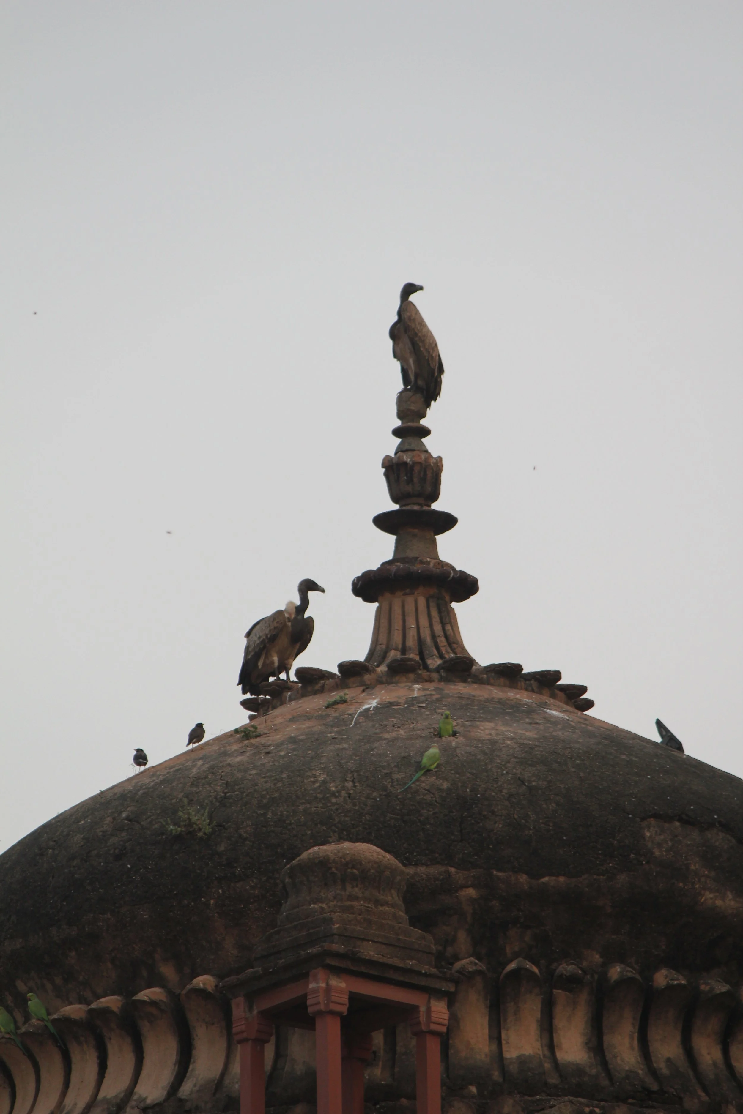 Later in the day, we drove down to the Royal Chhatris, Orchha’s riverside cenotaphs built in memory of its past rulers. Set against the backdrop of the Betwa River as the sun hung low in the sky, locals were resting in the shade, kids were playing nearby, and wildlife was peacefully coexisting. Perched on the highest points of the Chhatris were dozens of vultures, wings outstretched or hunched in the heat. At first glance, they almost looked like part of the stonework—still and weathered—but every so often, one would take flight, circling silently overhead. Their presence added an eerie, surreal feeling to completely quiet park.