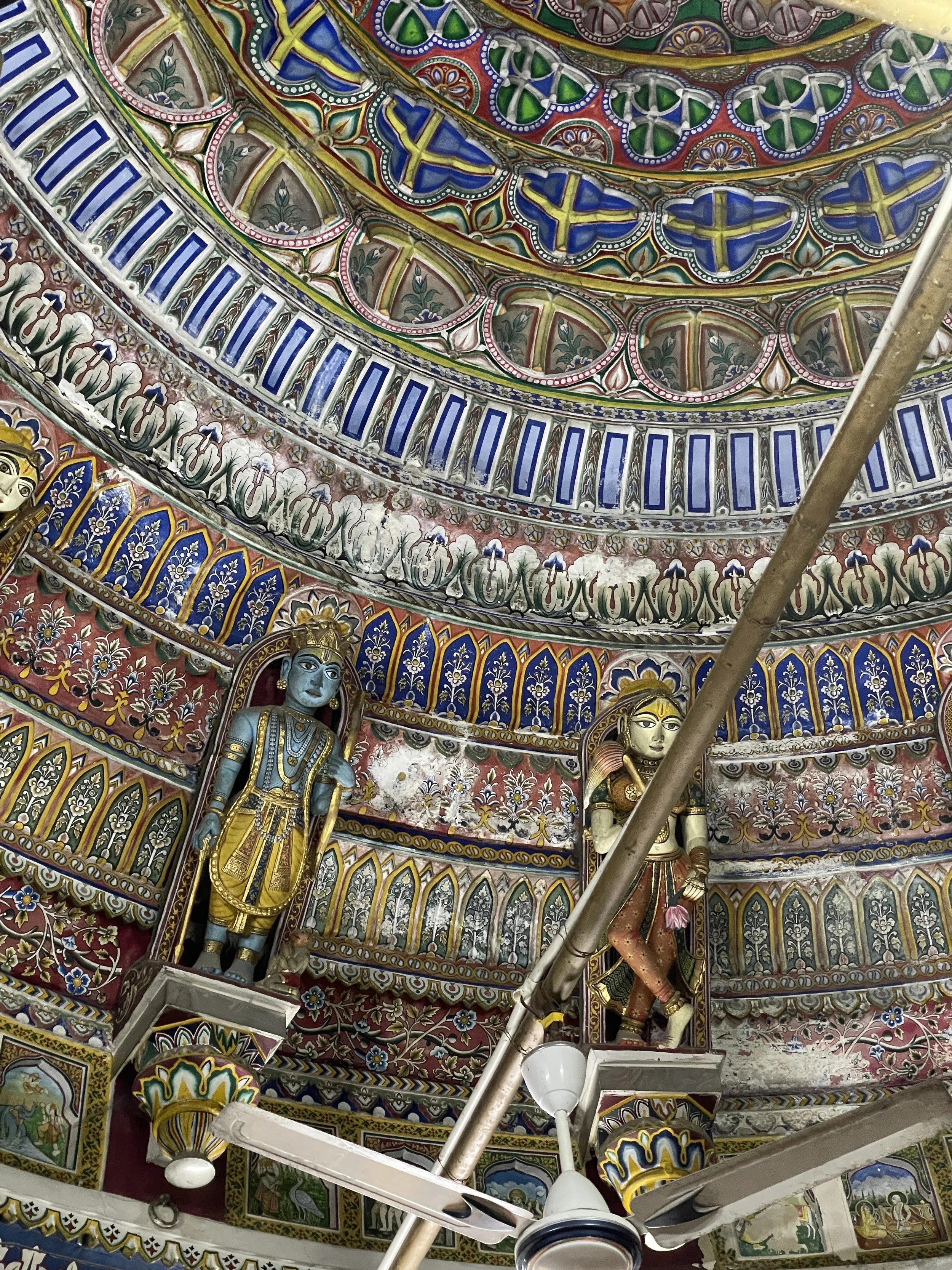Walking up a set of worn stone stairs, we were warmly invited inside and welcomed to view the intricately carved shrines and the lively street bustling below. A Hindu holy man sat near the entrance, playing a harmonium; the soft music and his gentle singing floated through the otherwise hushed temple. Above us, the domed ceiling of the temple bloomed into cascading layers of intricate colour and detail. The curved walls were lined with vibrant frescoes and carved alcoves, each containing beautifully painted statues of Rama and Sita. Surrounding them, bands of intricate floral designs, arches, and geometric patterns wrapped the dome in layers of red, blue, green, and gold.