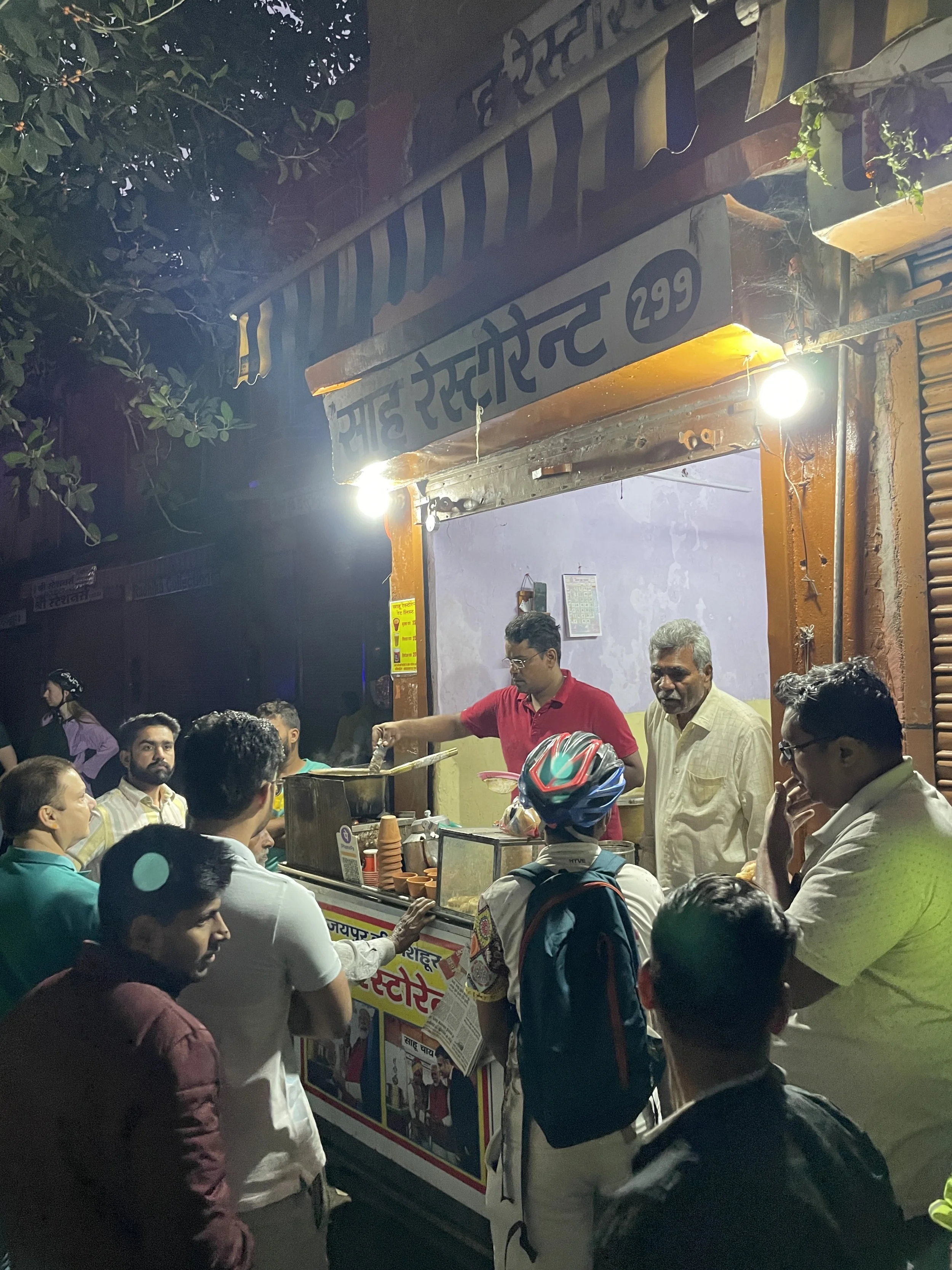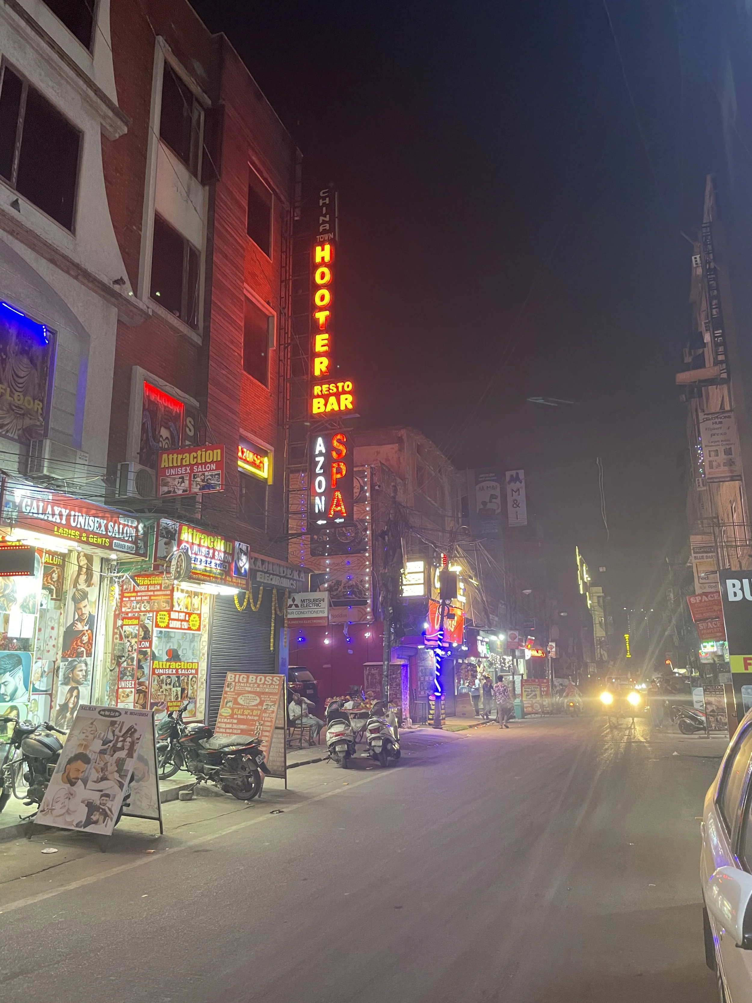 Even late at night, the streets were alive. Crowded, noisy, and almost overwhelming. The air was thick with the scent of spices and grilled meat, as vendors lined the sidewalks under flickering lights, shouting out deals and calling us over to try their street food. We had to weave through waves of people, tuk-tuks, and roadside stalls, sometimes shoulder to shoulder, almost always stepping off the curb just to keep moving. There’s a layer of dust on everything, the sound of horns and shouts never quite fades, and the smell is a mix of diesel, incense, and fried snacks. It’s chaotic, overwhelming, and was very much a preview of the chaos of India. It was the kind of energy that hits you all at once and leaves you buzzing, even after you make it back to the calm of your hotel room (or maybe the buzz was from the Kingfisher beer? Probably, actually).