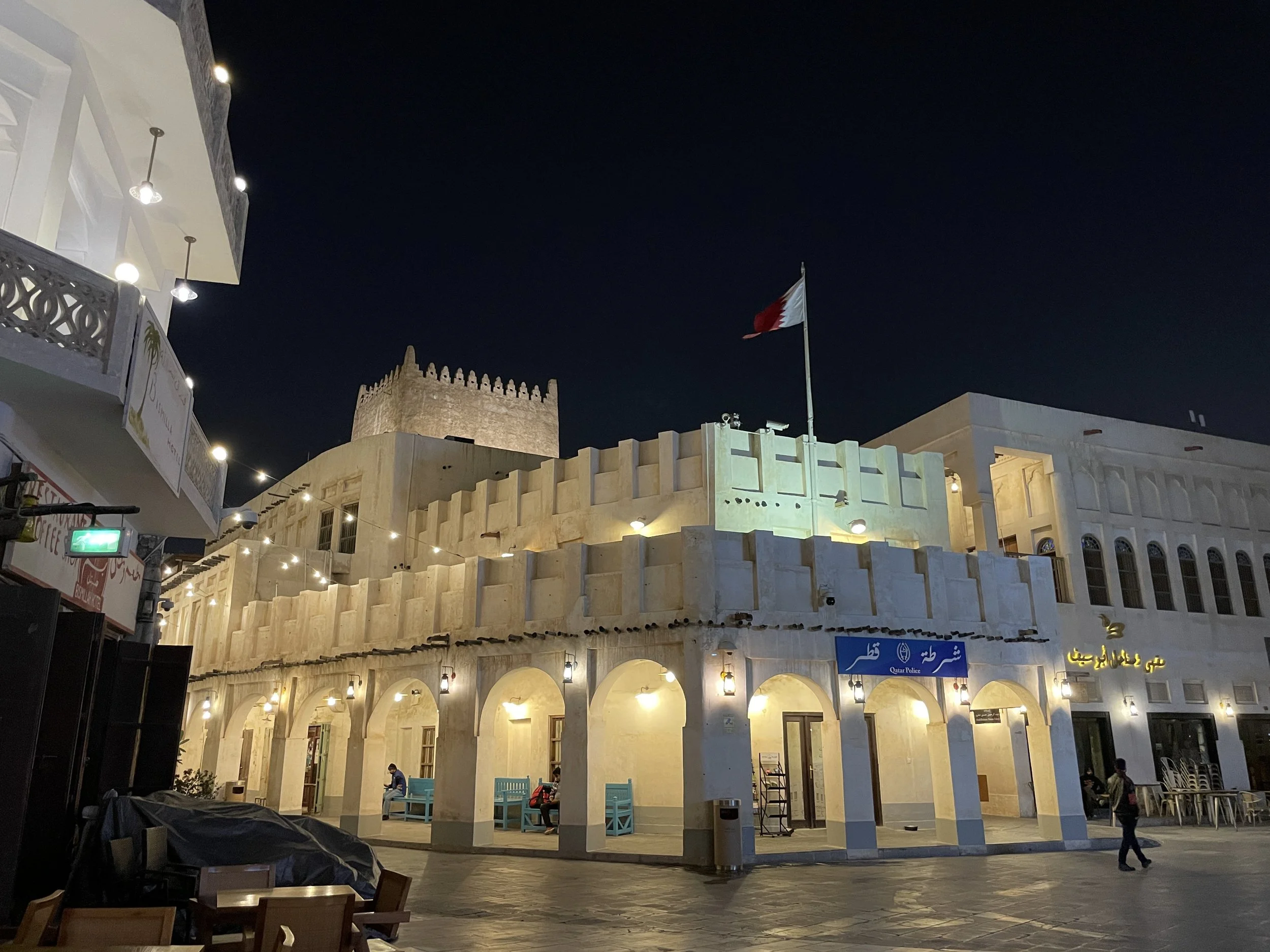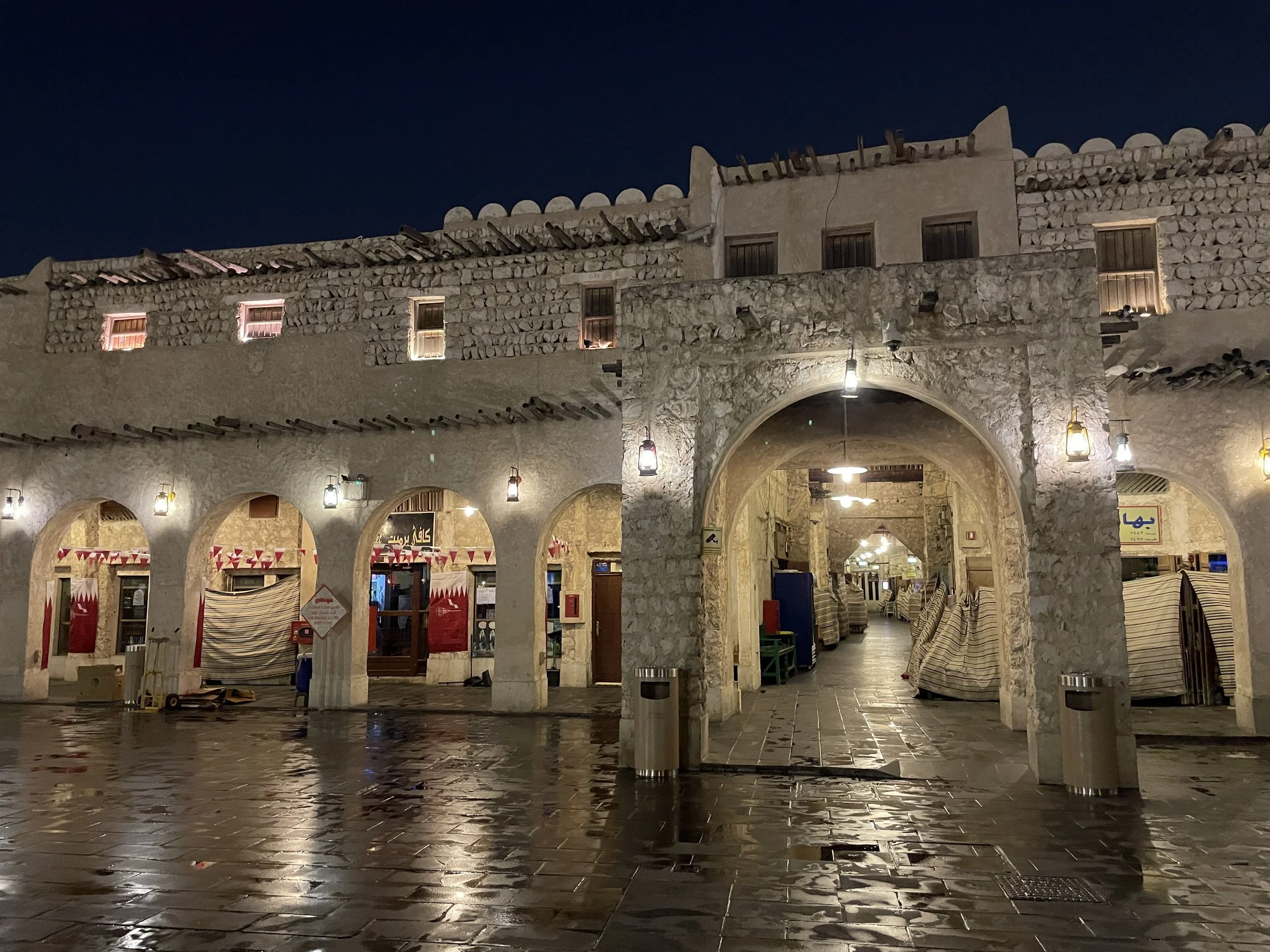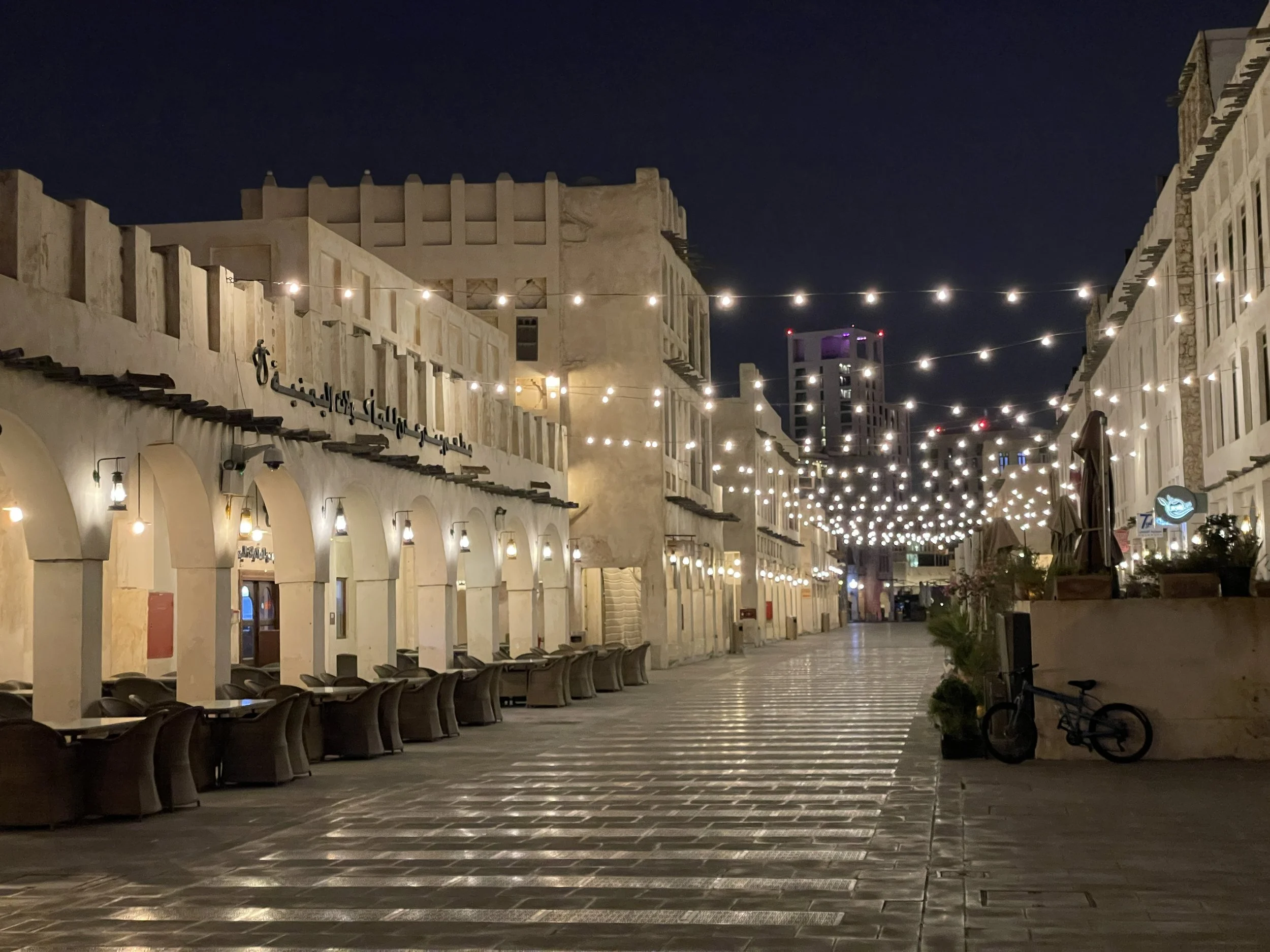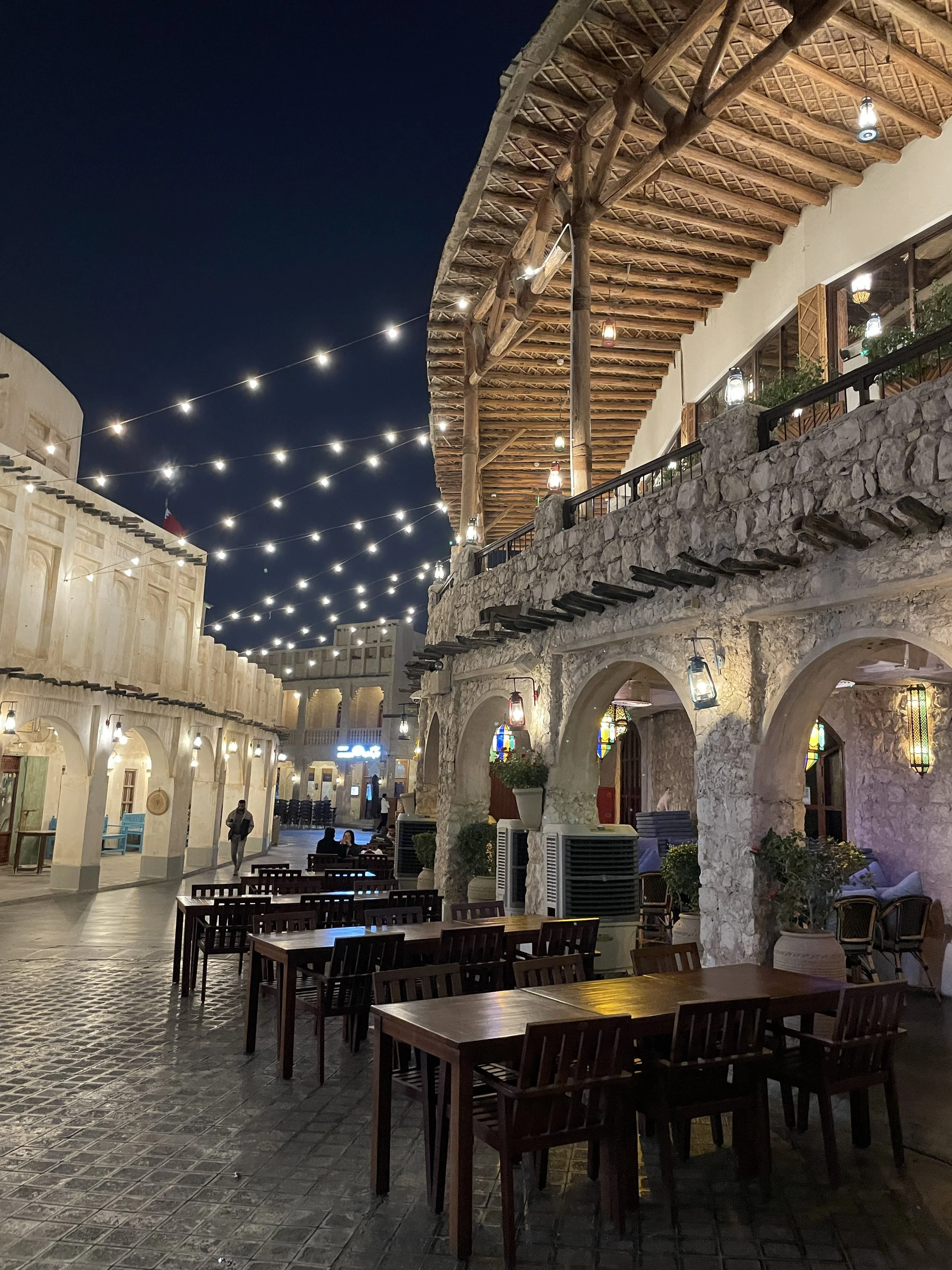 Just beyond it, across the bay, the Doha skyline rose. Sleek, modern towers lit in neon blues, purples, and golds. The water was still, reflecting the city lights almost perfectly. I stood there for a few minutes, taking it all in: the contrast between old and new, the stillness of the night, the surreal feeling of being somewhere so far from where I’d started the day. Memorable view, check.