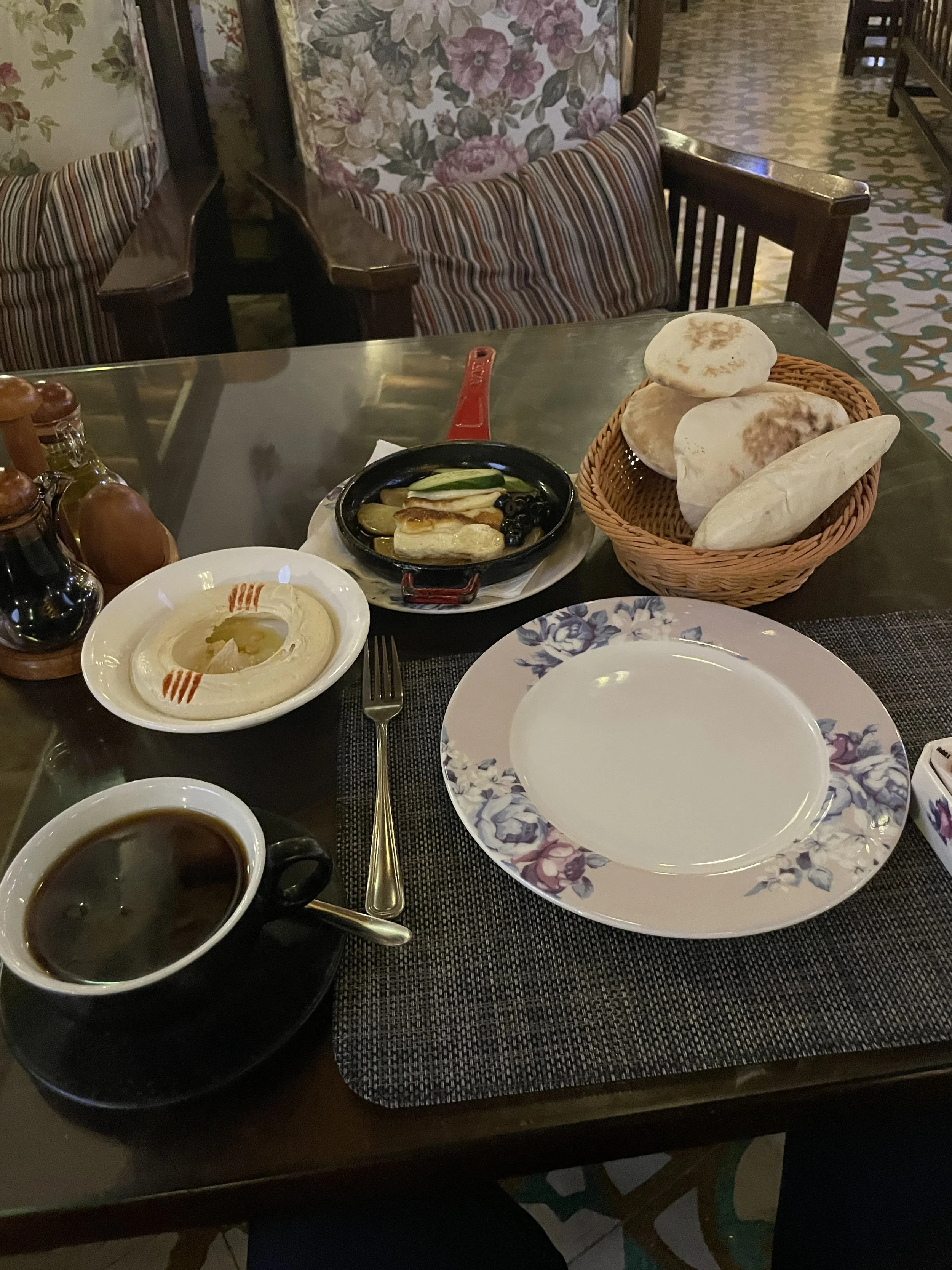 I ordered a plate of hummus with warm pita, some grilled halloumi, a cup of mint tea and some shisha; partly to relax, partly just to take in the full experience of being there.