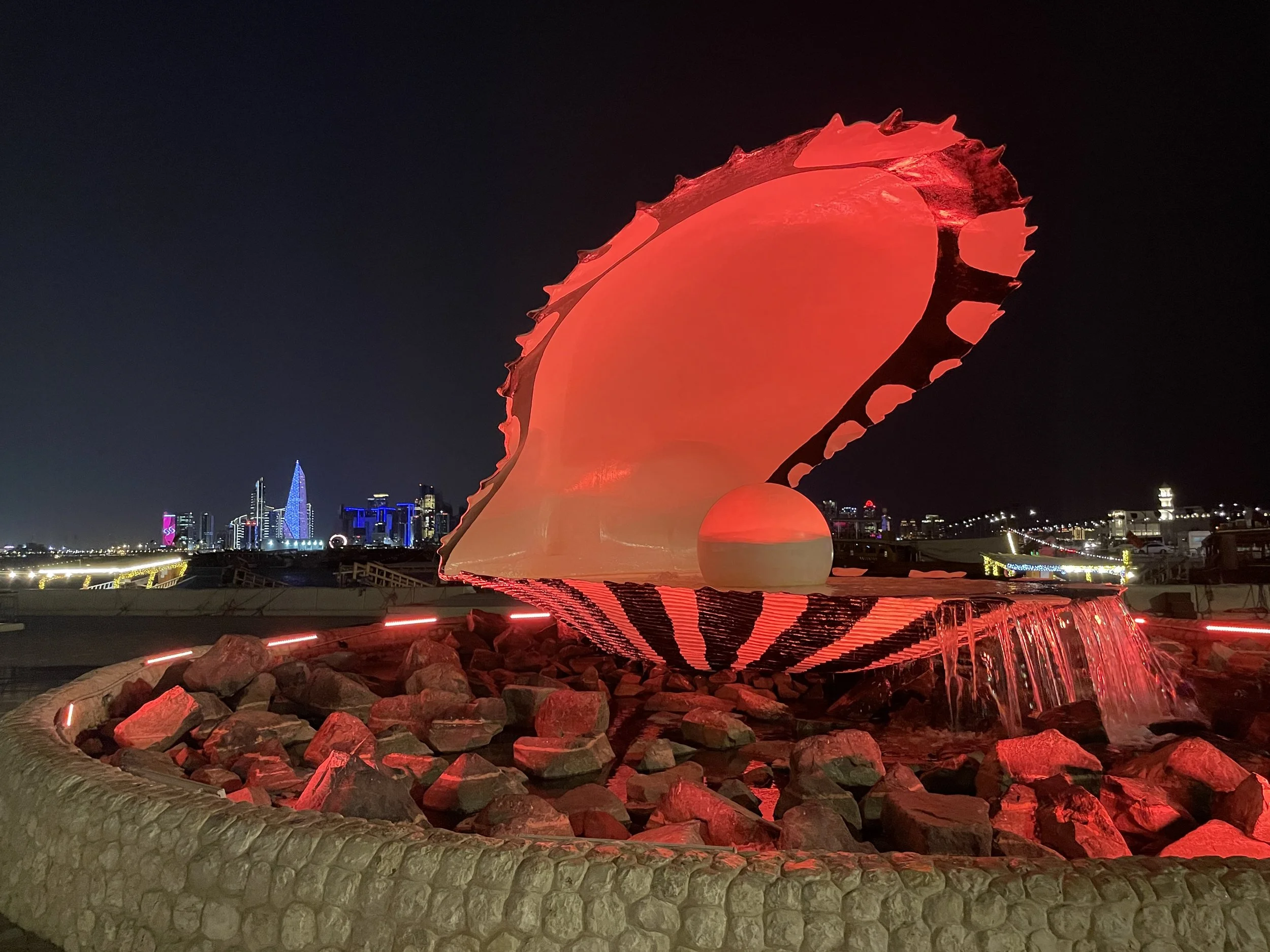 When I emerged on the other side, I found myself at the Corniche, Qatar’s famous waterfront promenade, right beside the giant oyster and pearl monument. The sculpture sat glowing under floodlights, a symbol of Qatar’s pearl diving past (before oil, before skyscrapers, when the country’s economy was built on the sea).