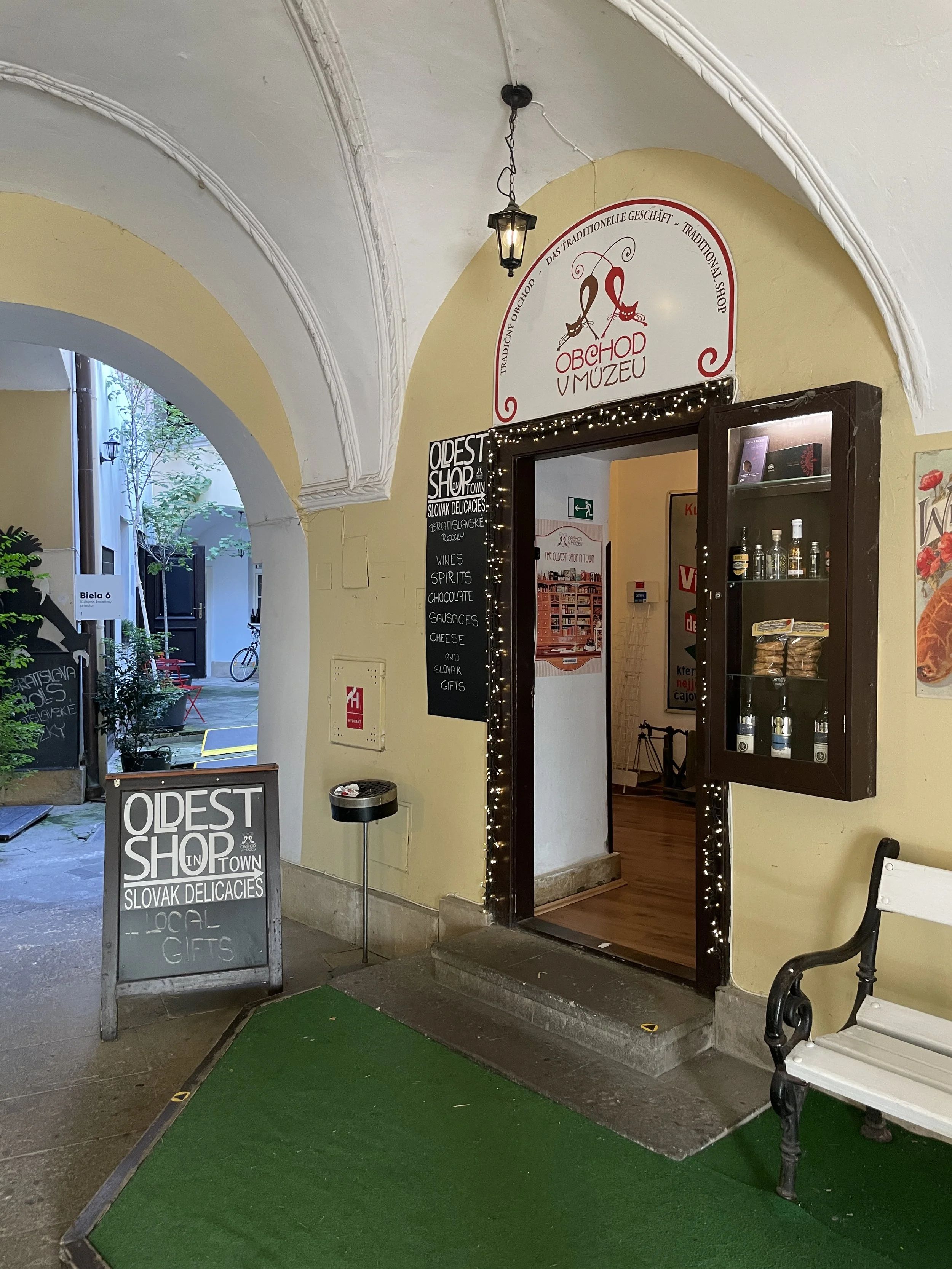From the square, we wandered into Bratislava’s Old Town, a compact maze of cobblestone streets lined with soft-colored buildings, cozy cafés and small boutique shops. The atmosphere was relaxed, almost storybook-like. Along the way, we stopped at Bratislava’s oldest shop, a tiny storefront that has been selling local goods for centuries, a living reminder of the city’s mercantile past.