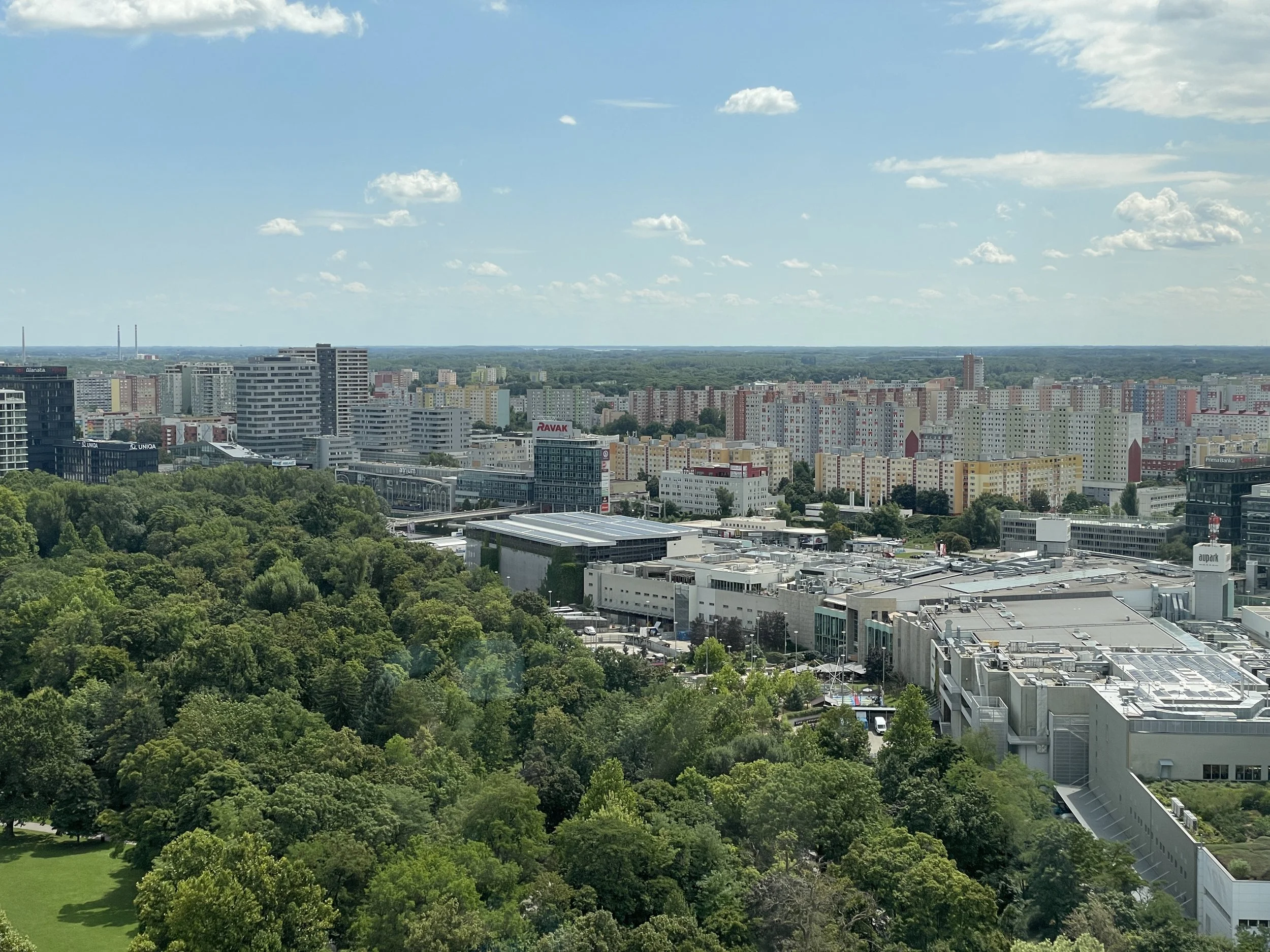 Riding the elevator to the top, we stepped into the observation deck and were immediately rewarded with 360-degree views of Bratislava. From above, the city’s layers became clear: the red-tiled roofs of Old Town, the winding Danube, and the hilltop castle, all juxtaposed against the more austere Soviet-era apartment blocks and office buildings that stretch across the newer parts of the city. The contrast was striking. Bratislava is a city where centuries of medieval, imperial, and modernist planning coexist in a single panorama. We stayed up there for quite some time, taking in the view.
