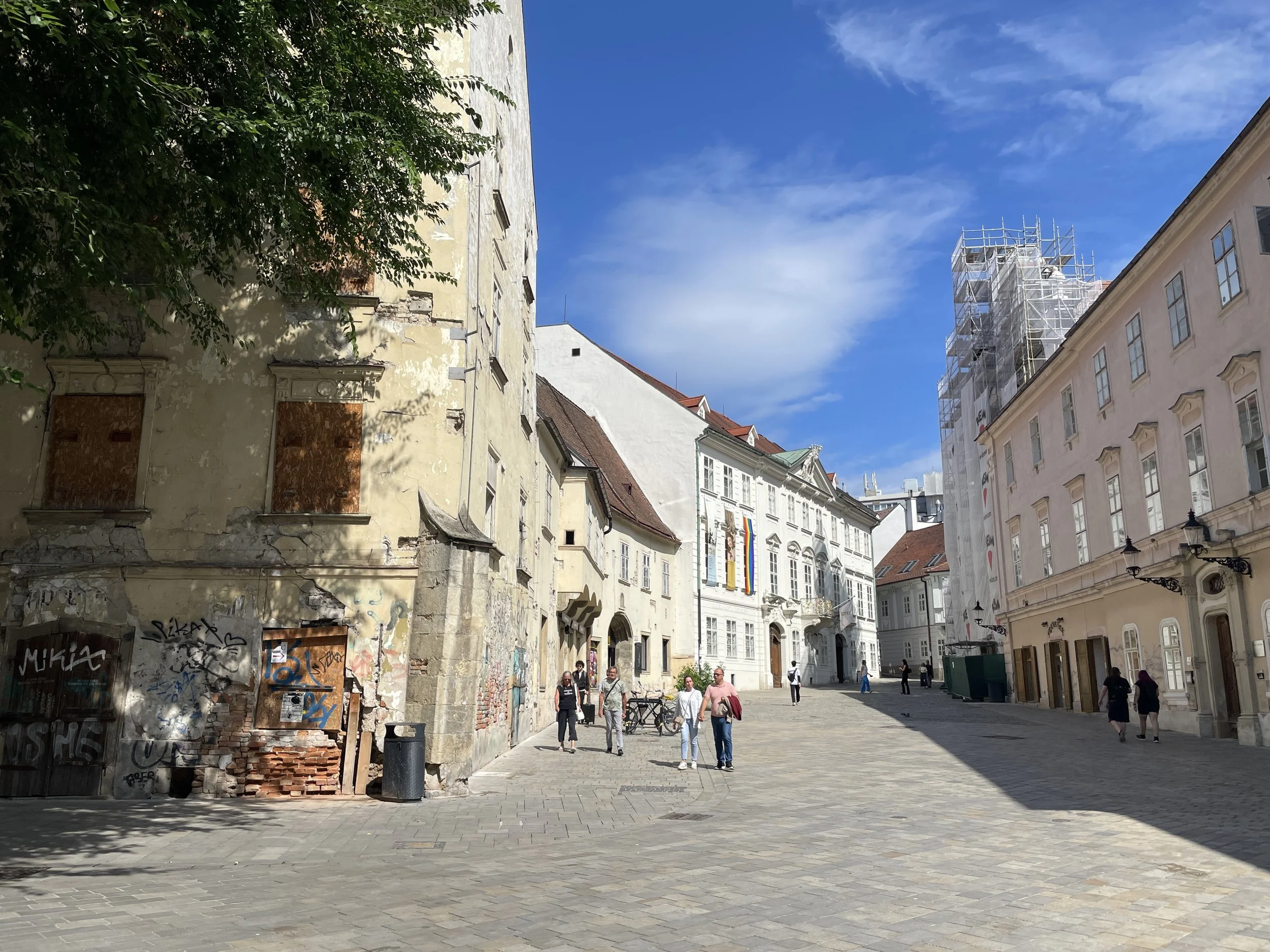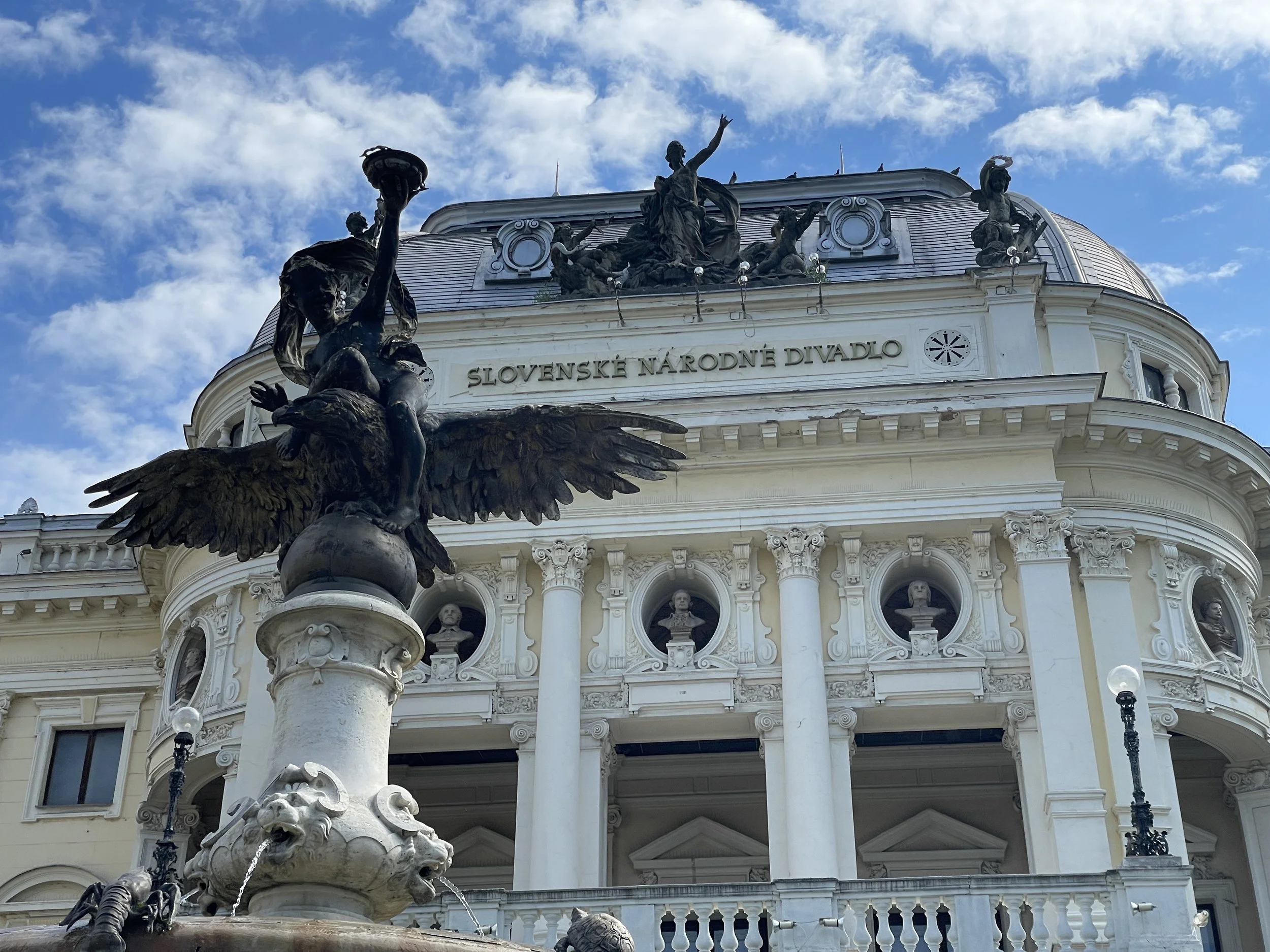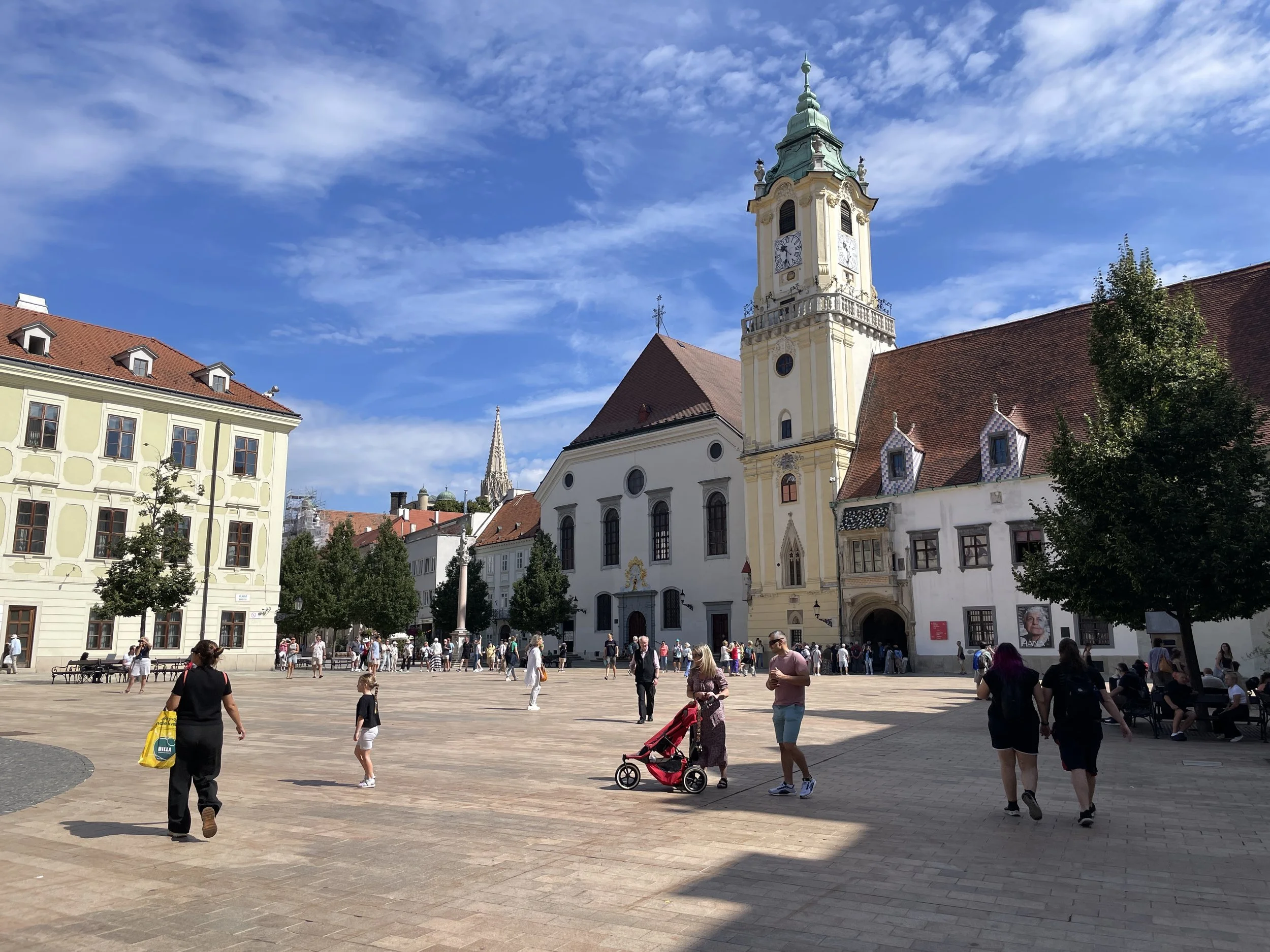 After stashing our bags in a self-service luggage locker, we headed straight into town and eventually found ourselves at Hviezdoslav Square. The streets felt different from other European cities we’d visited: calm, almost sleepy, with just a handful of tourists wandering around. There was a sense of quiet charm to the city, a subtle contrast to the bustling squares and grand avenues of Vienna. Cobblestones, pastel façades, and historic details gave the impression that Bratislava had preserved a more intimate, lived-in character.